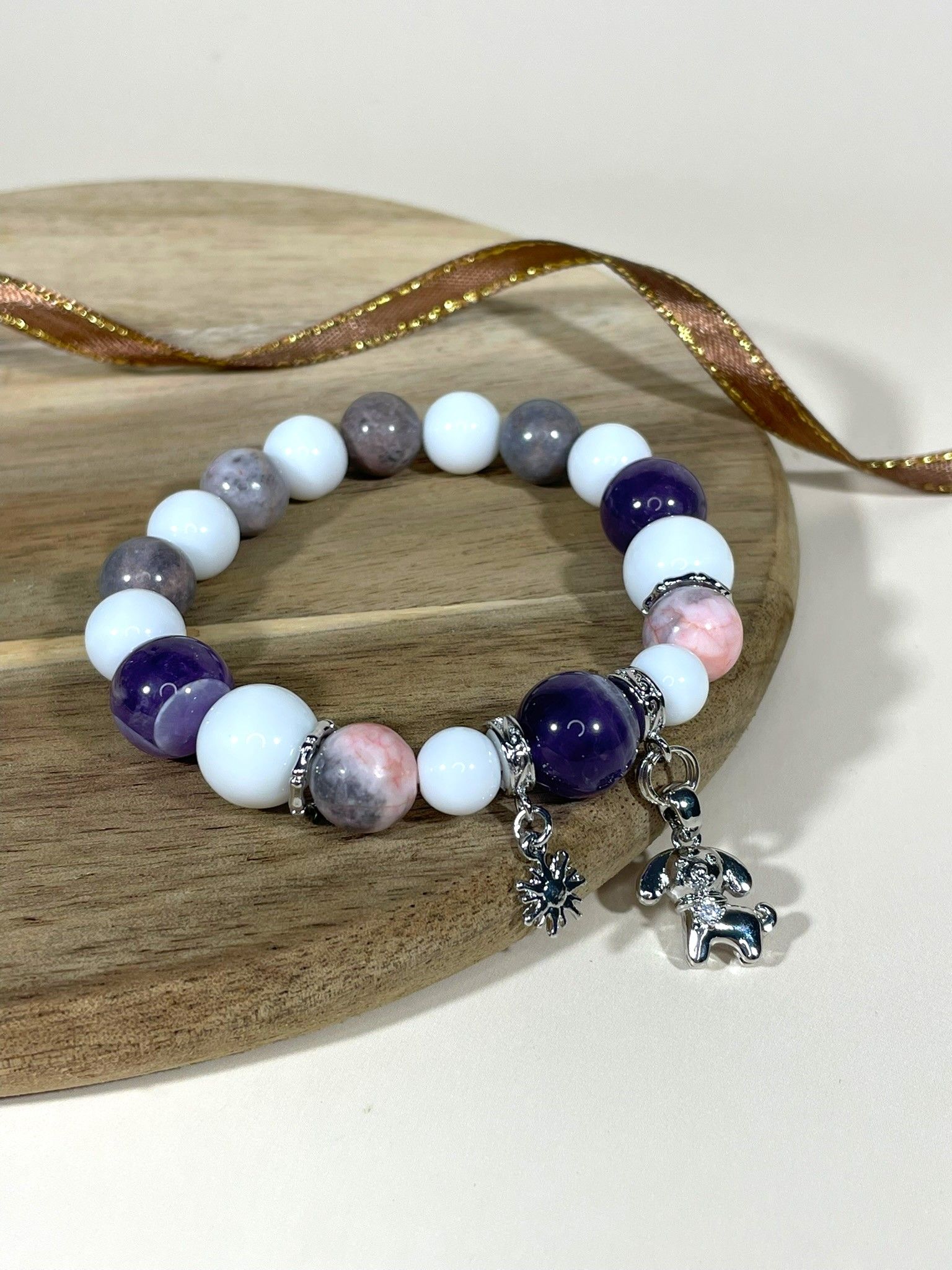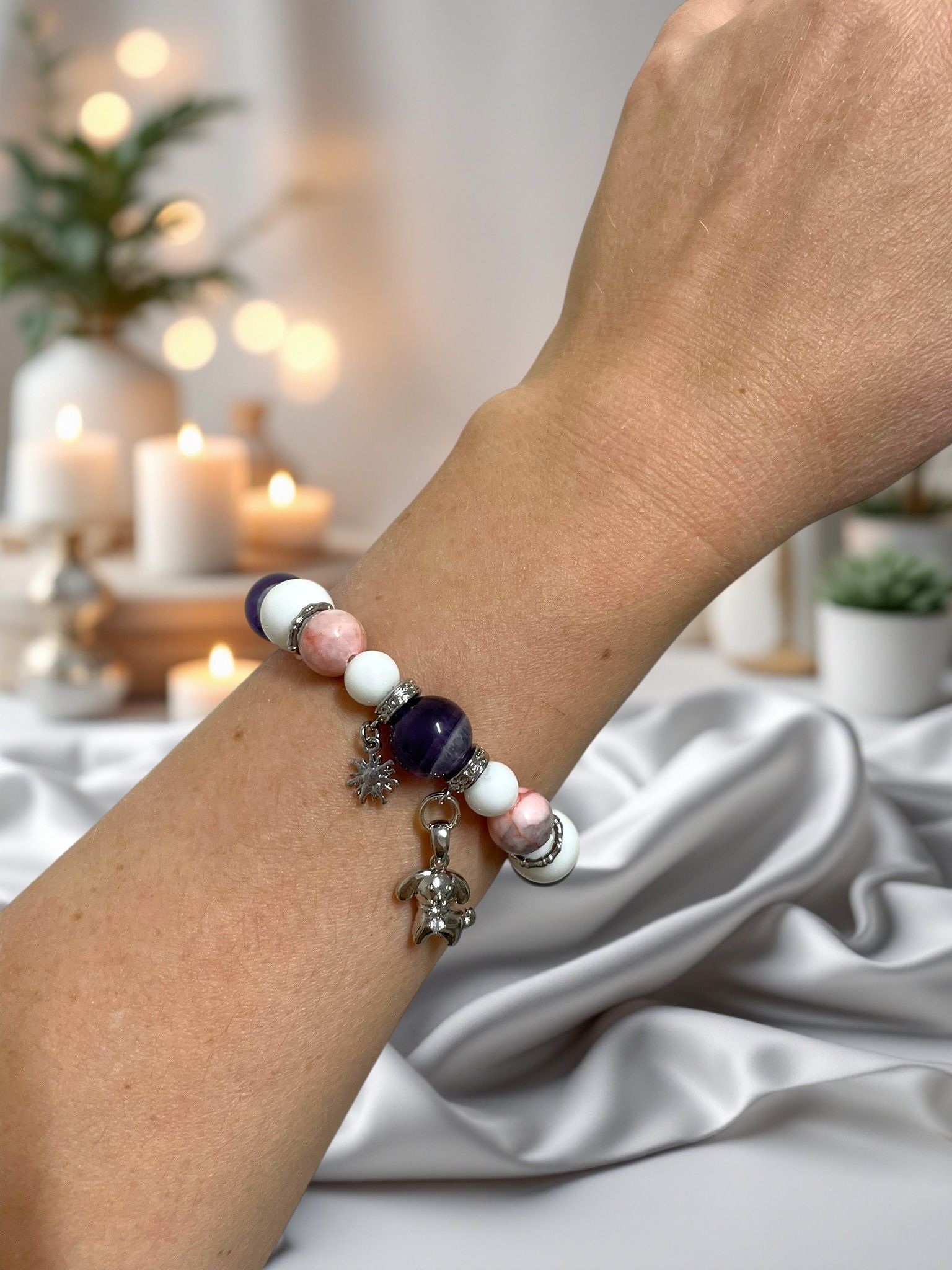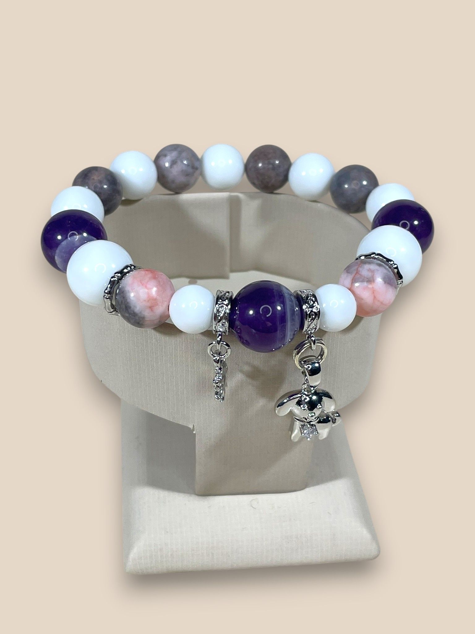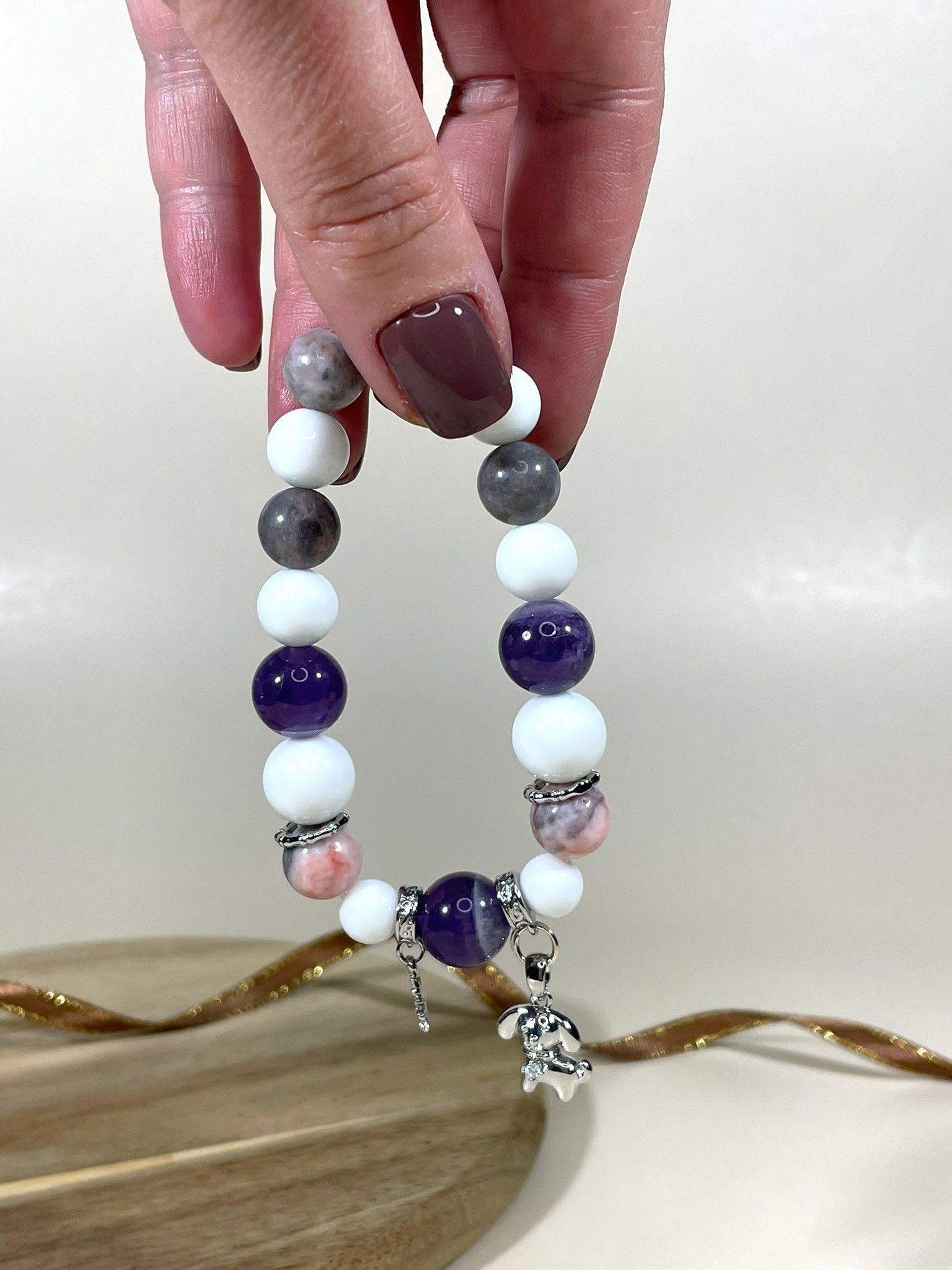 - Камни: изысканное сочетание белого агата, яшмы с розовыми и серыми оттенками, а также насыщенного сиреневого аметиста.