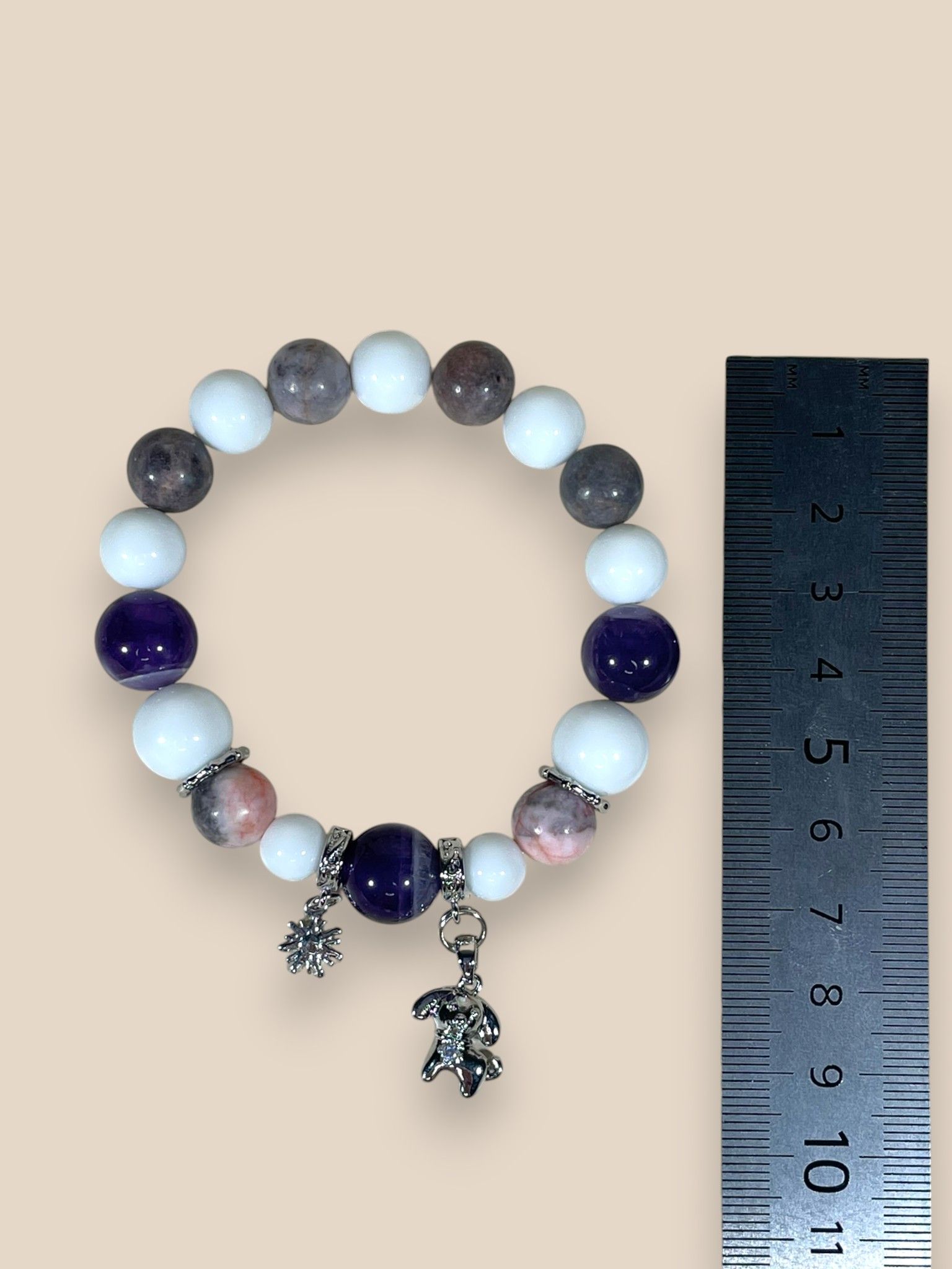 - Основа: эластичная резинка — браслет легко надевается и снимается.
