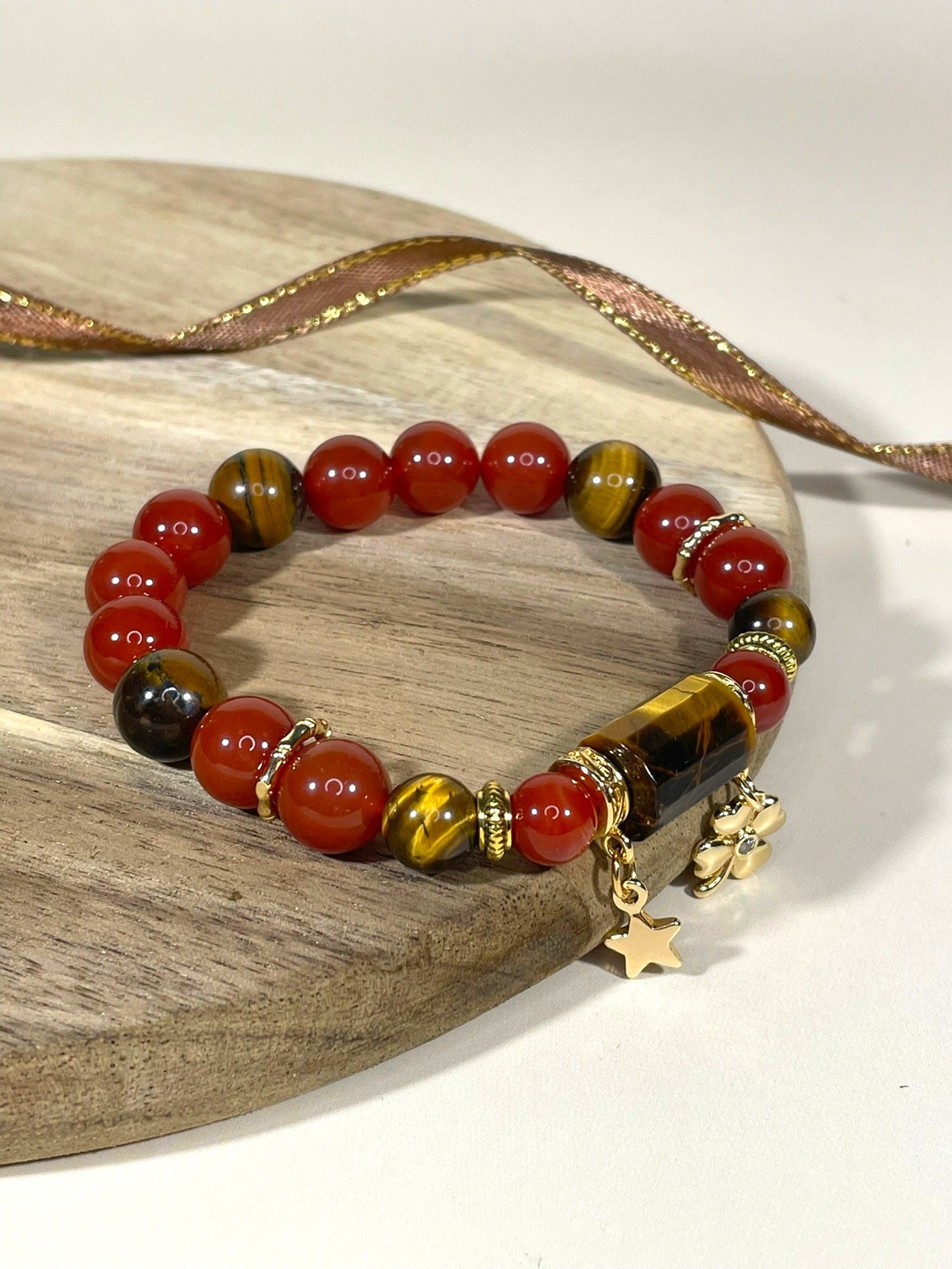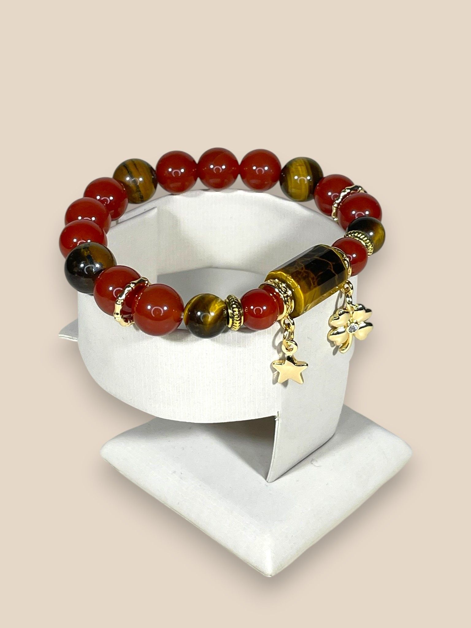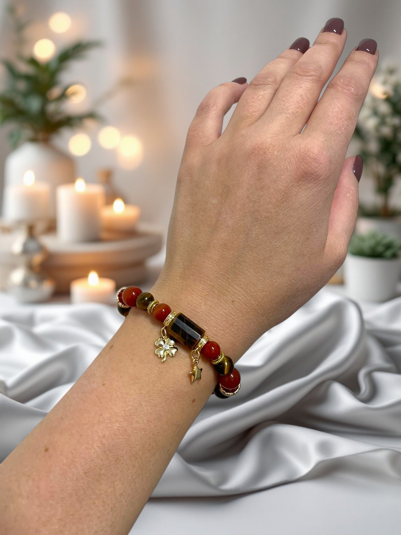 Ищете аксессуар, который подчеркнёт вашу царственную натуру? Представляем стильный браслет для Льва, выполненный из натуральных камней — сердолика и тигрового глаза. Этот браслет не только дополнит образ, но и станет вашим личным талисманом!