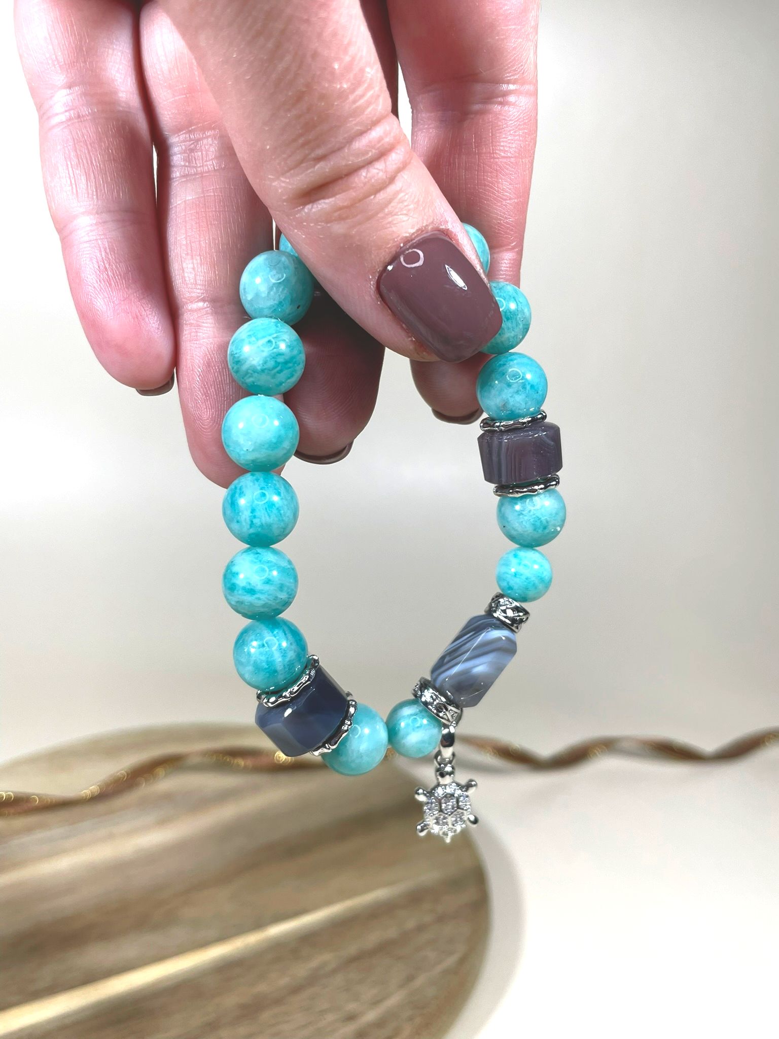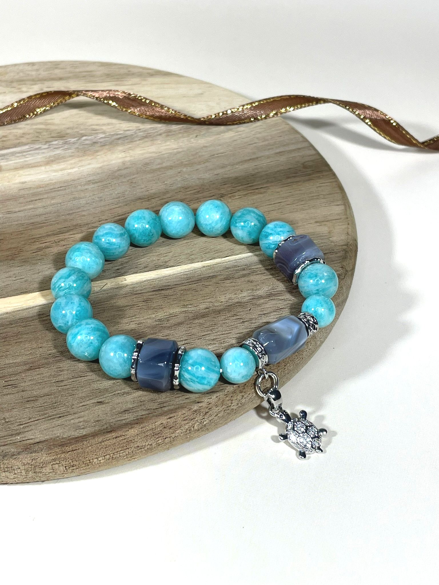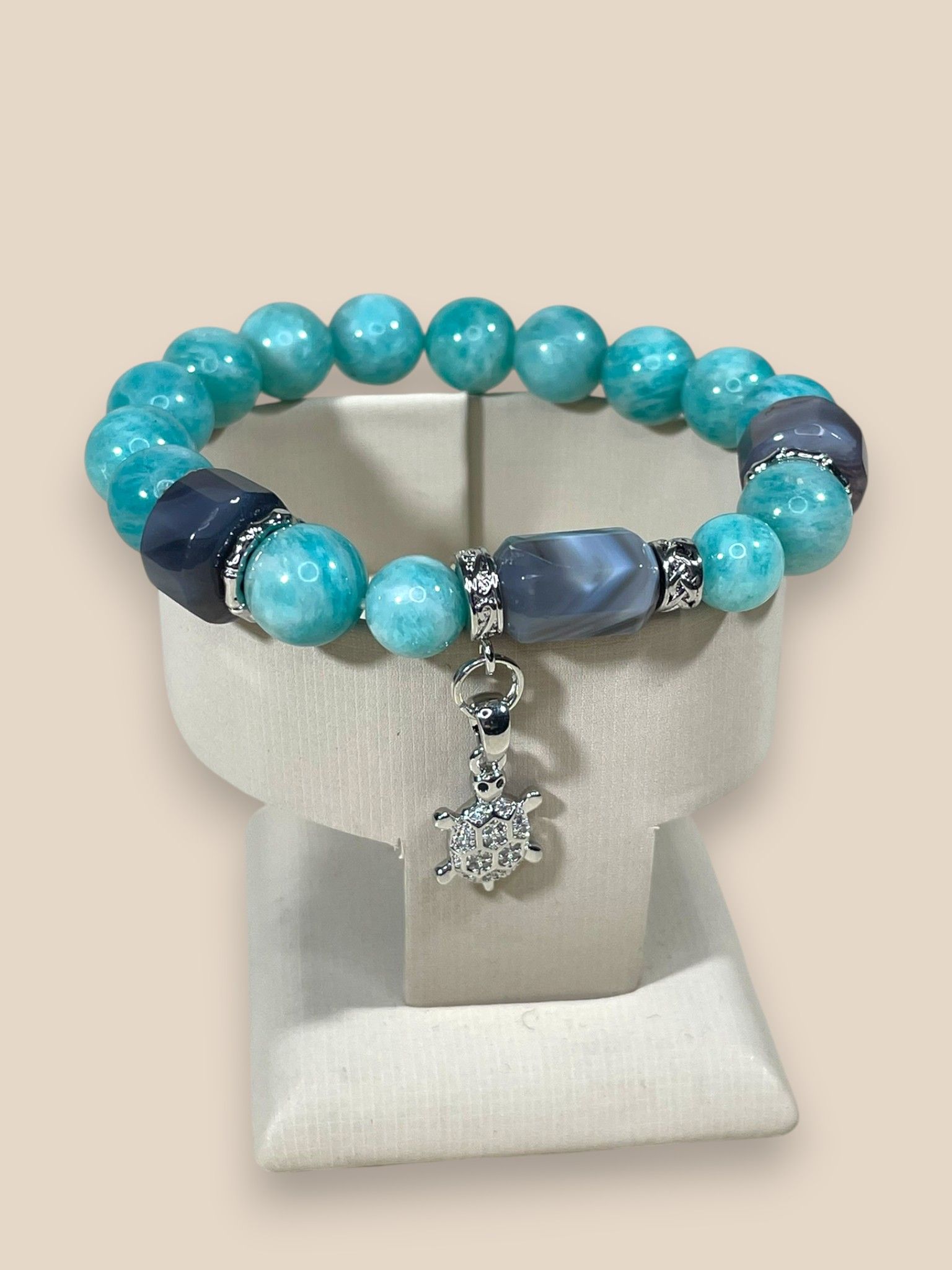 - Дизайн: гармоничное чередование гладких бусин амазонита нежно-голубого оттенка и массивных вставок из серого агата. Завершает композицию изящная подвеска.