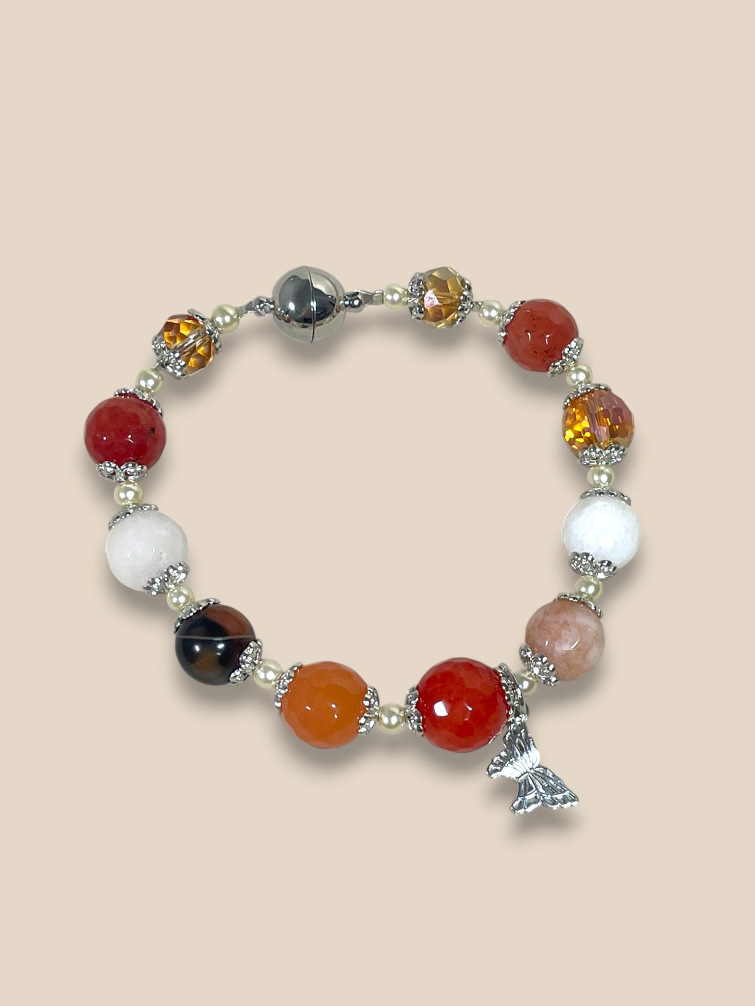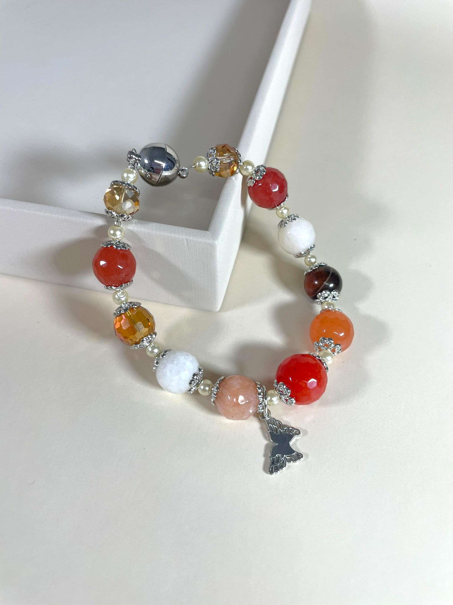 Браслет из бусин разной величины. Бусины изготовлены из стекла, натуральных камней, акрила. Браслет имеет магнитную застежку. Удобен в использовании, легко застегнуть и расстегнуть самостоятельно. Красиво смотрится на руке. Фурнитура браслета выполнена под серебро.