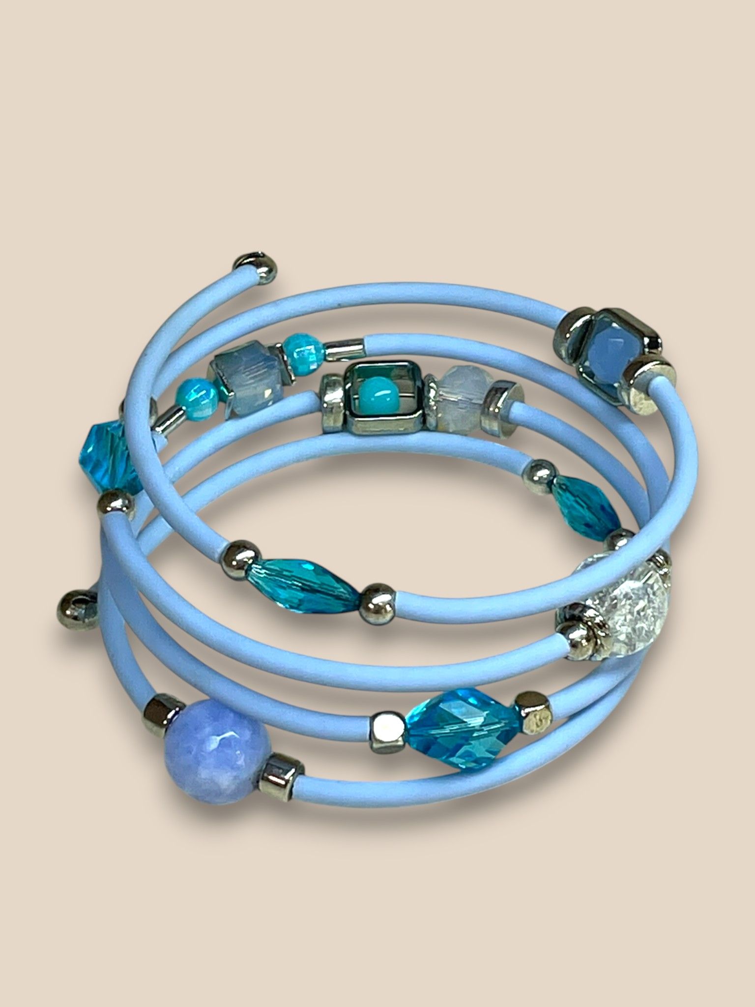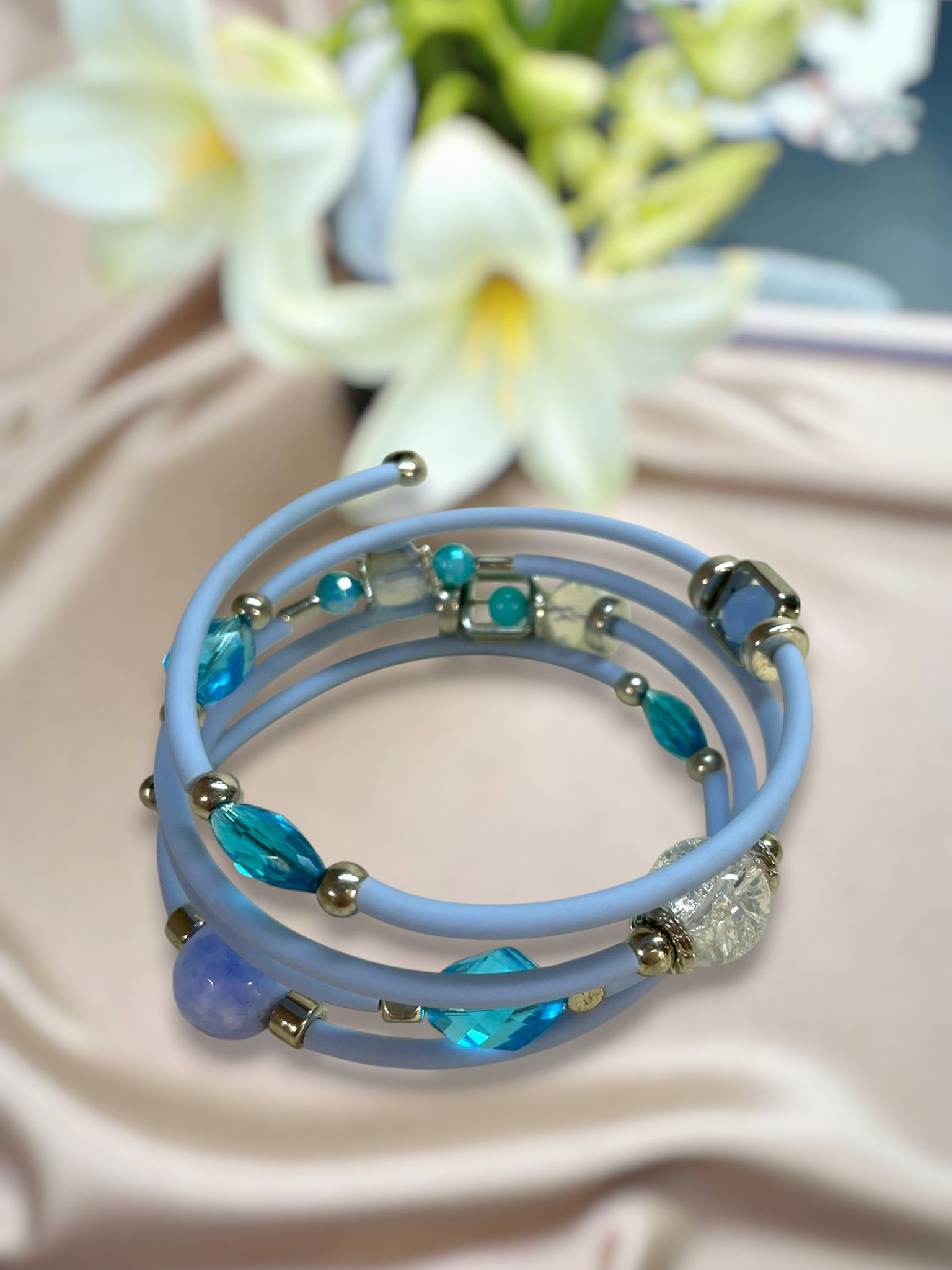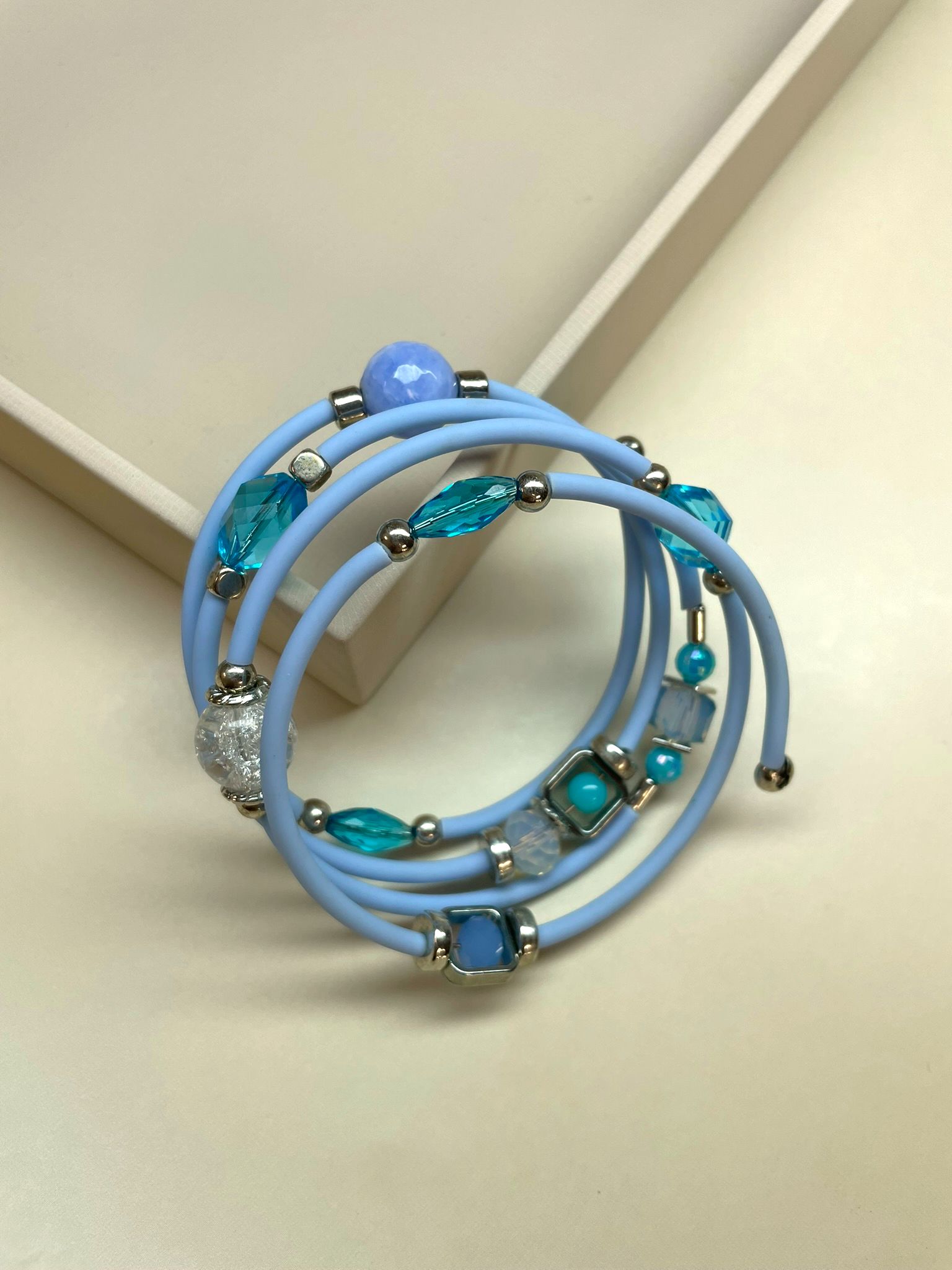 Браслет на проволоке с памятью. Изготовлен из бусин и каучукового шнура. Легко надевается, не имеет застежку. Бусины изготовлены из полимера, стекла, пластика в зависимости от вида бусины