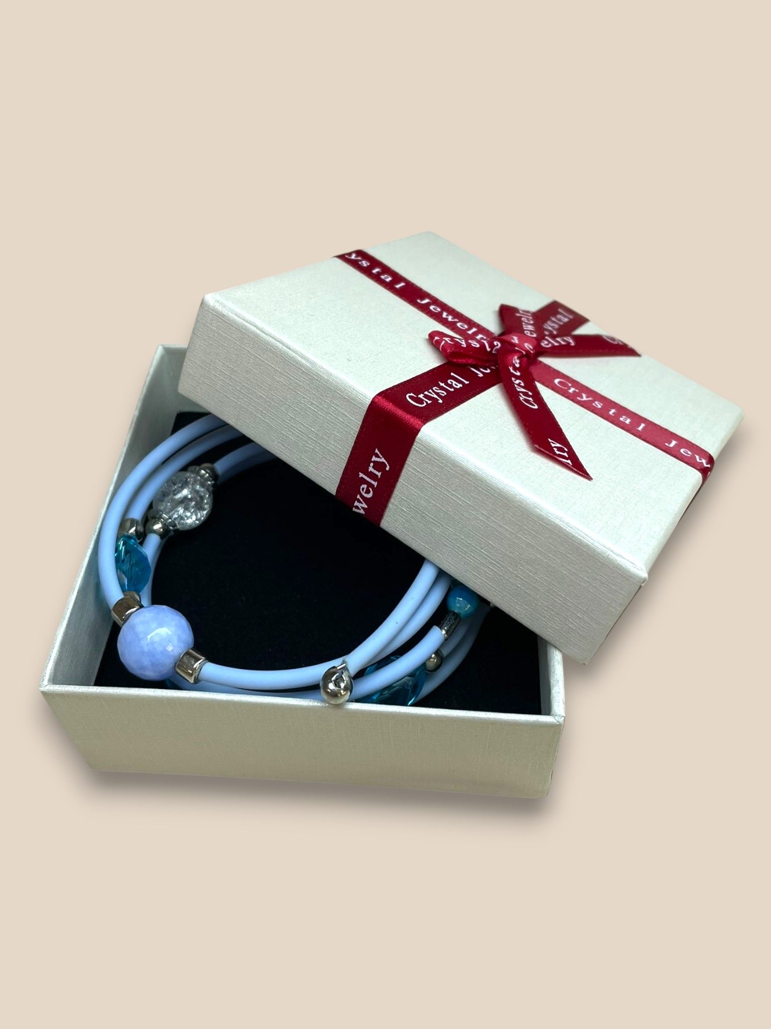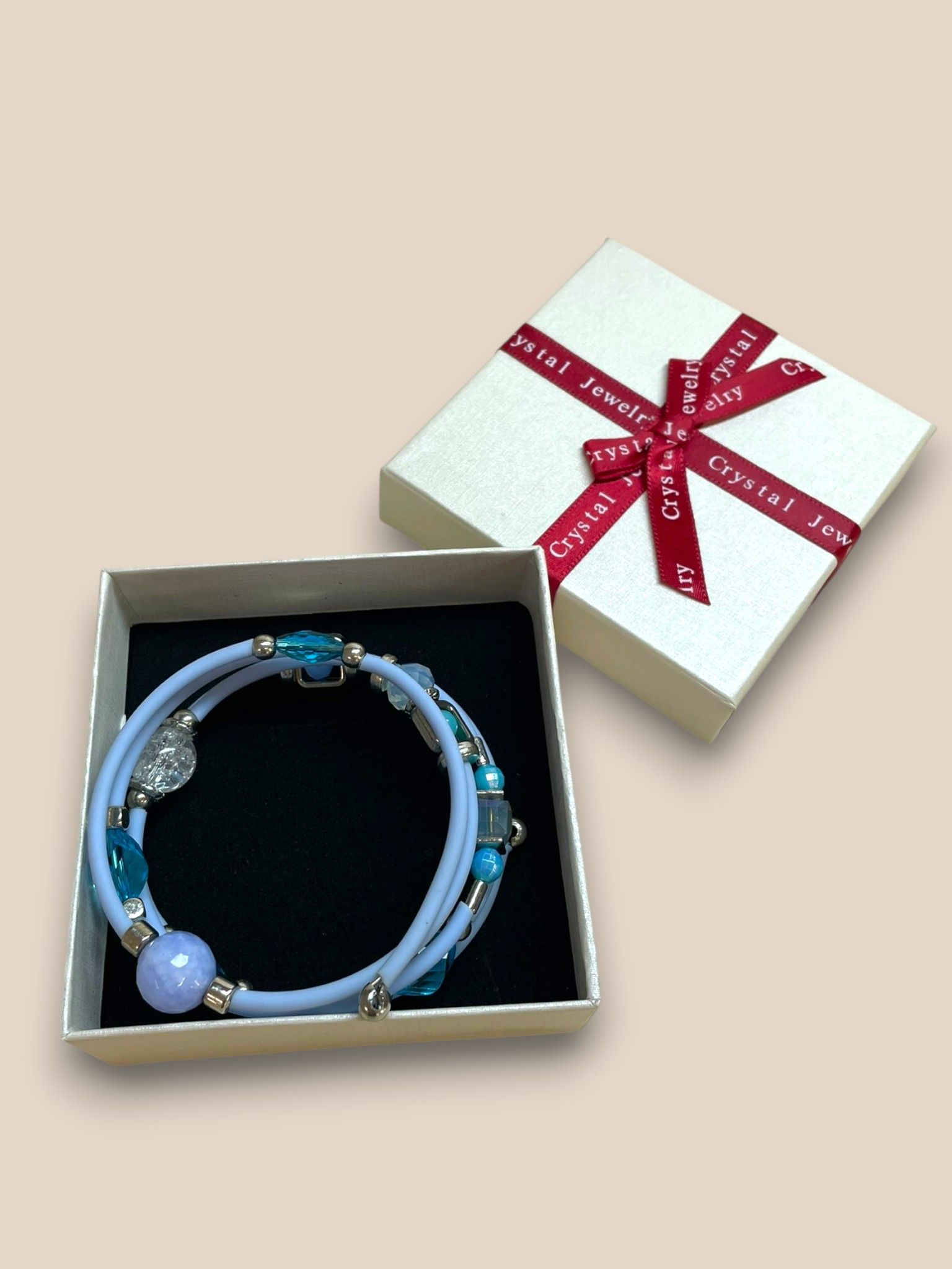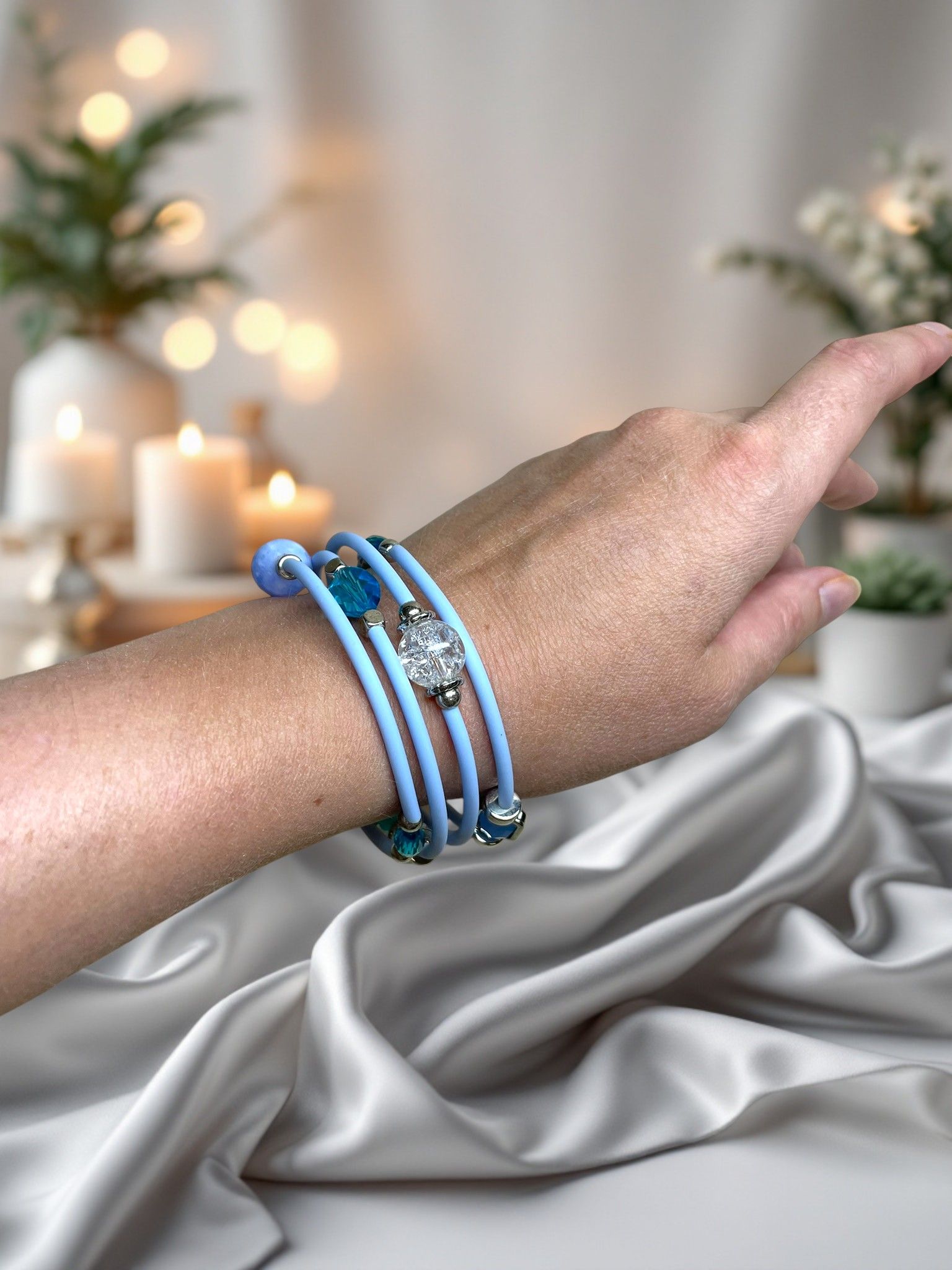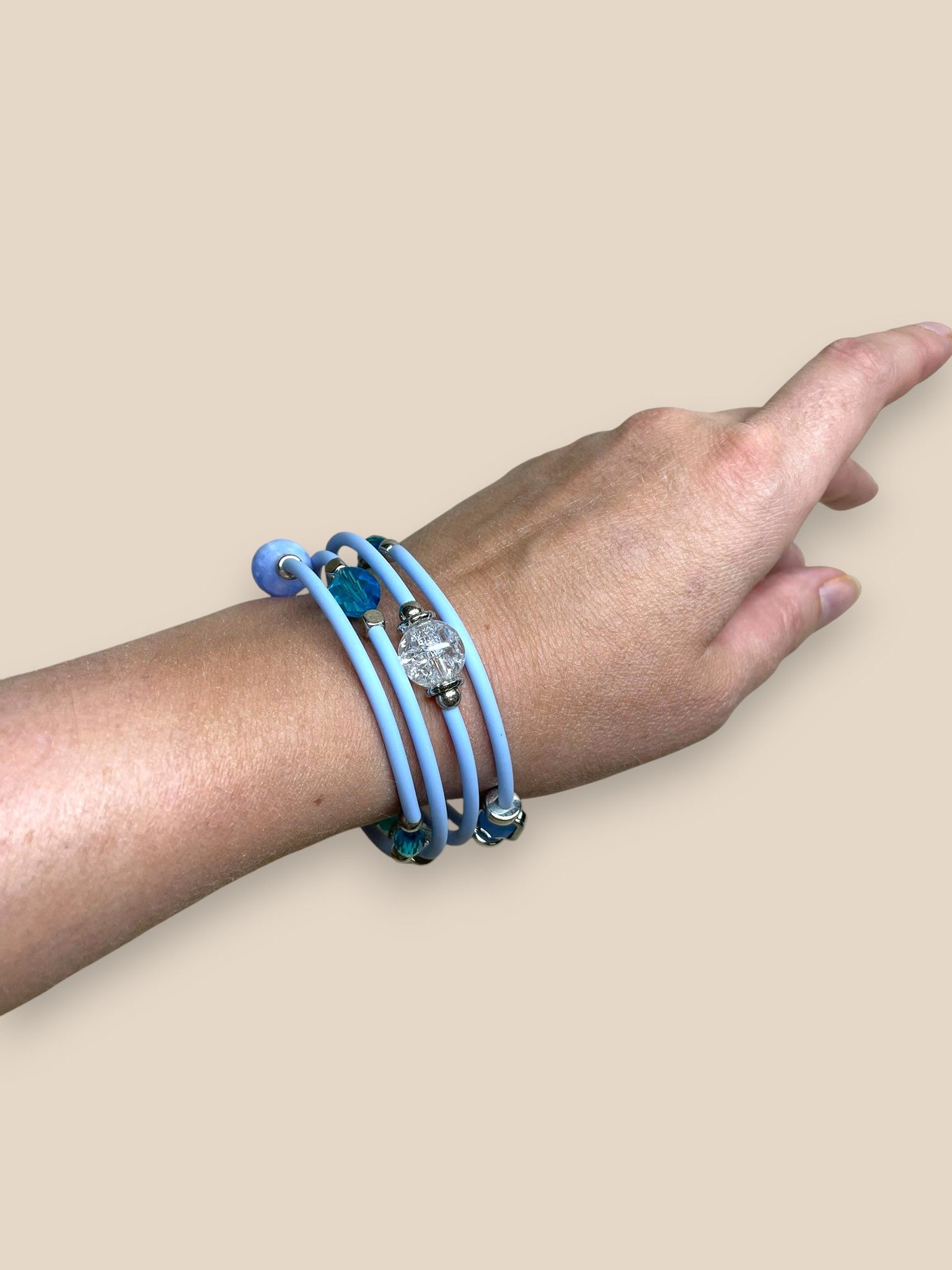 Браслет на проволоке с памятью. Изготовлен из бусин и каучукового шнура. Легко надевается, не имеет застежку. Бусины изготовлены из полимера, стекла, пластика в зависимости от вида бусины