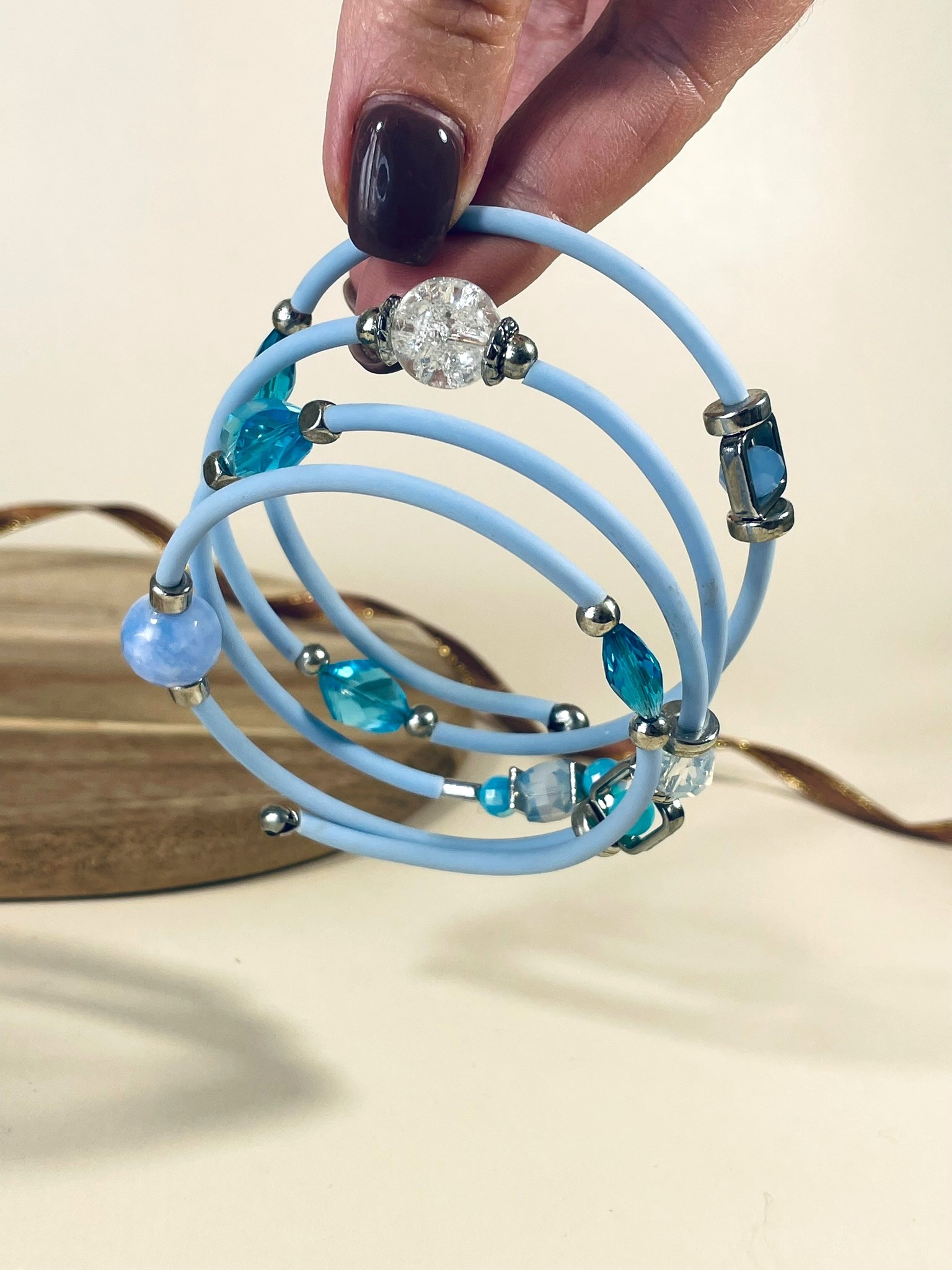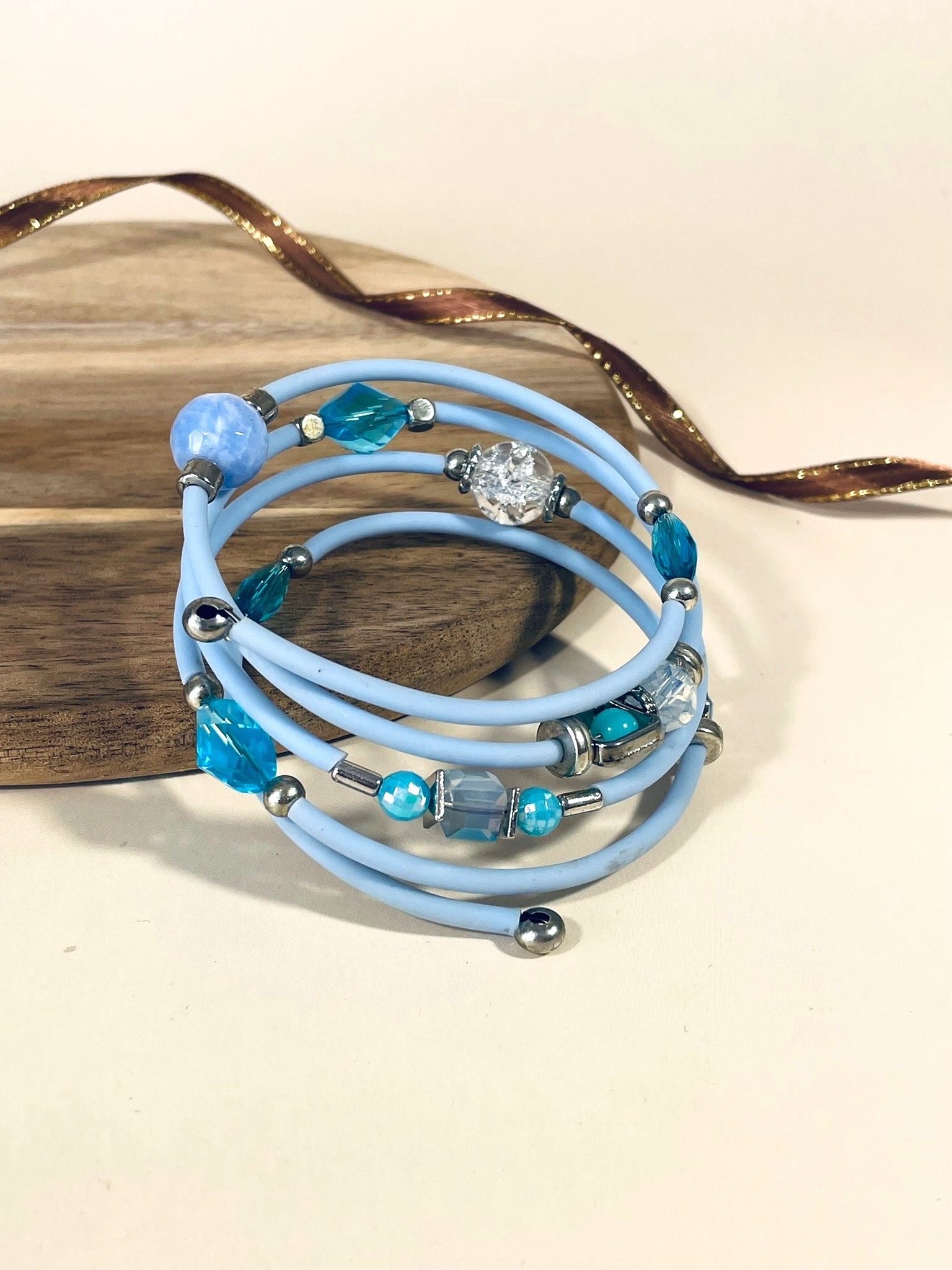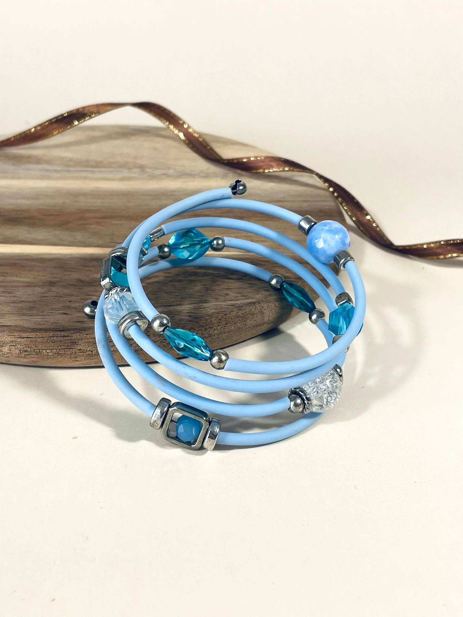 - Шнур: каучуковый, небесно-голубого цвета. Придаёт изделию дополнительную гибкость и мягкость, делает браслет приятным на ощупь.