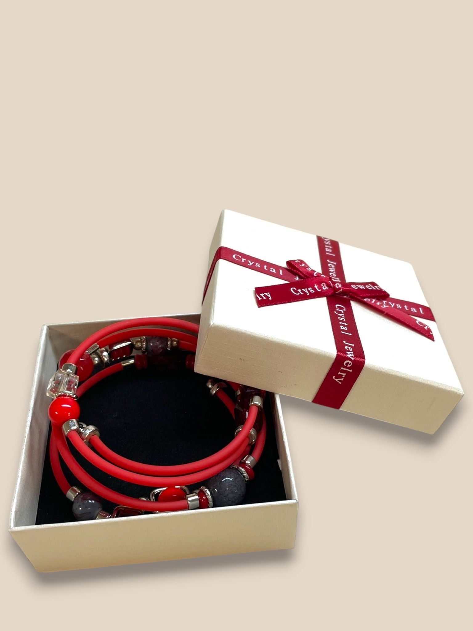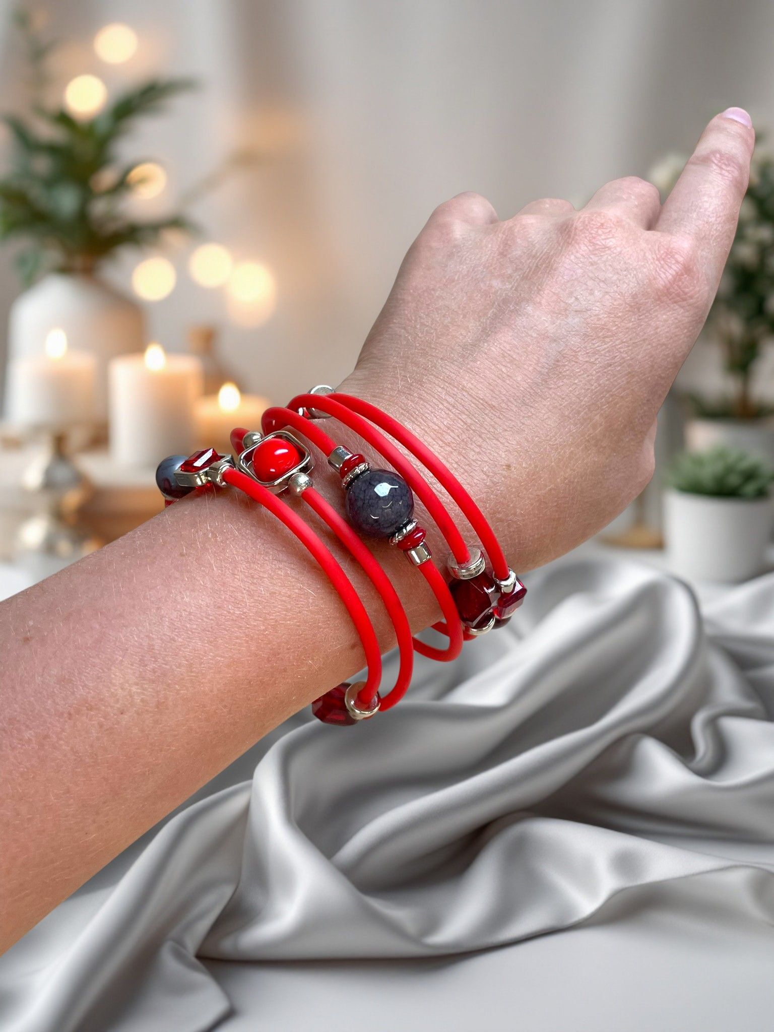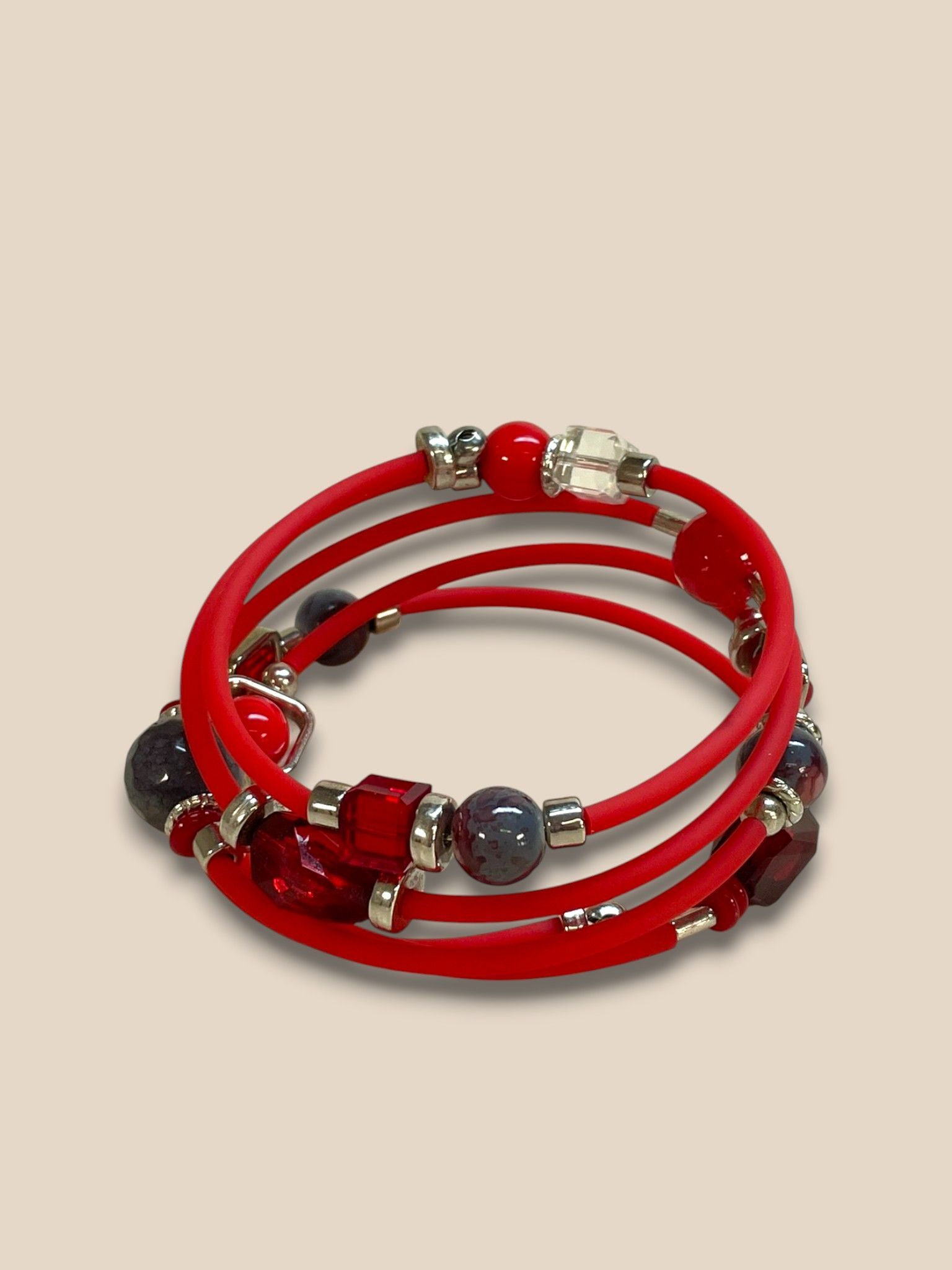Браслет на проволоке с памятью. Изготовлен из бусин и каучукового шнура. Легко надевается, не имеет застежку. Бусины изготовлены из полимера, стекла, пластика в зависимости от вида бусины
