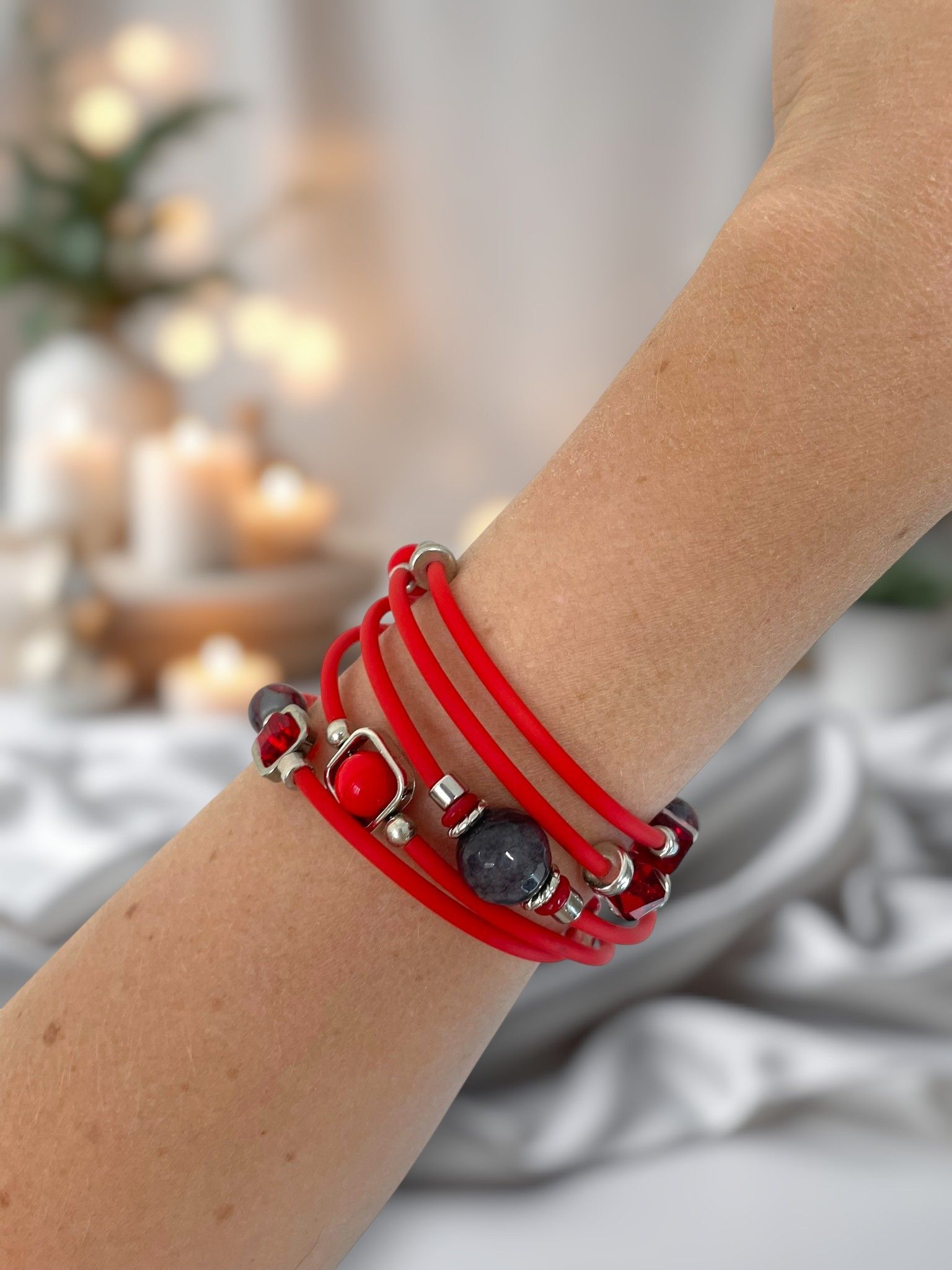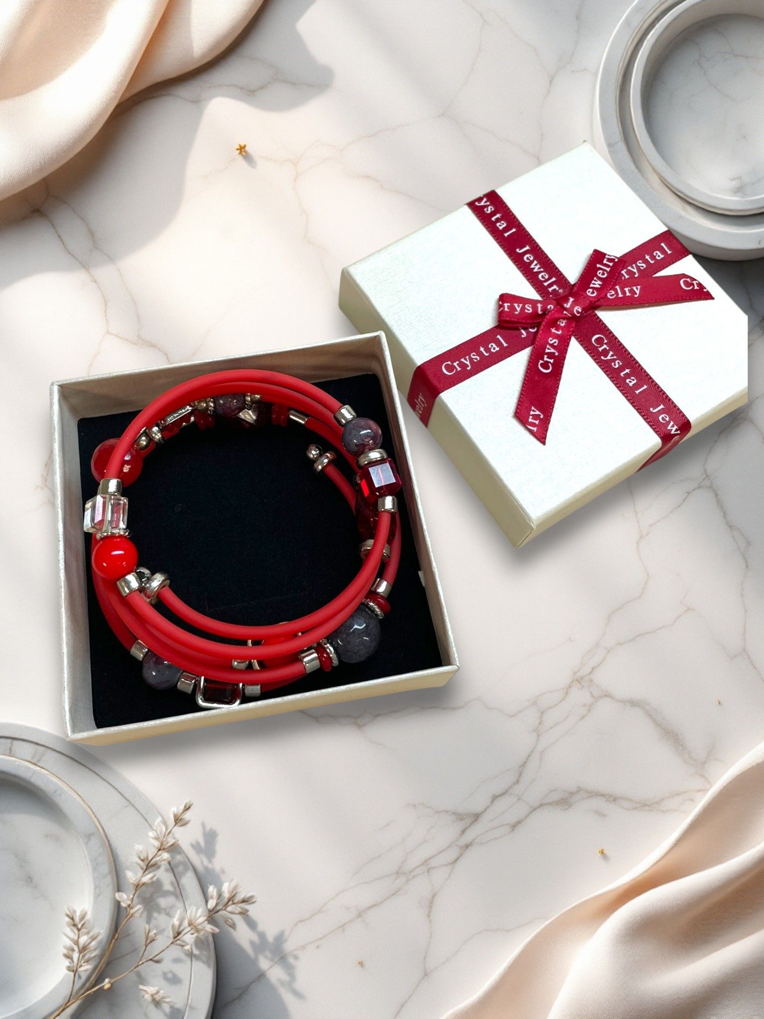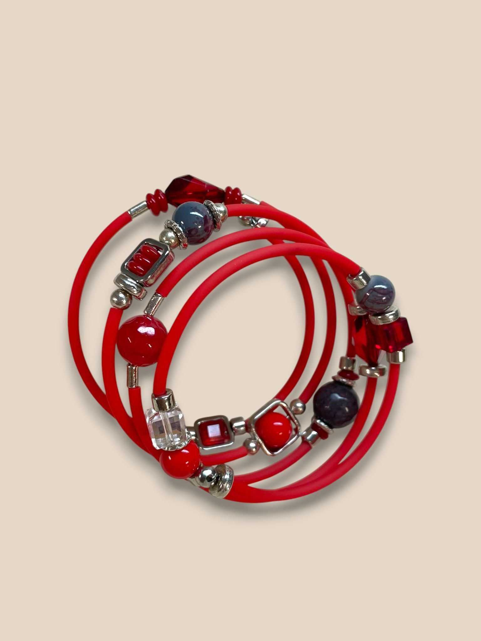 Браслет на проволоке с памятью. Изготовлен из бусин и каучукового шнура. Легко надевается, не имеет застежку. Бусины изготовлены из полимера, стекла, пластика в зависимости от вида бусины