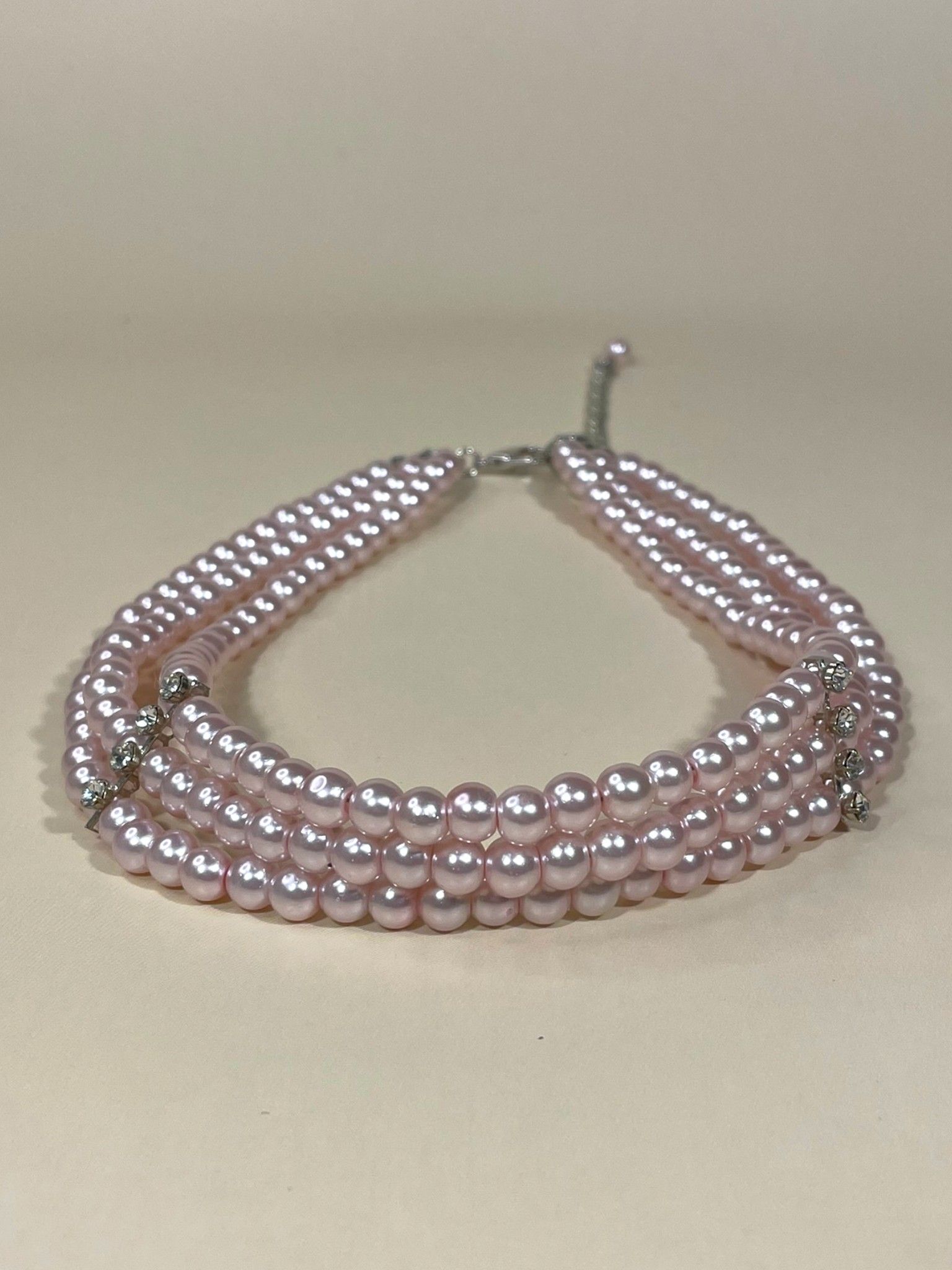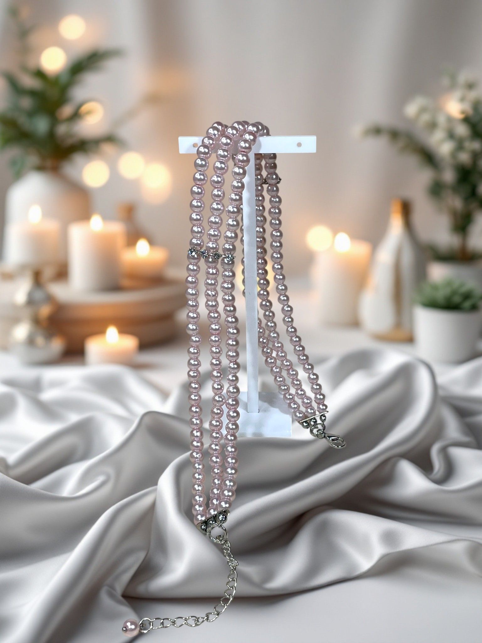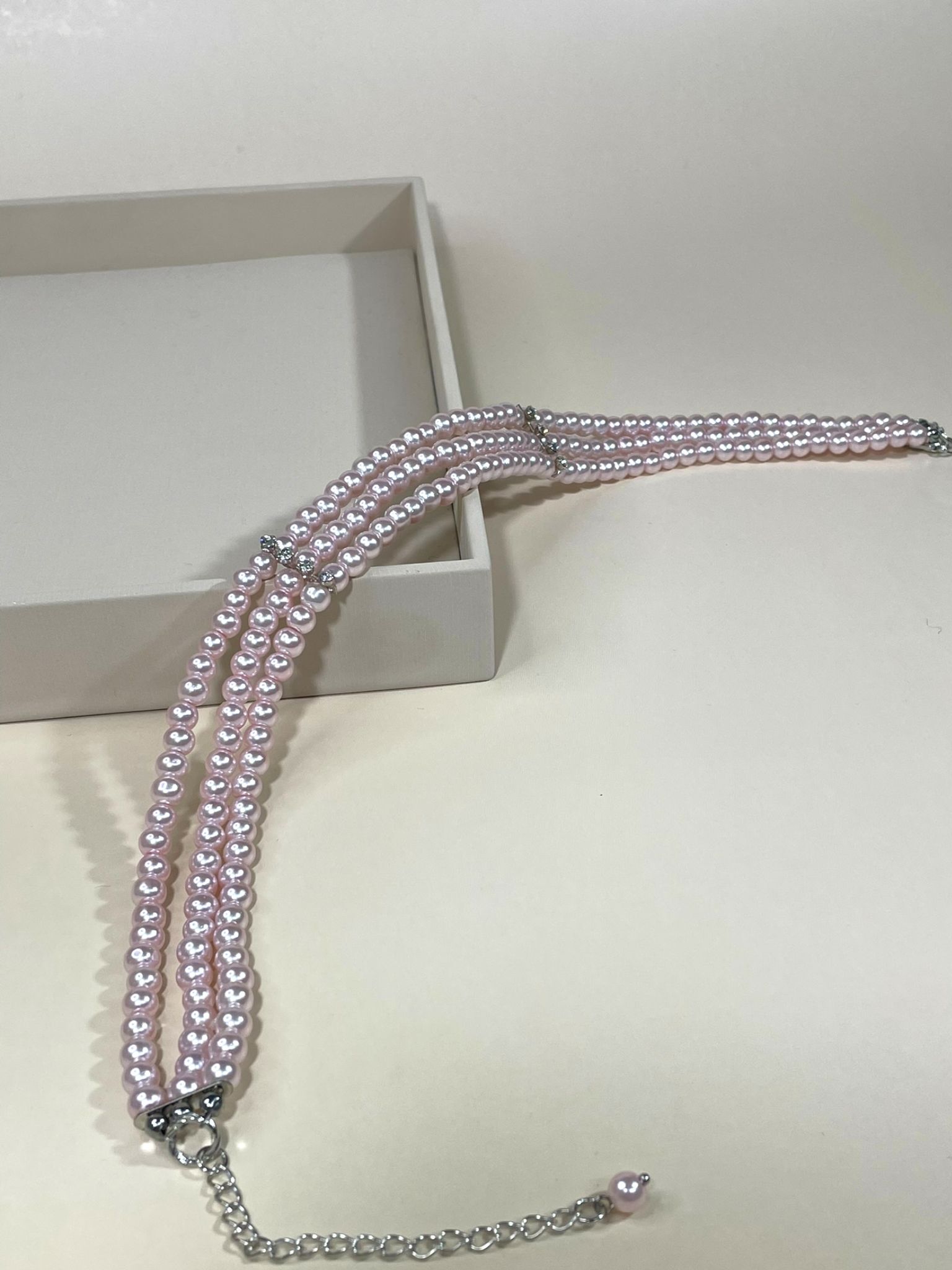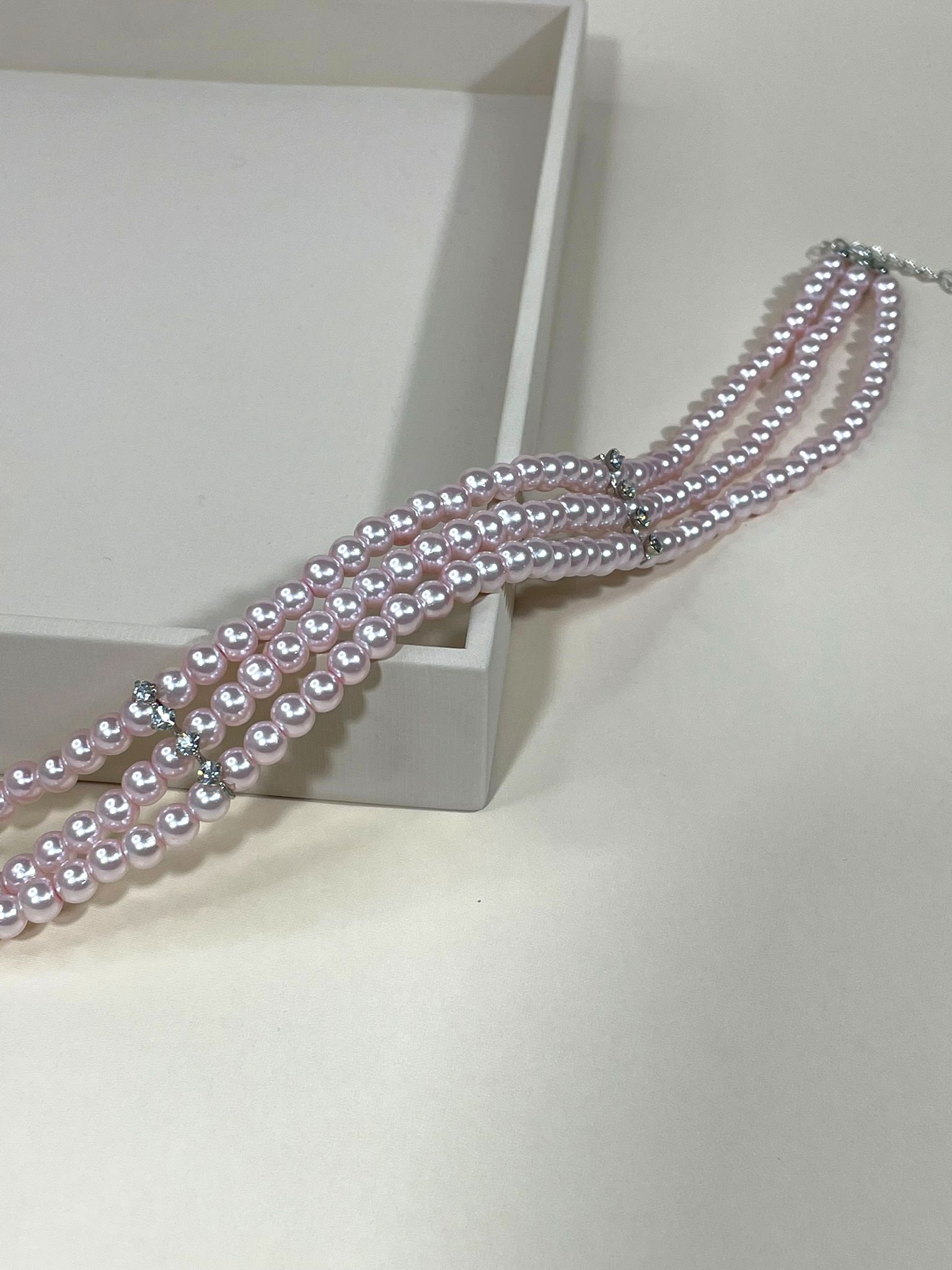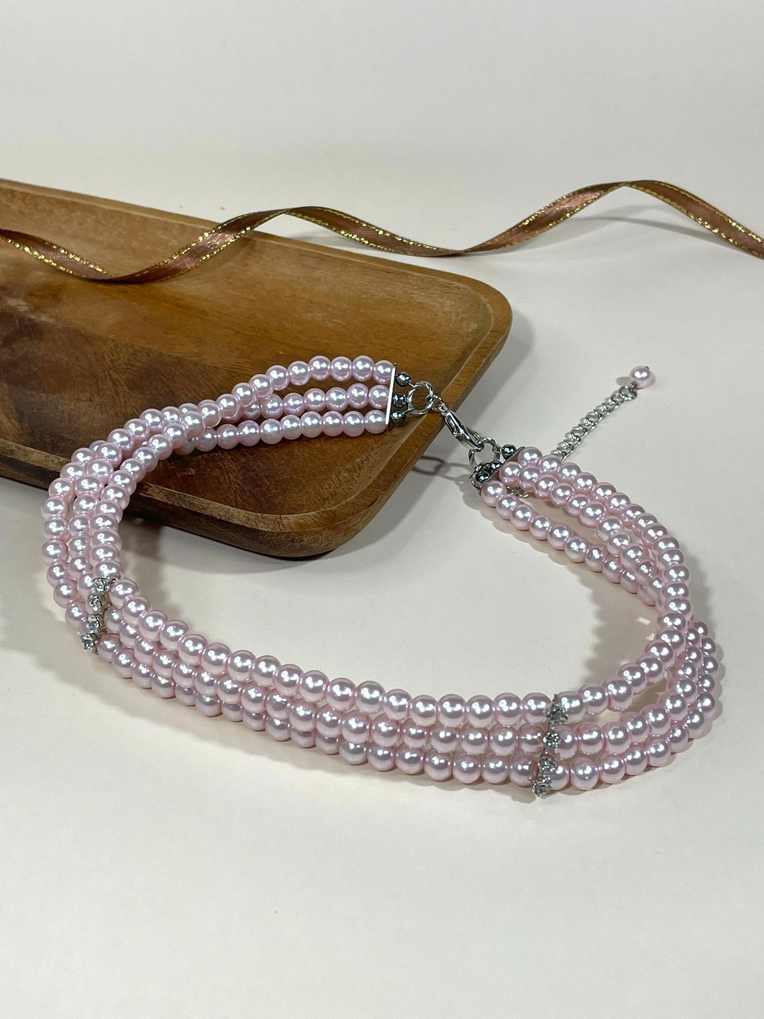 - Дизайн: трёхрядное исполнение с нежно-розовыми жемчужинами, которые переливаются на свету, создавая завораживающий эффект.
