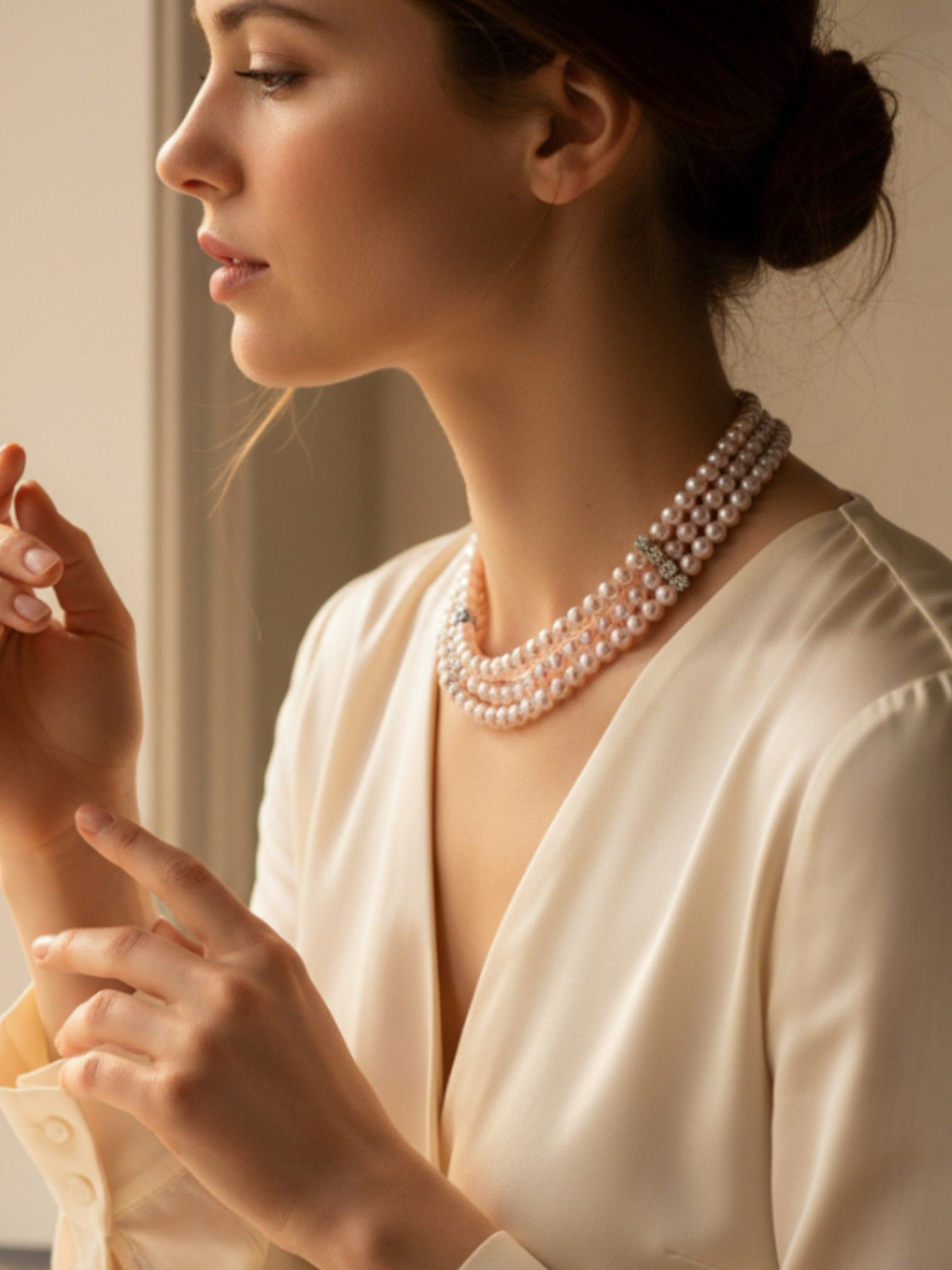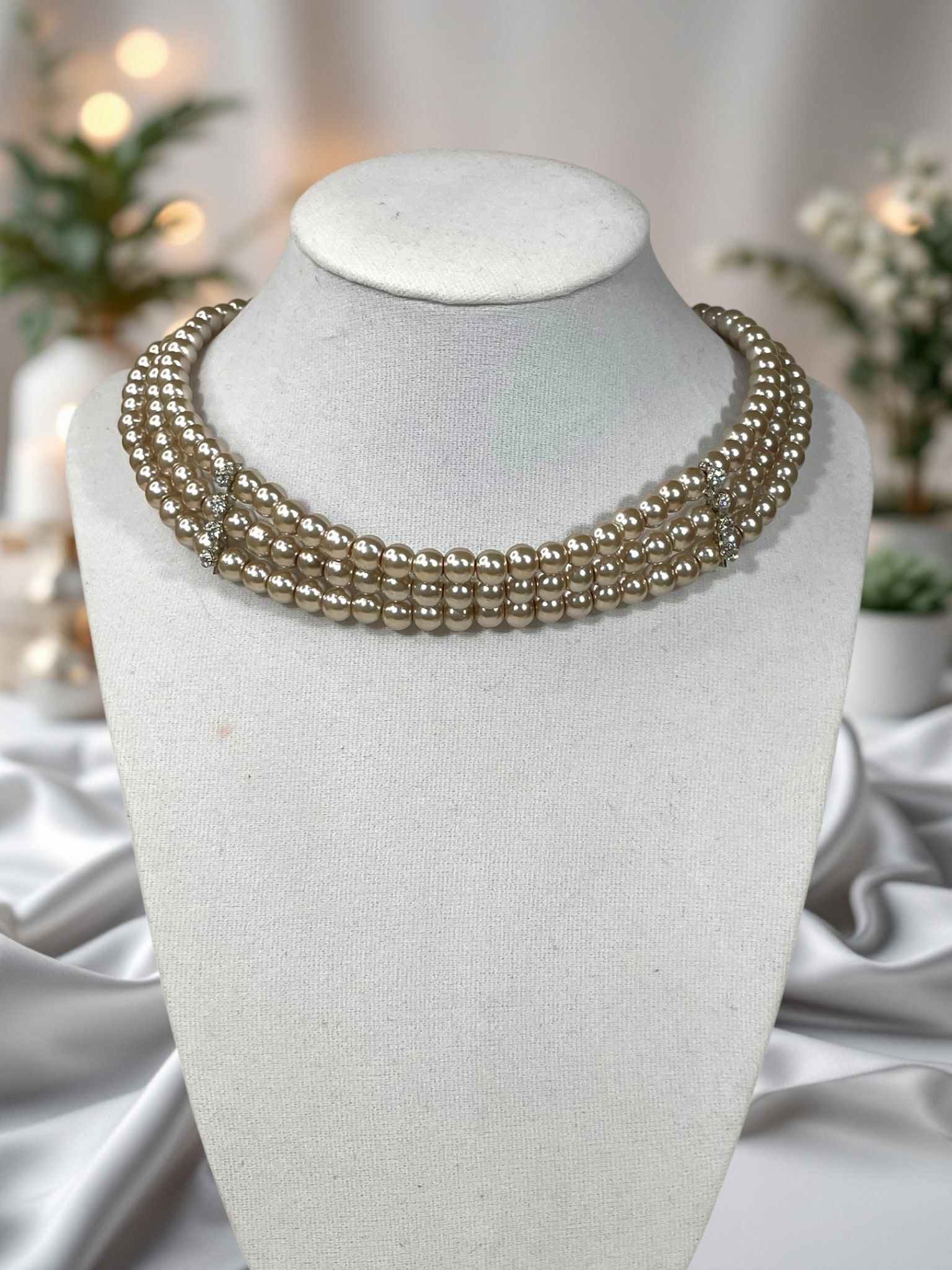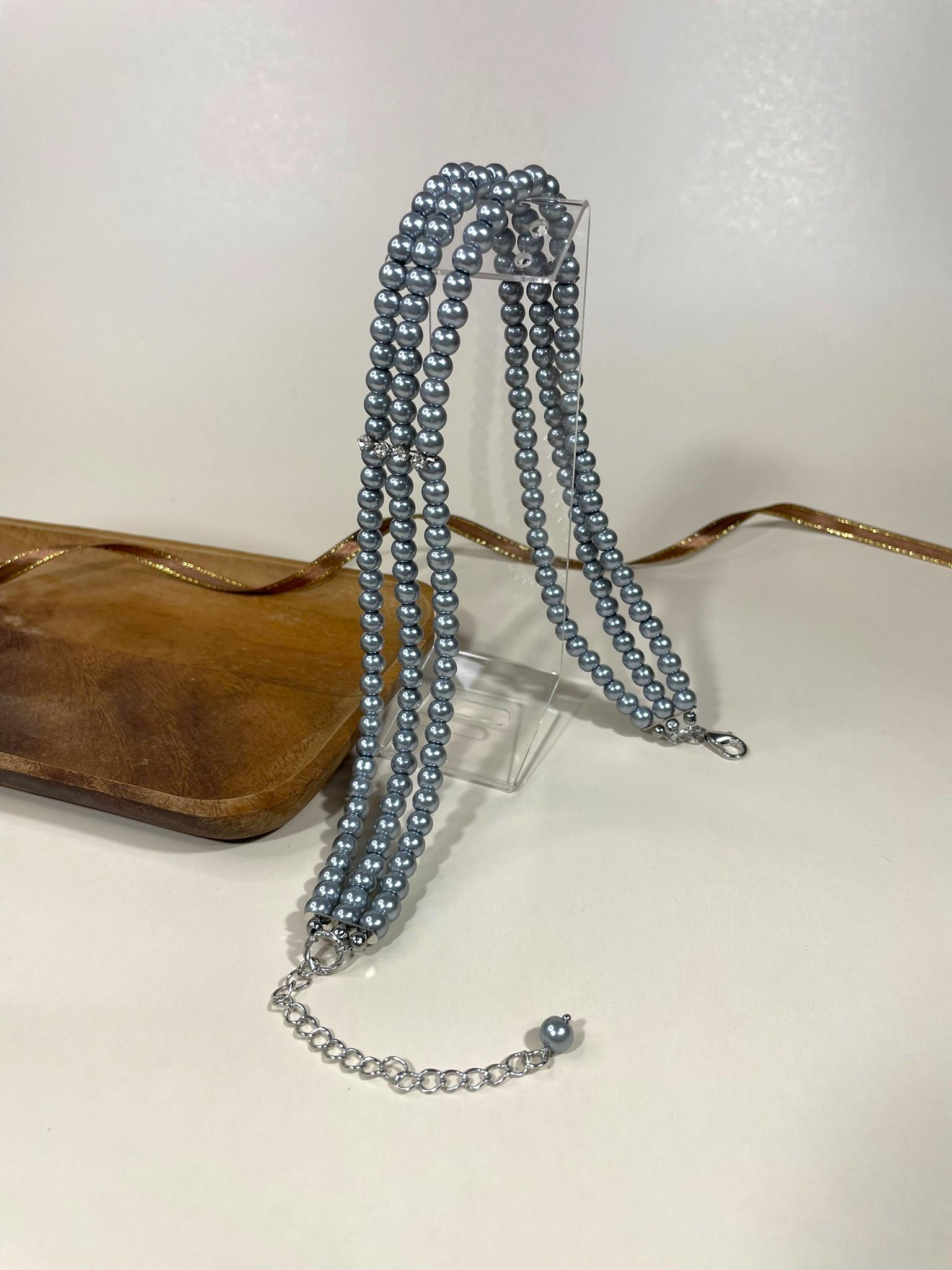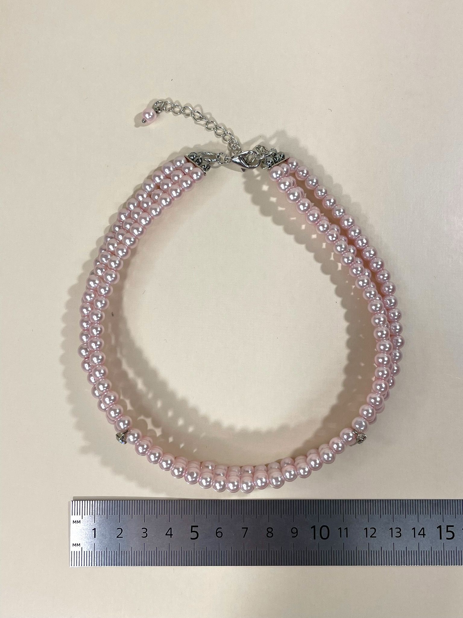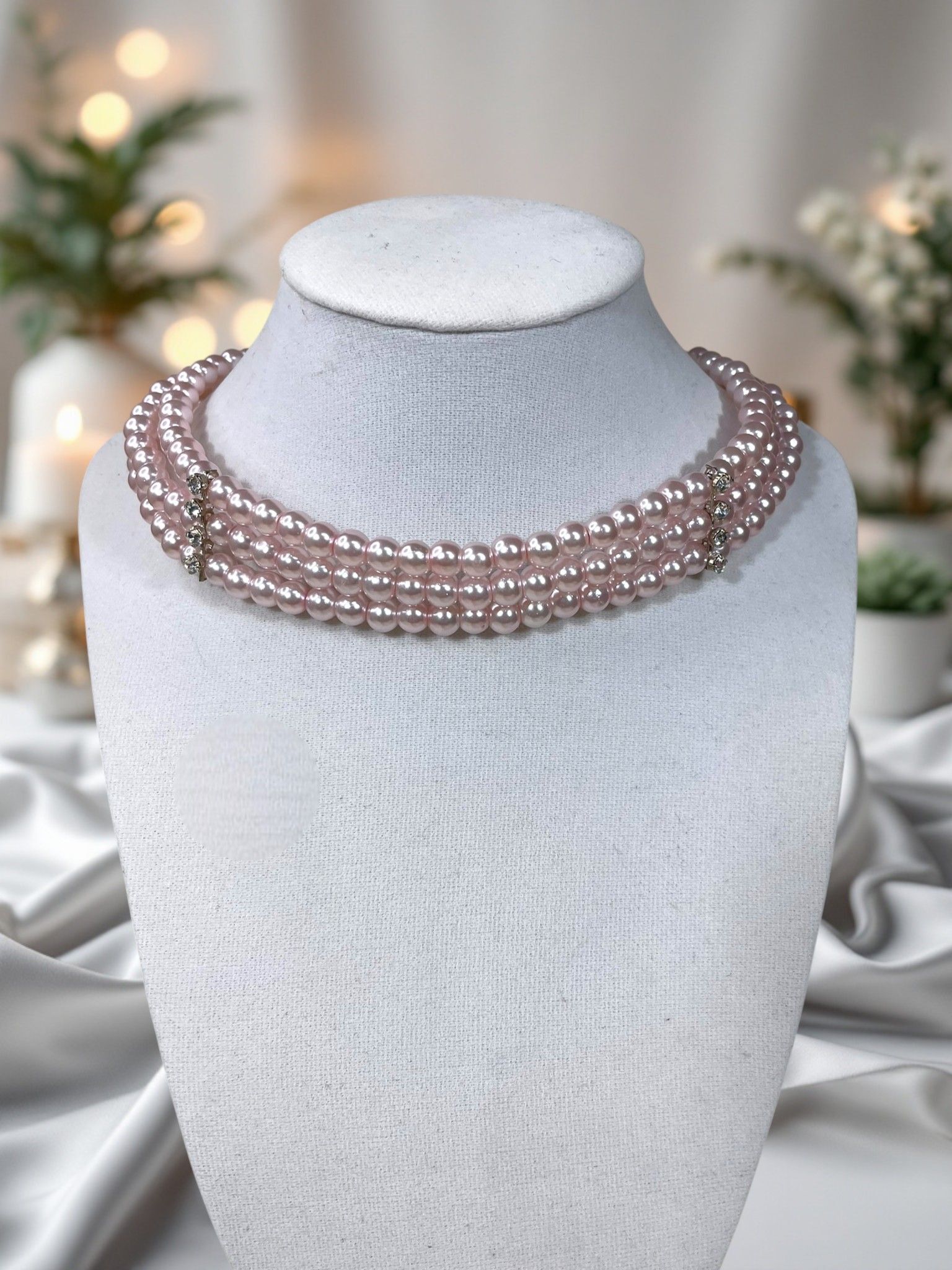 - Дизайн: трёхрядное исполнение с нежно-розовыми жемчужинами, которые переливаются на свету, создавая завораживающий эффект.