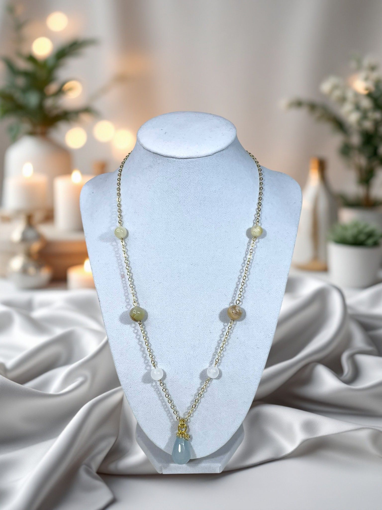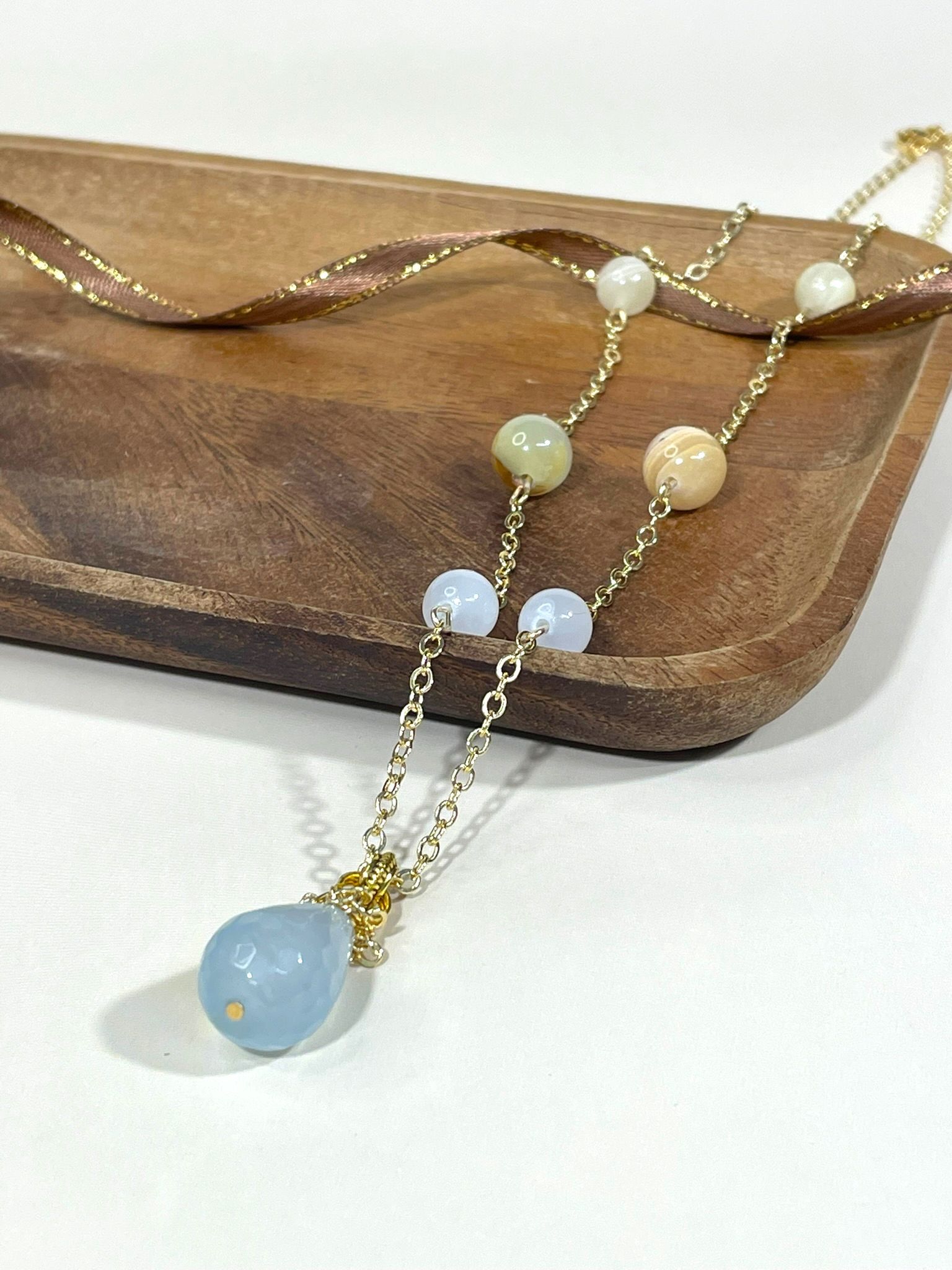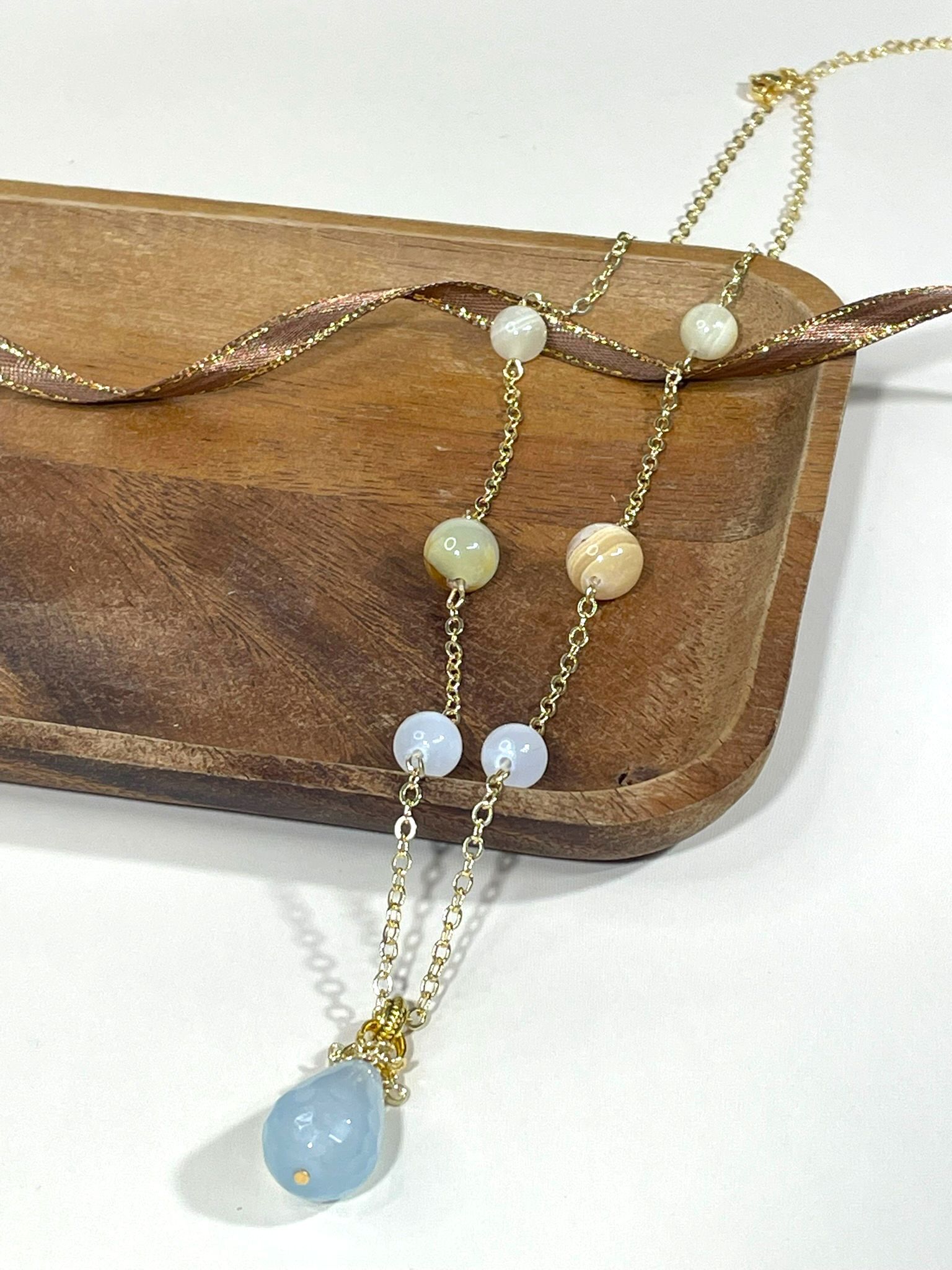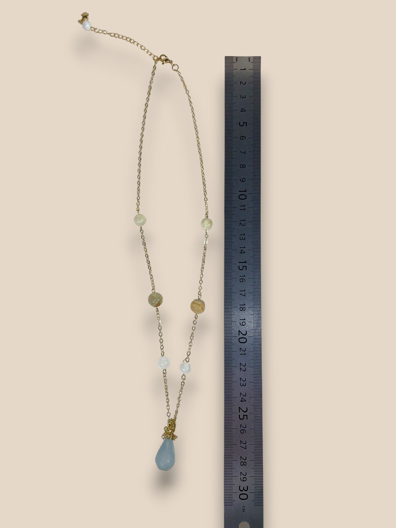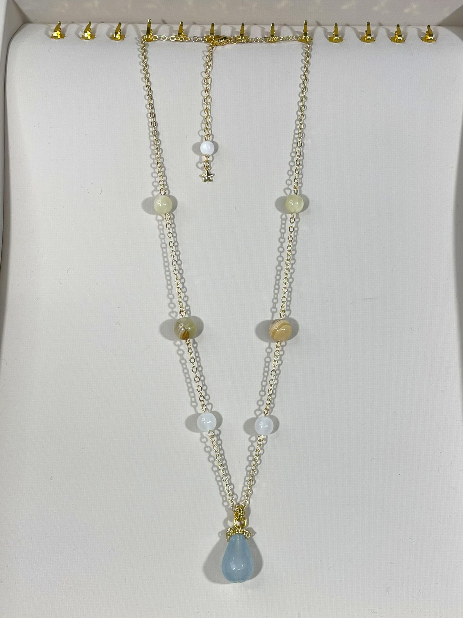 - Центральный акцент: крупная подвеска-капля из голубого агата - выразительный элемент, притягивающий взгляды. Агат добавляет колье свежести и утончённости.