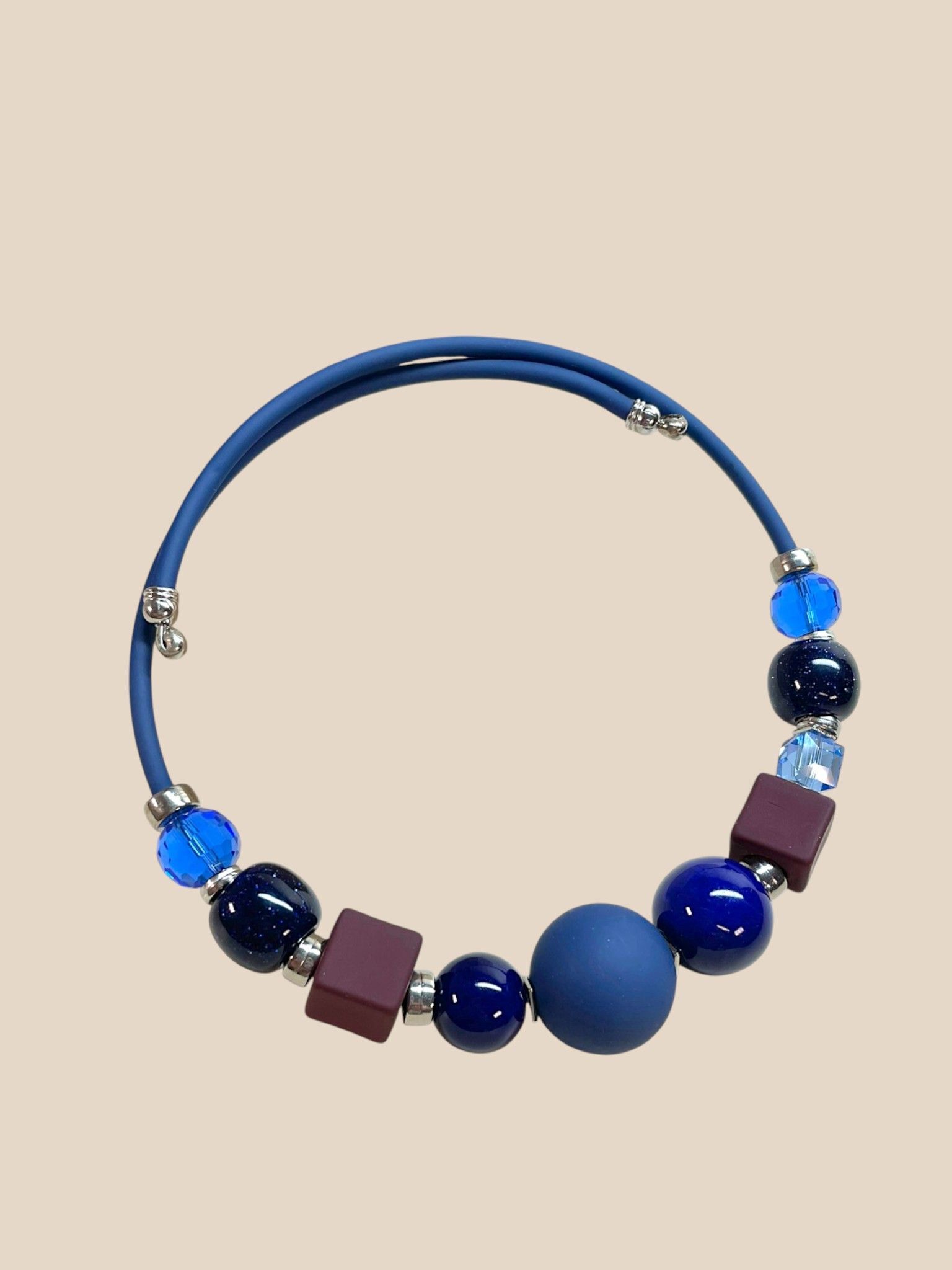Колье на основе гибкой проволоки с памятью. Легко надевается и снимается, не имеет застежки. Колье выполнено из бусин и каучука. Бусины разной формы и из разных материалов: полимер, стекло, металл.