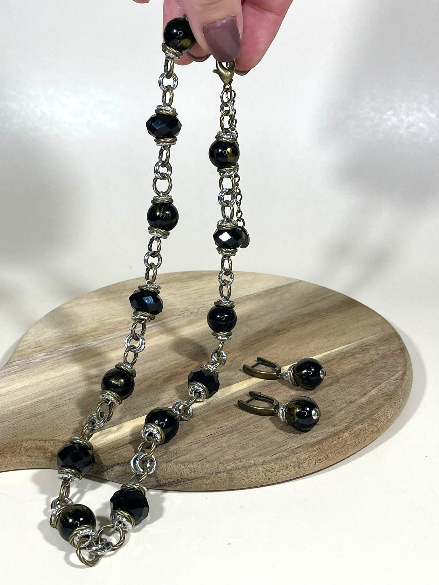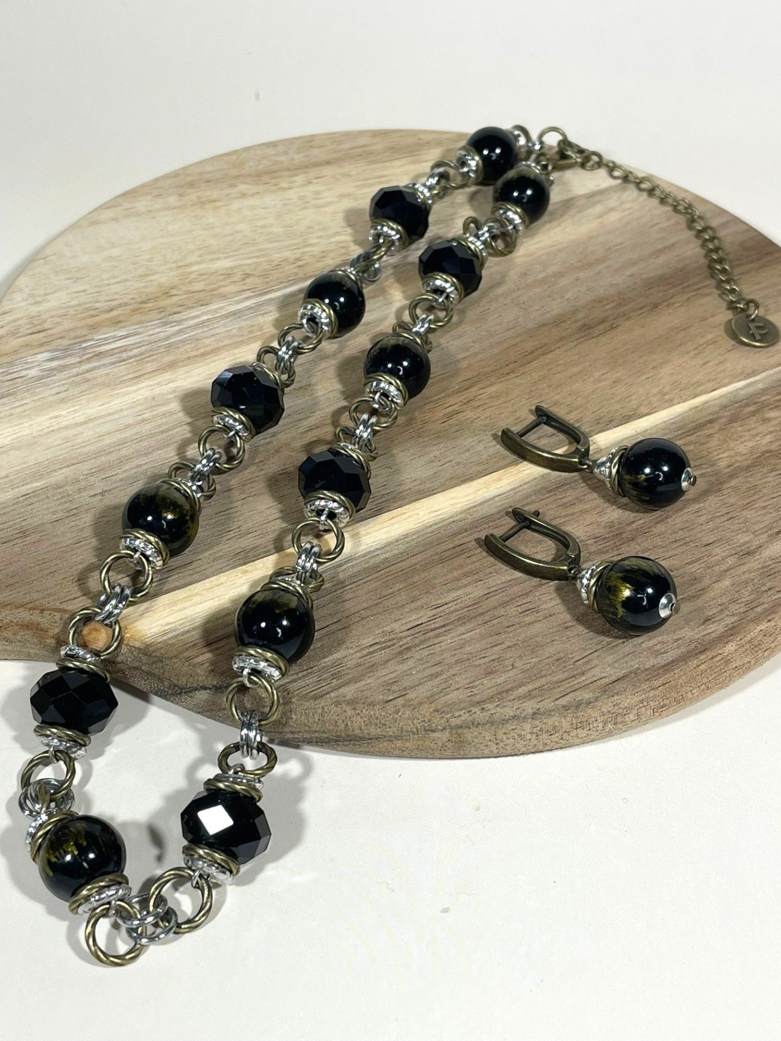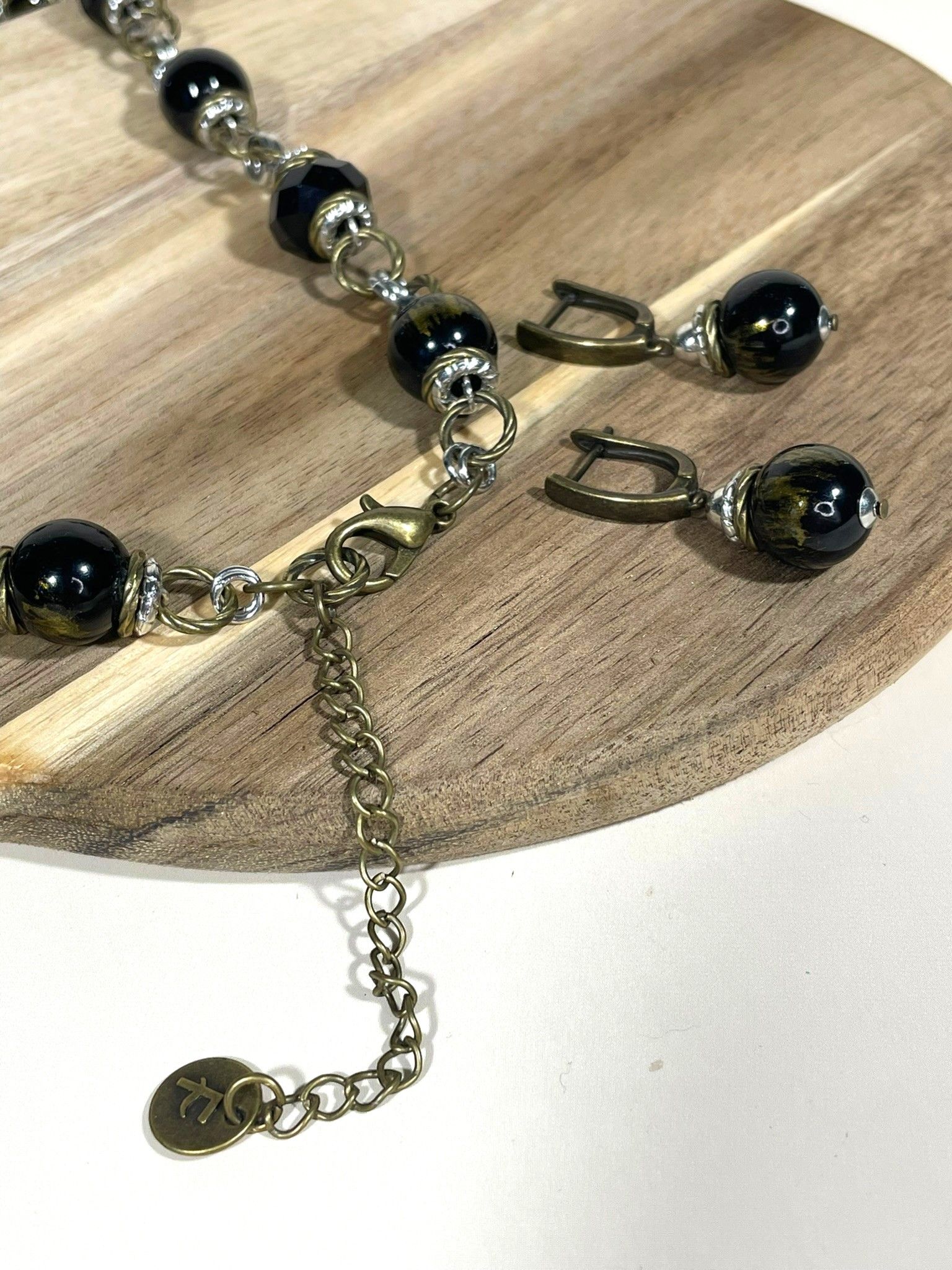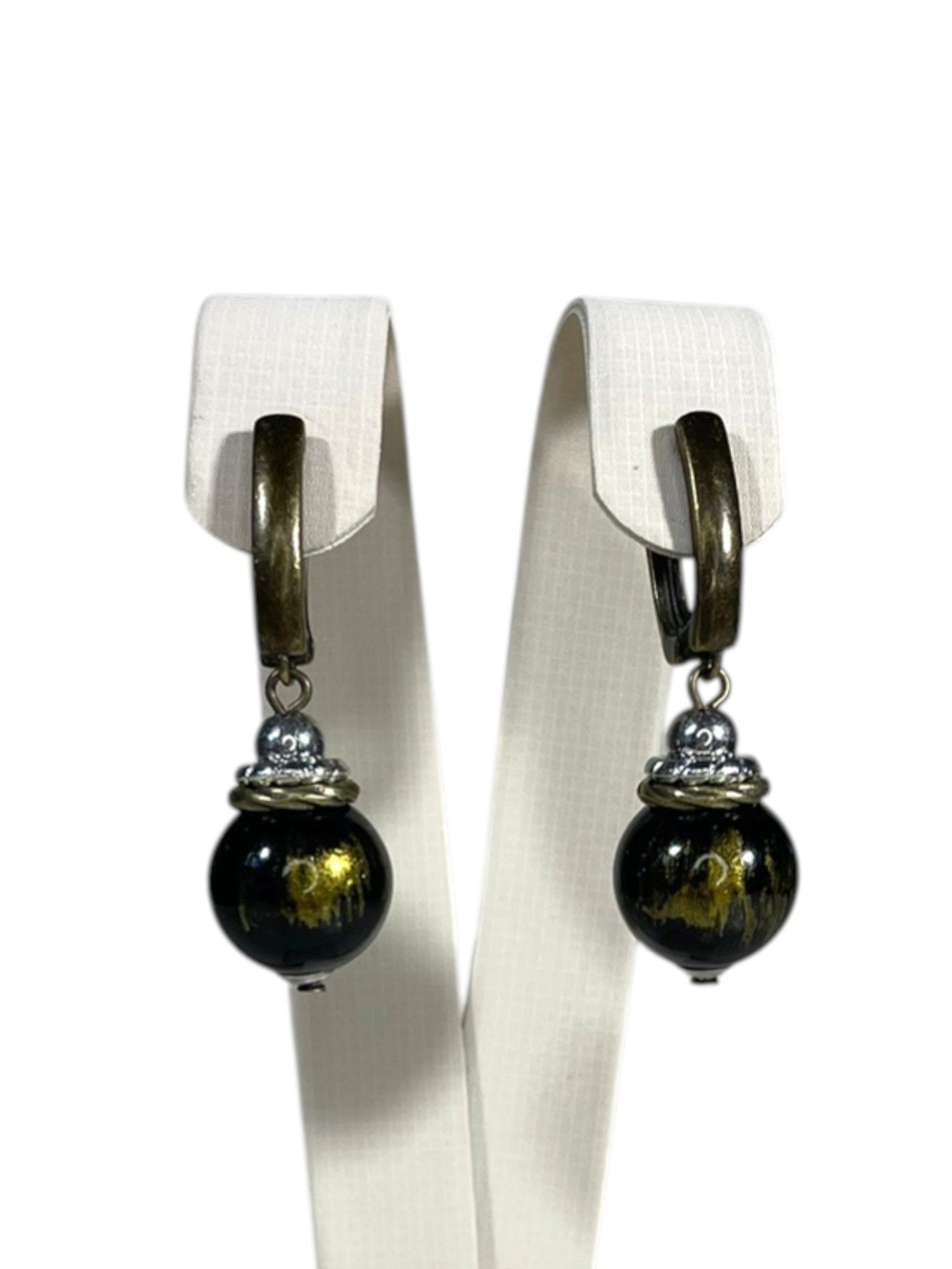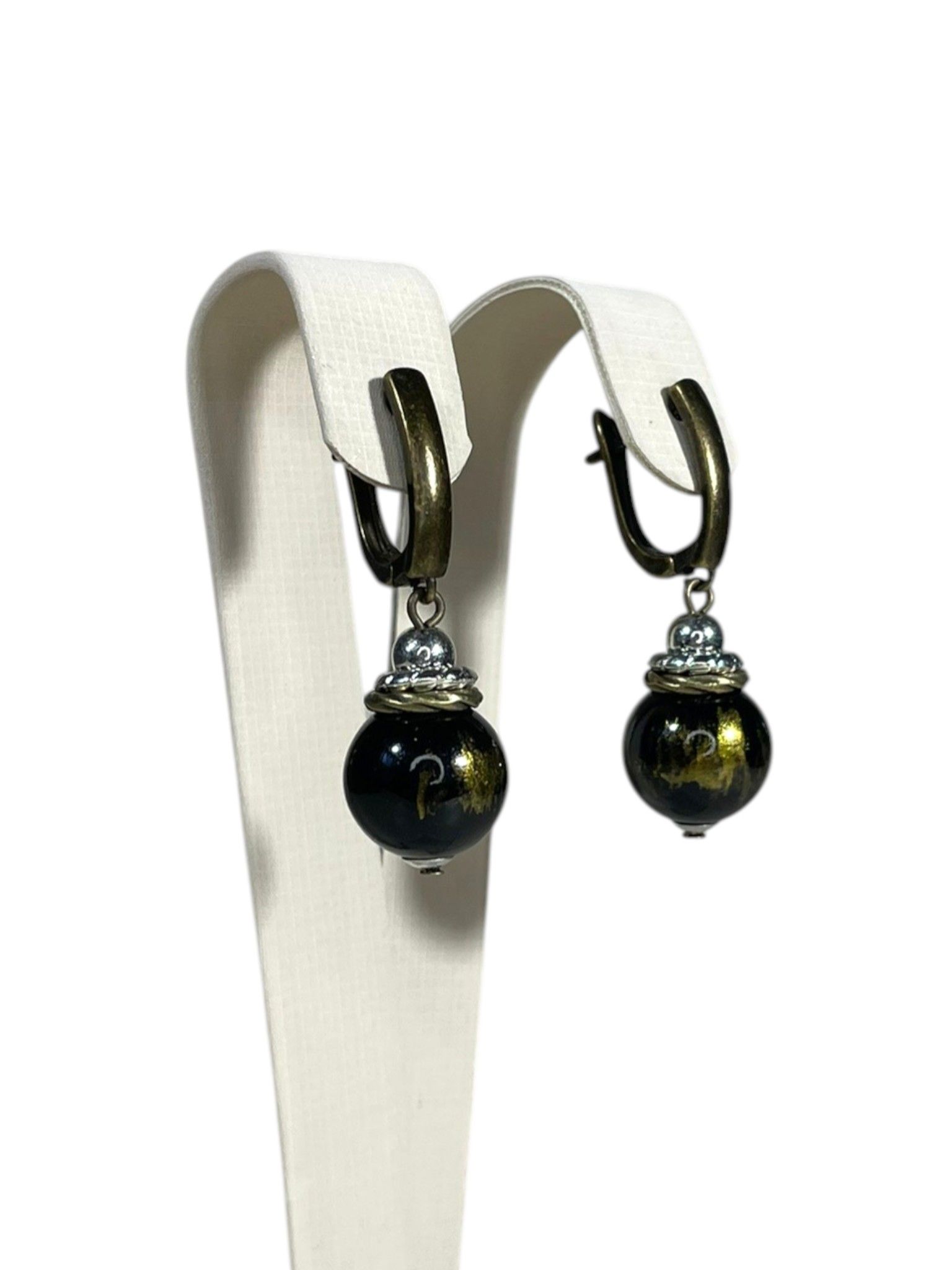 - Серьги: дополняют колье, повторяя его дизайн. Каждая серьга украшена крупной бусиной из муранского стекла, обрамлённой фурнитурой из бижутерного сплава. Длина серёг — 5 см, что делает их универсальными: они не выглядят громоздко, но при этом привлекают внимание.