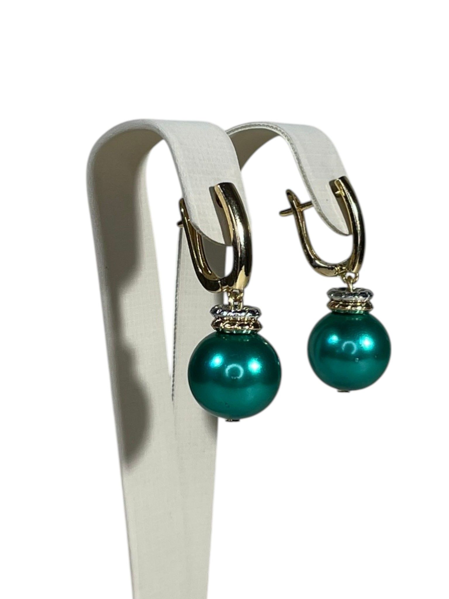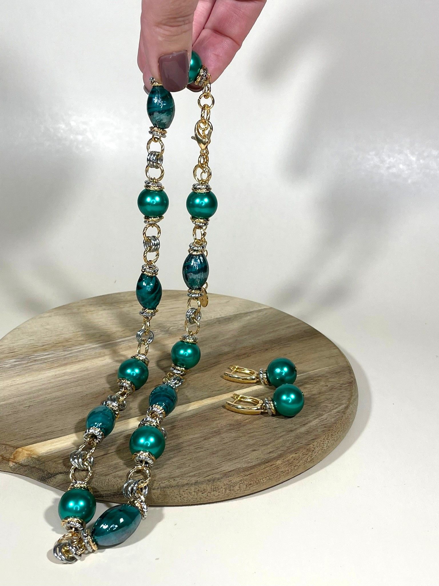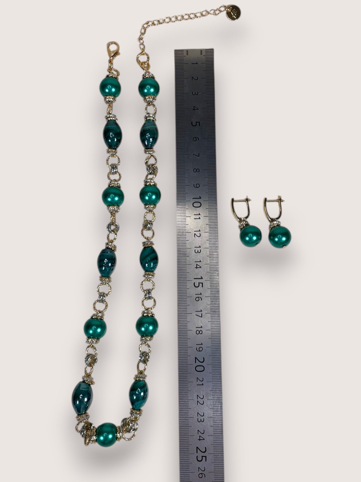 - Серьги: дополняют колье, повторяя его дизайн. Каждая серьга украшена крупной бусиной из муранского стекла, обрамлённой фурнитурой из бижутерного сплава. Длина серёг — 5 см, что делает их универсальными: они не выглядят громоздко, но при этом привлекают внимание.