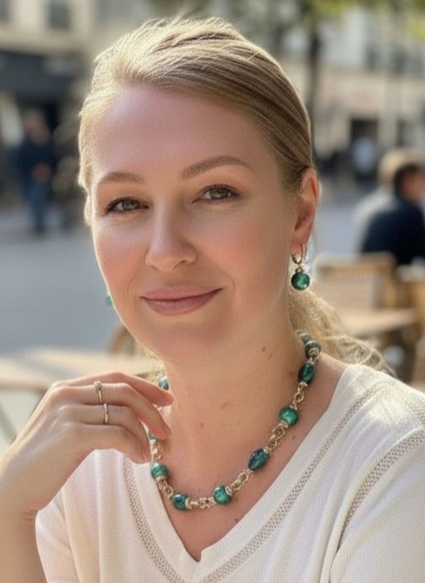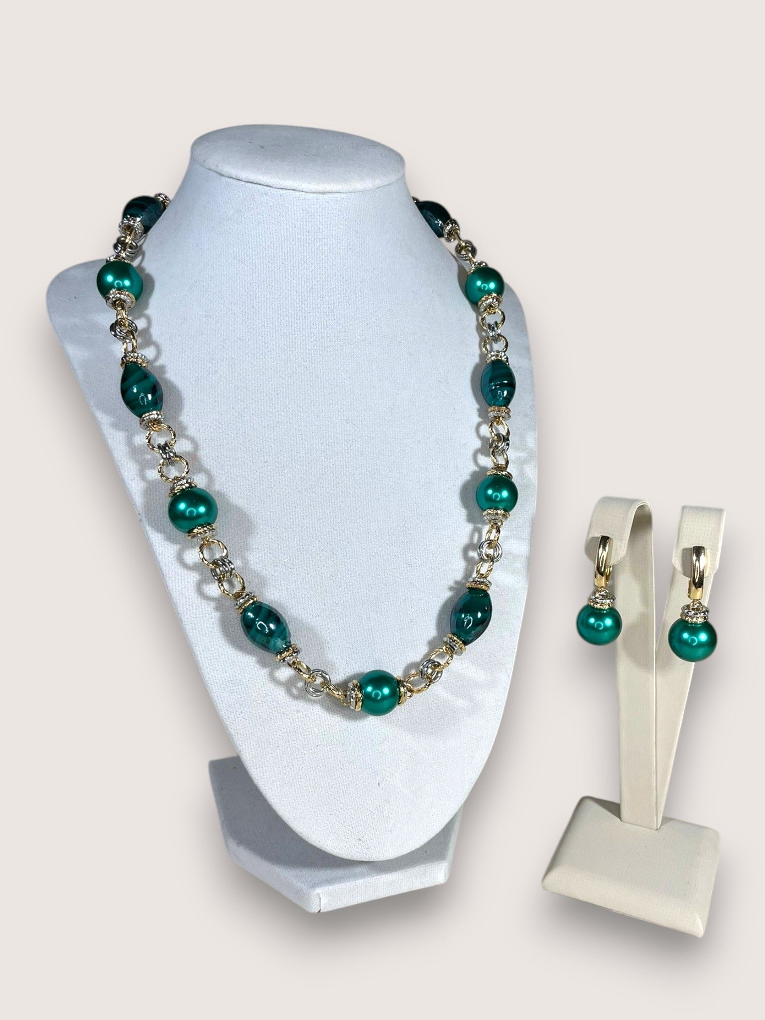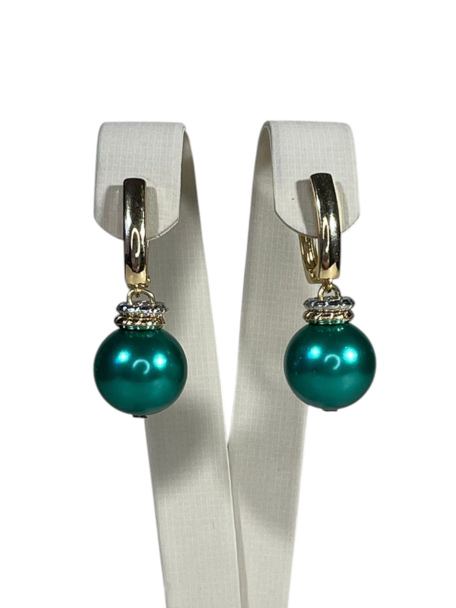 - Серьги: дополняют колье, повторяя его дизайн. Каждая серьга украшена крупной бусиной из муранского стекла, обрамлённой фурнитурой из бижутерного сплава. Длина серёг — 5 см, что делает их универсальными: они не выглядят громоздко, но при этом привлекают внимание.