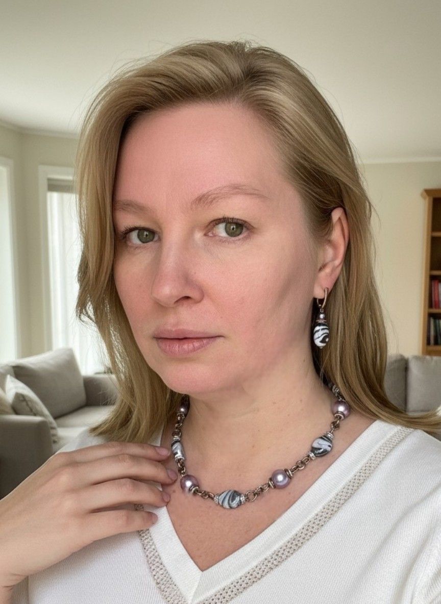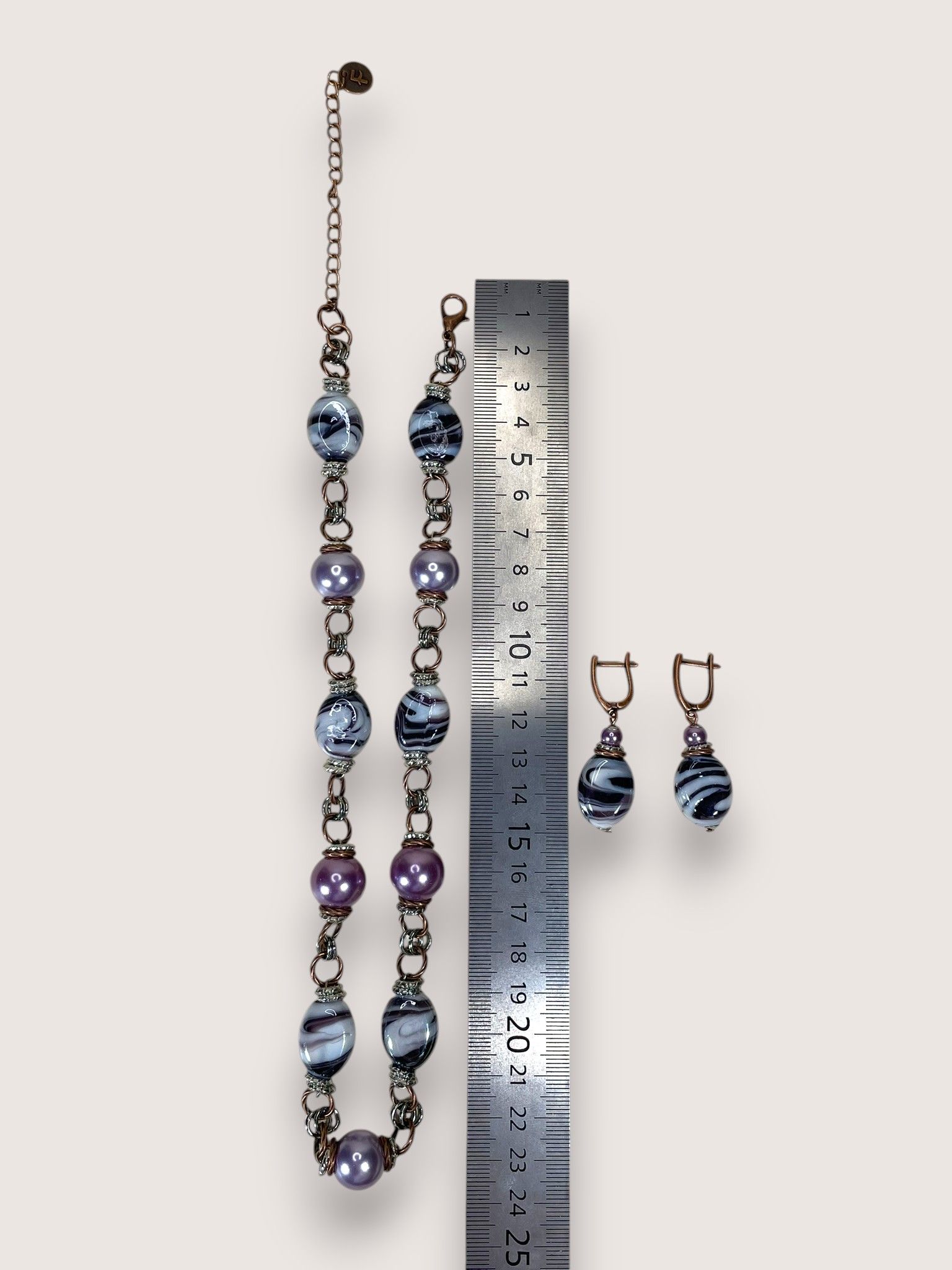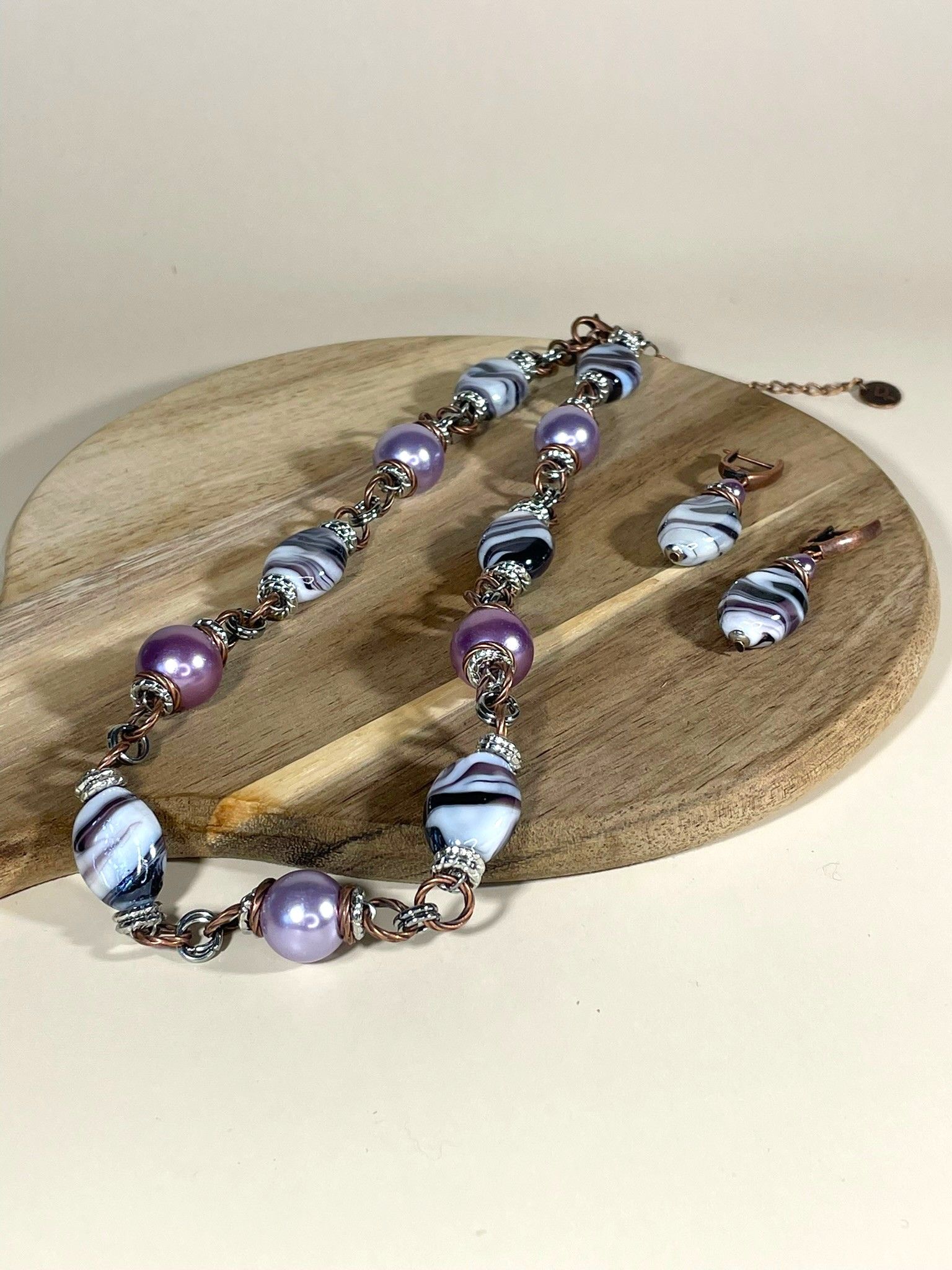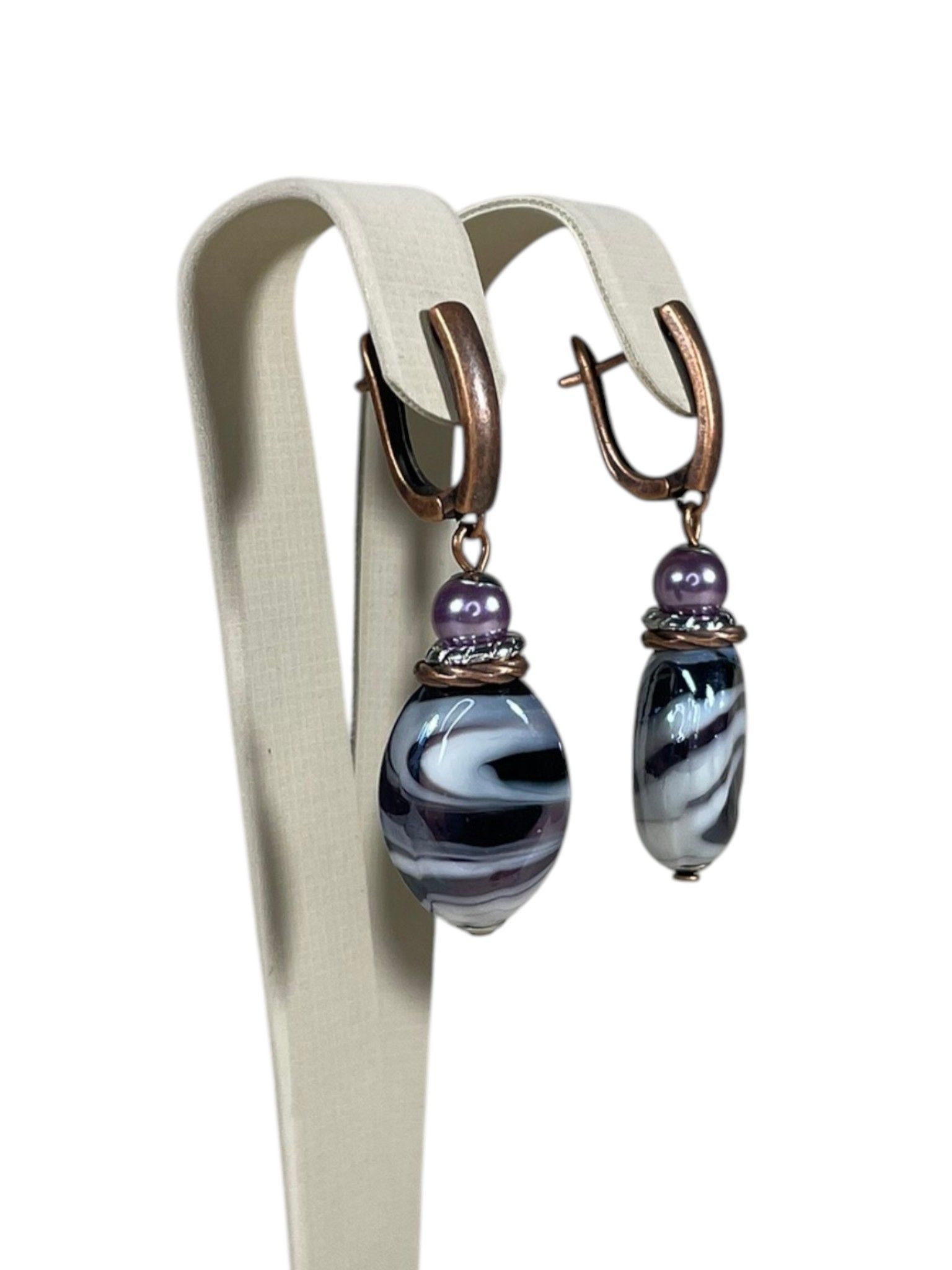 - Серьги: дополняют колье, повторяя его дизайн. Каждая серьга украшена крупной бусиной из муранского стекла, обрамлённой фурнитурой из бижутерного сплава. Длина серёг — 5 см, что делает их универсальными: они не выглядят громоздко, но при этом привлекают внимание.