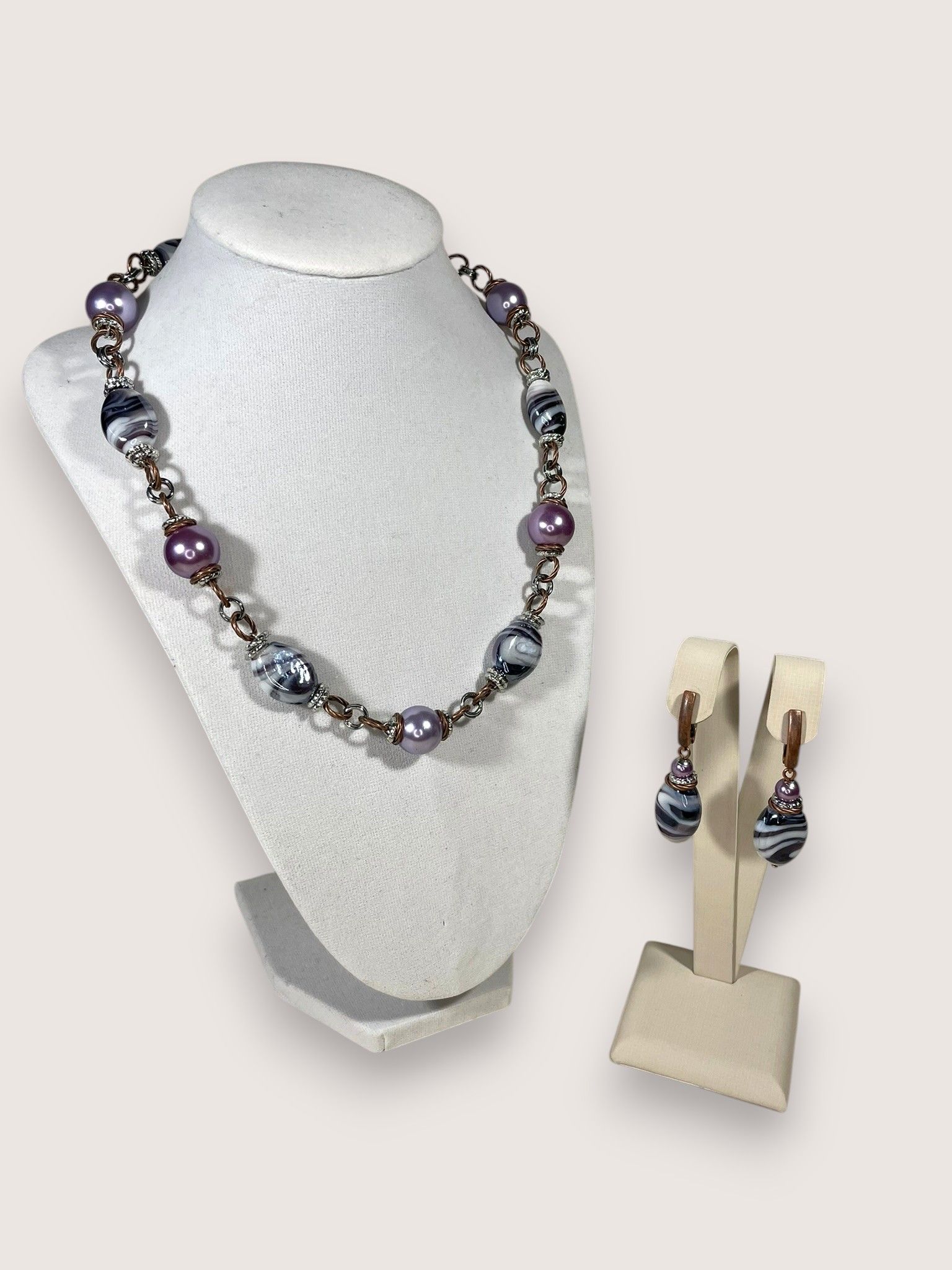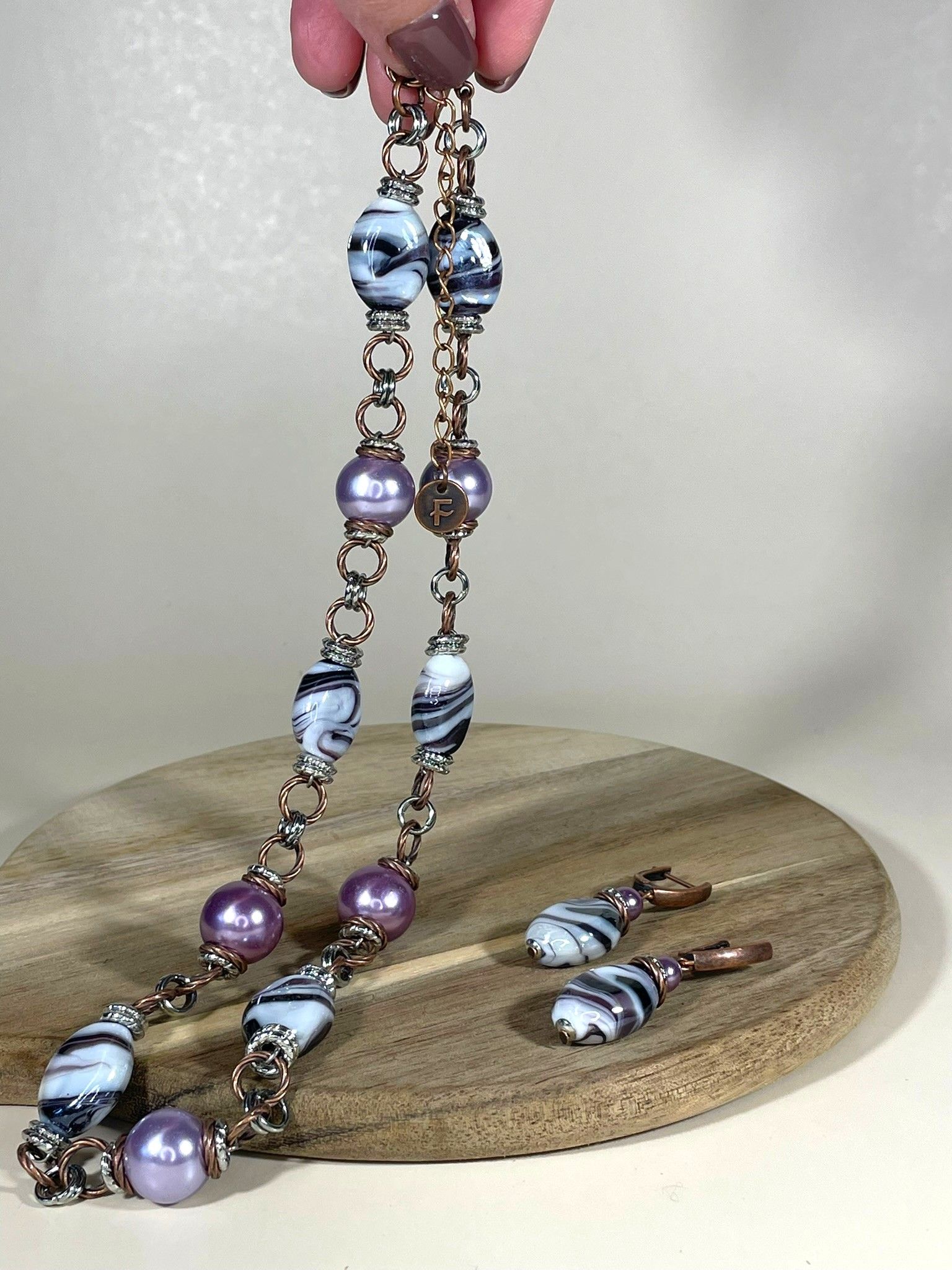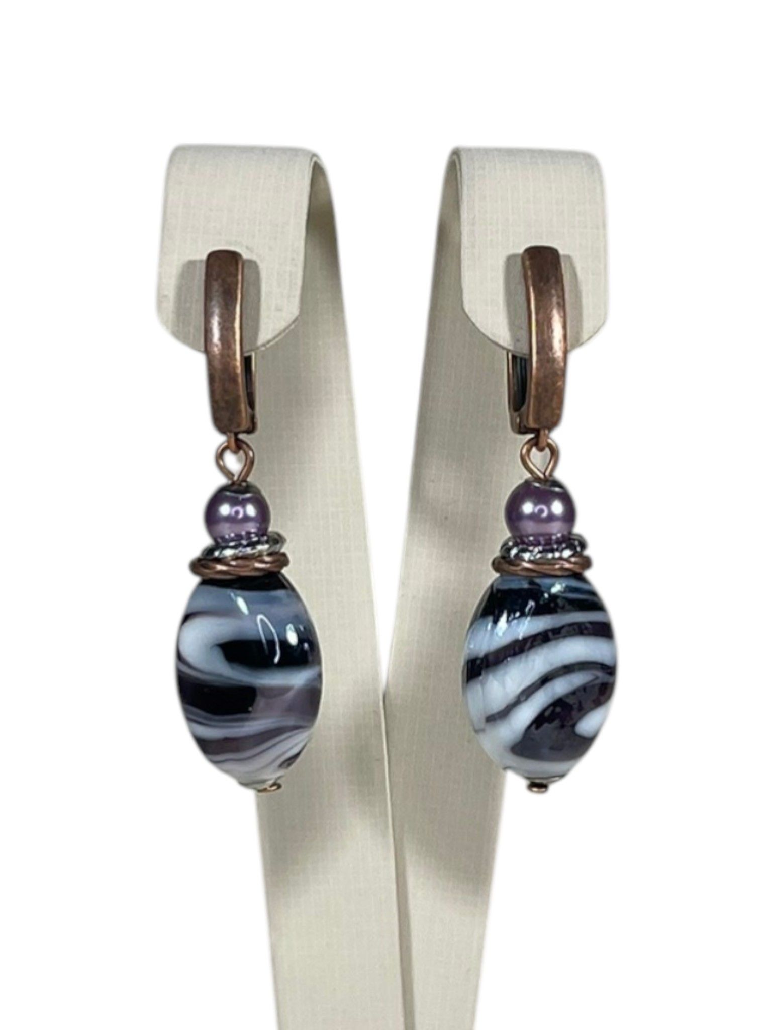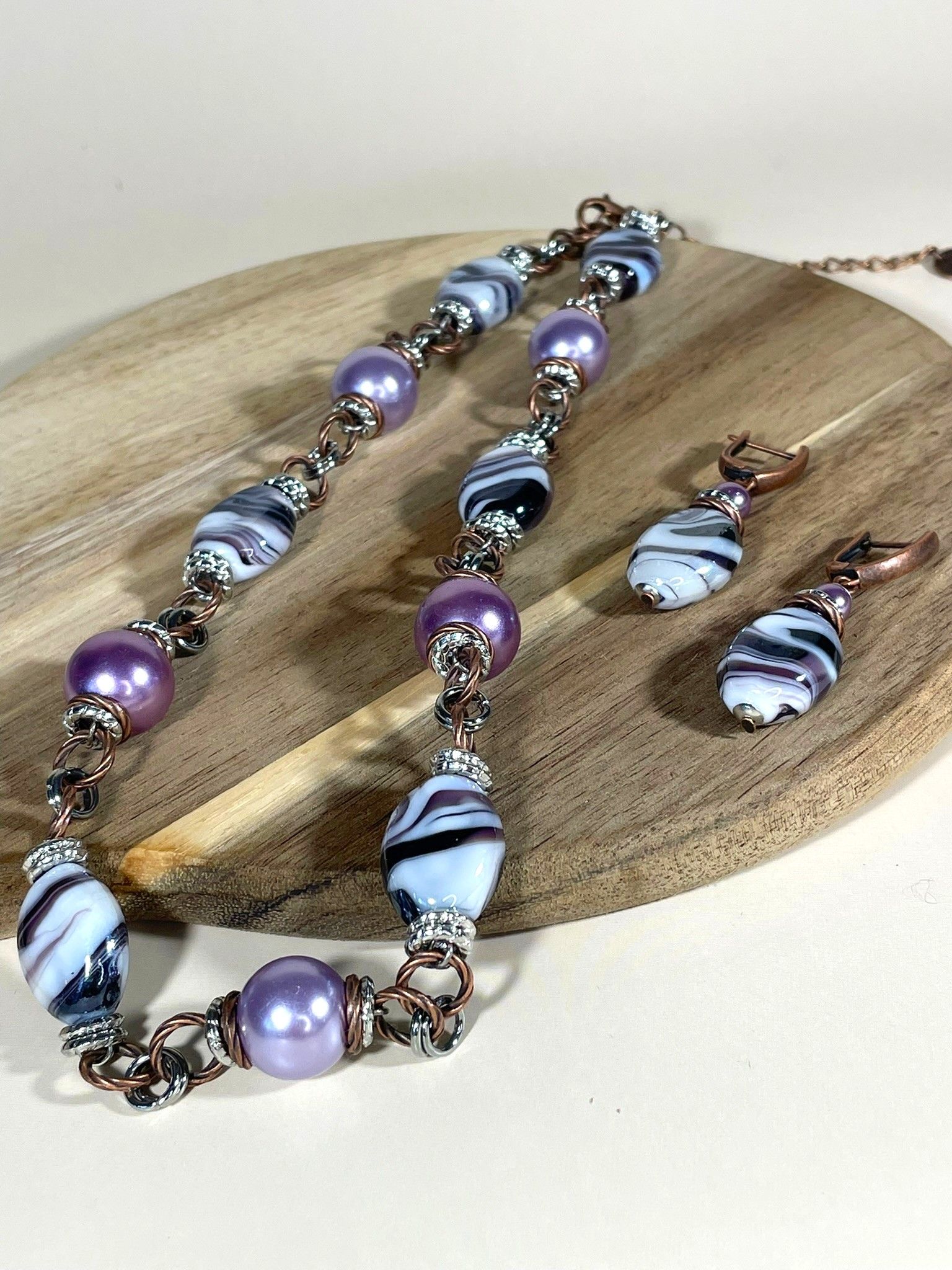 - Серьги: дополняют колье, повторяя его дизайн. Каждая серьга украшена крупной бусиной из муранского стекла, обрамлённой фурнитурой из бижутерного сплава. Длина серёг — 5 см, что делает их универсальными: они не выглядят громоздко, но при этом привлекают внимание.