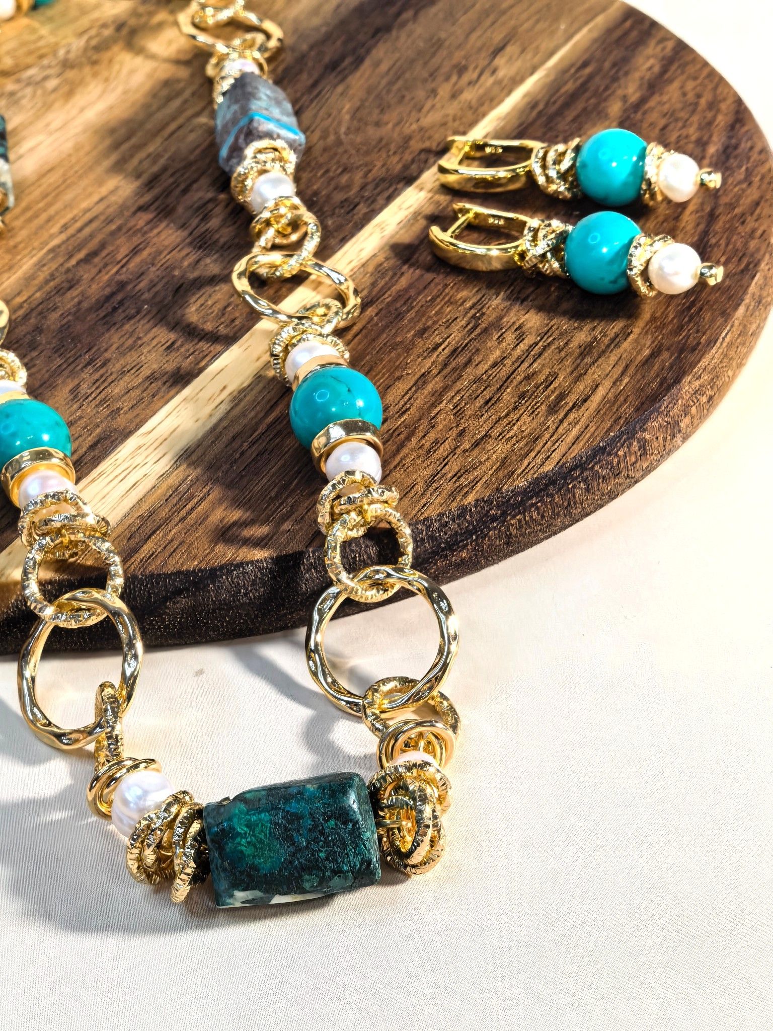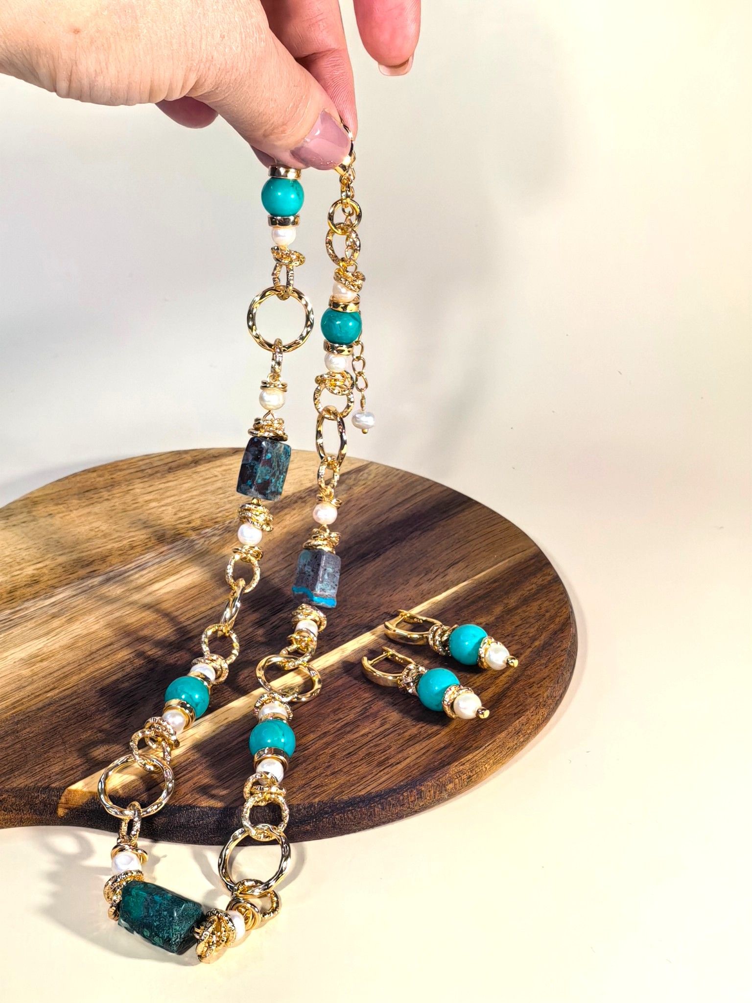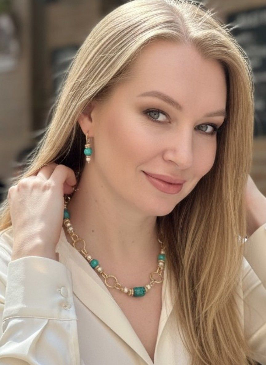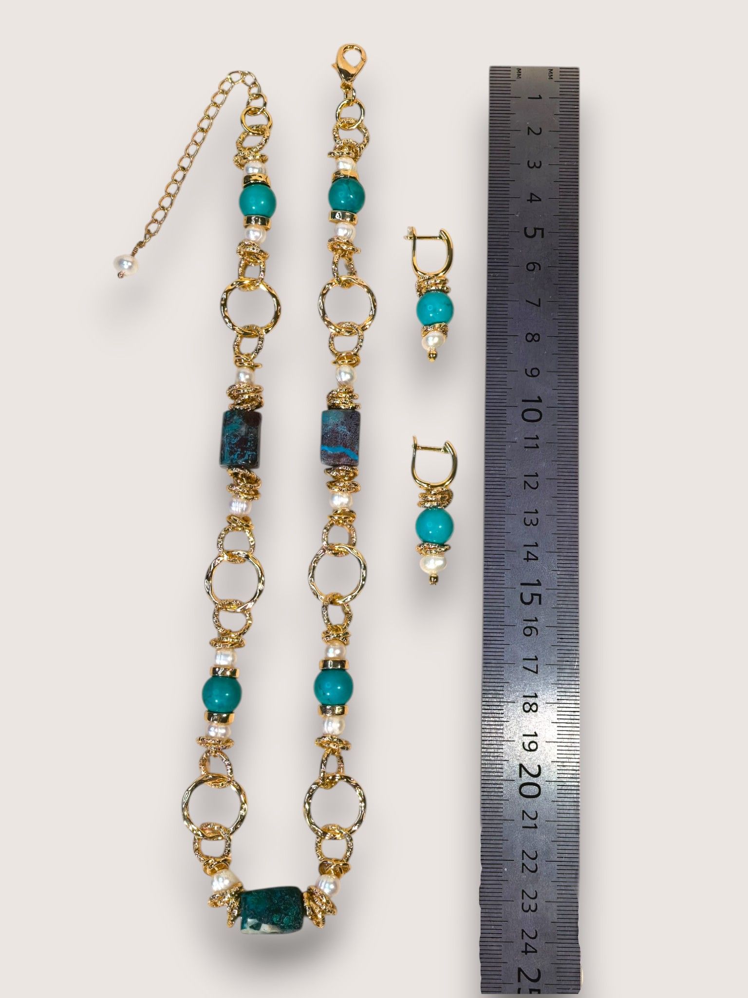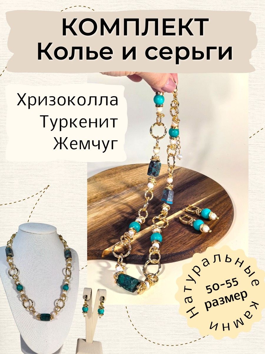 - Натуральные камни — хризоколла, туркенит, жемчуг — придают украшениям особую энергетику и индивидуальность.