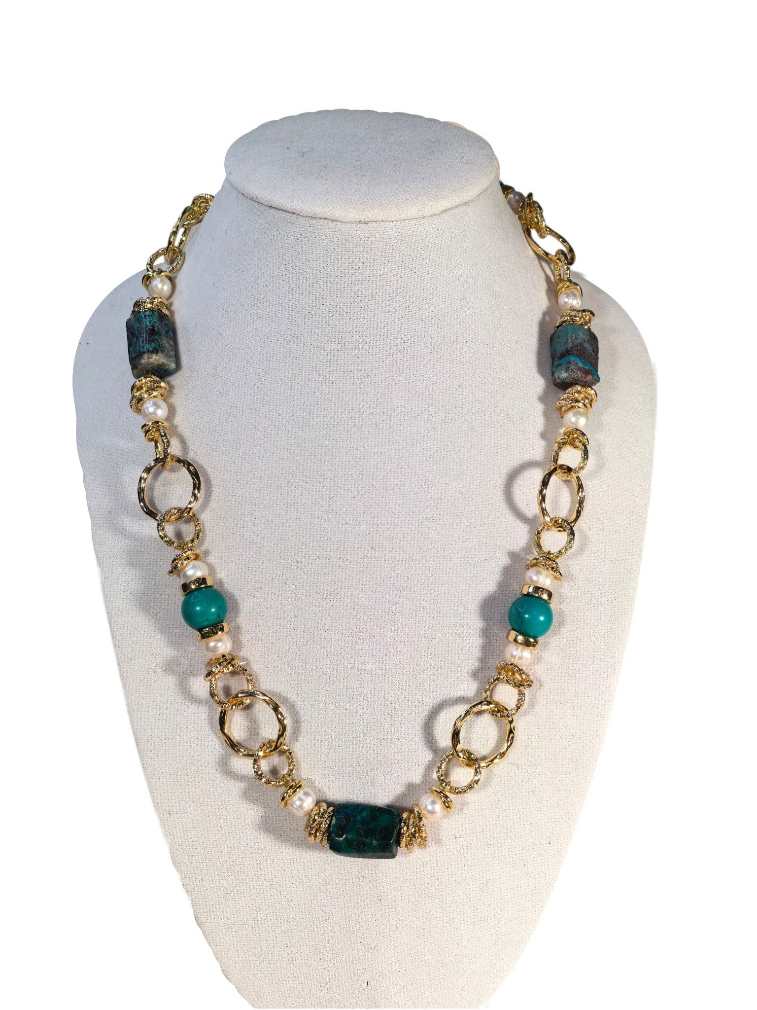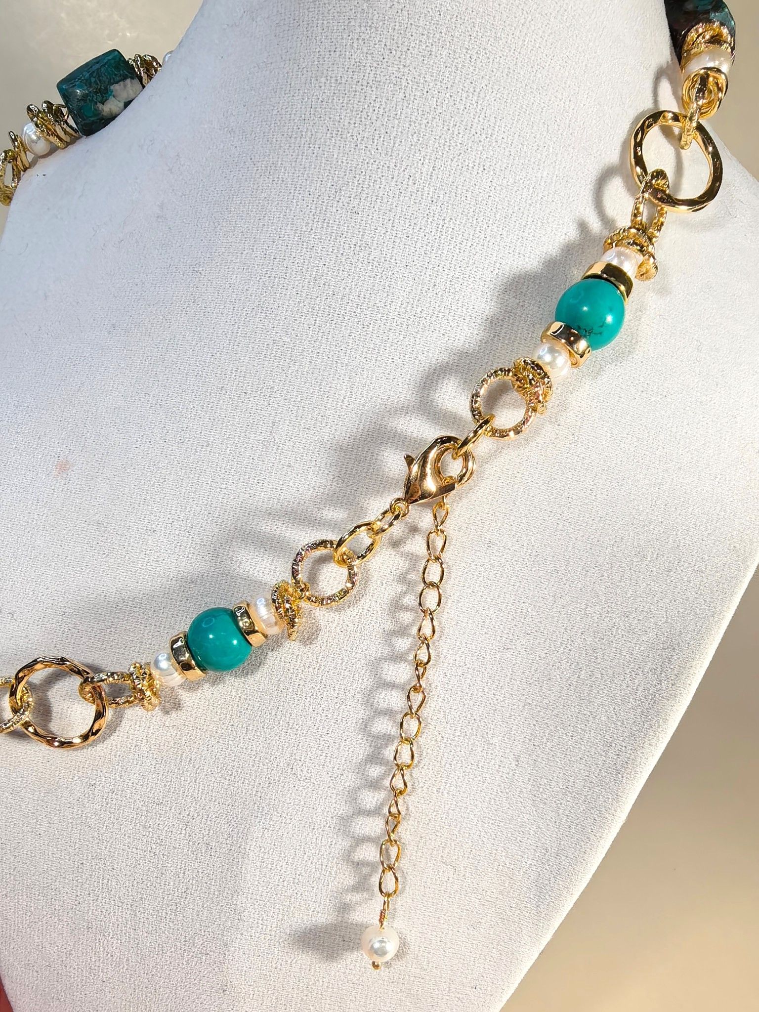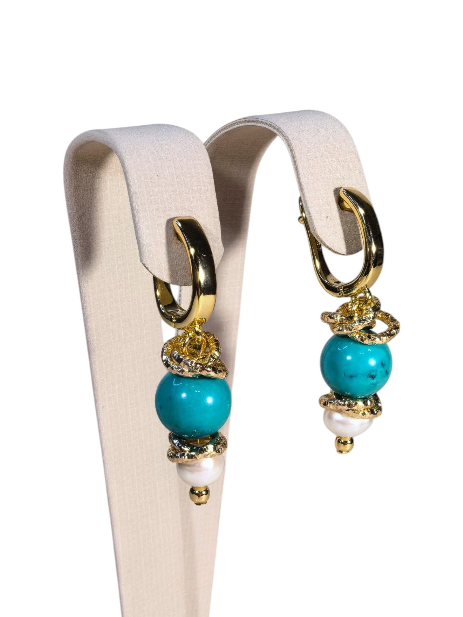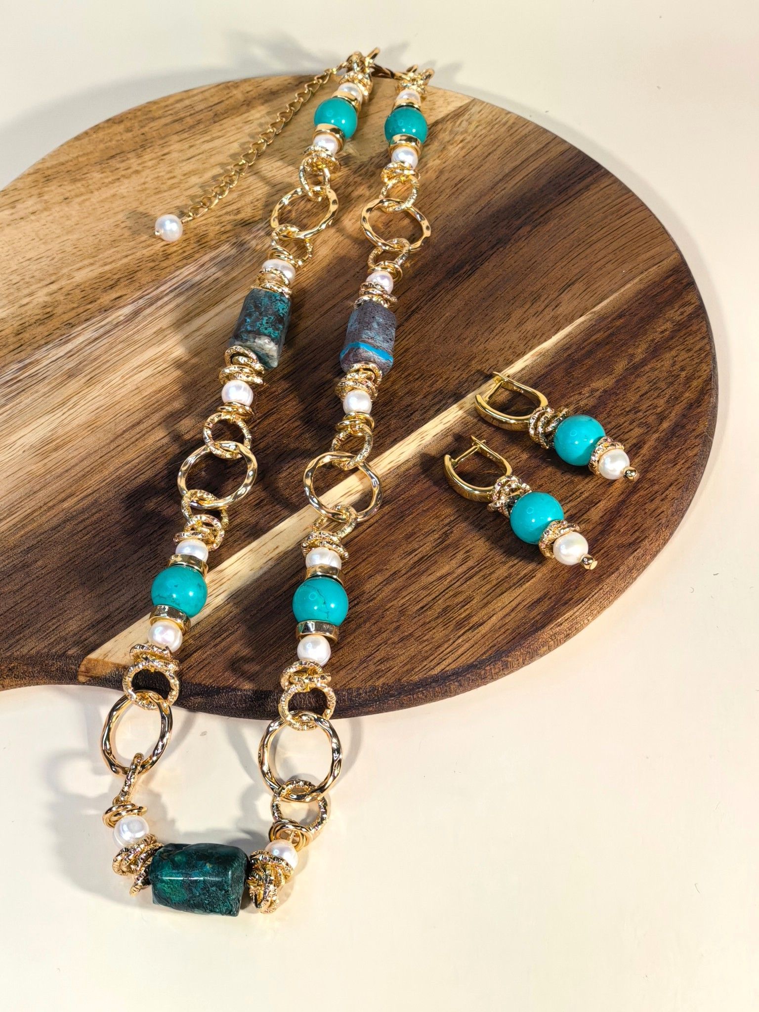 - Натуральные камни — хризоколла, туркенит, жемчуг — придают украшениям особую энергетику и индивидуальность.