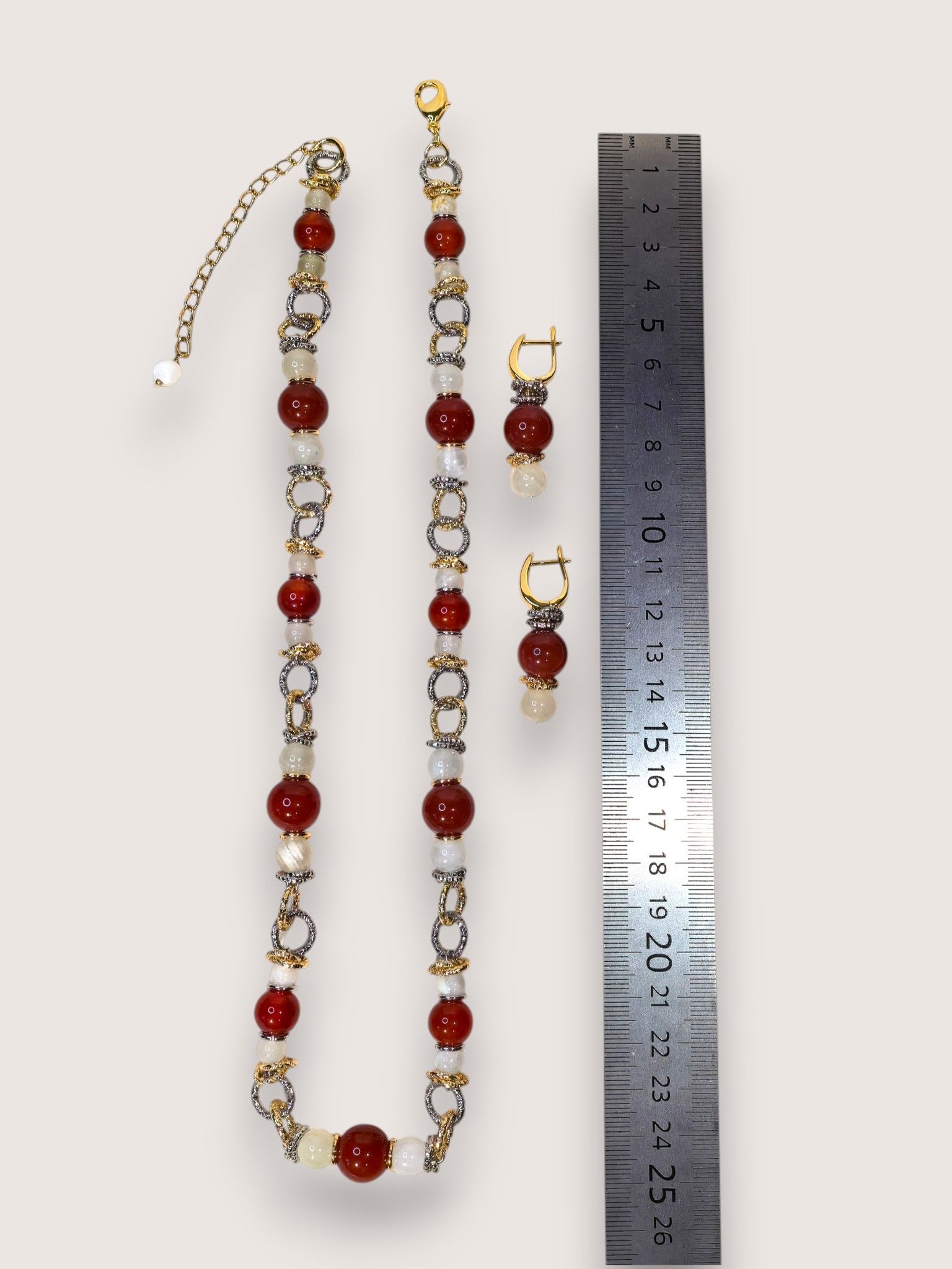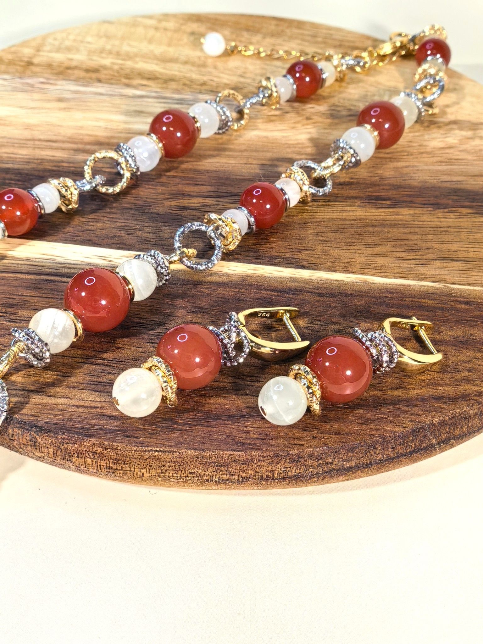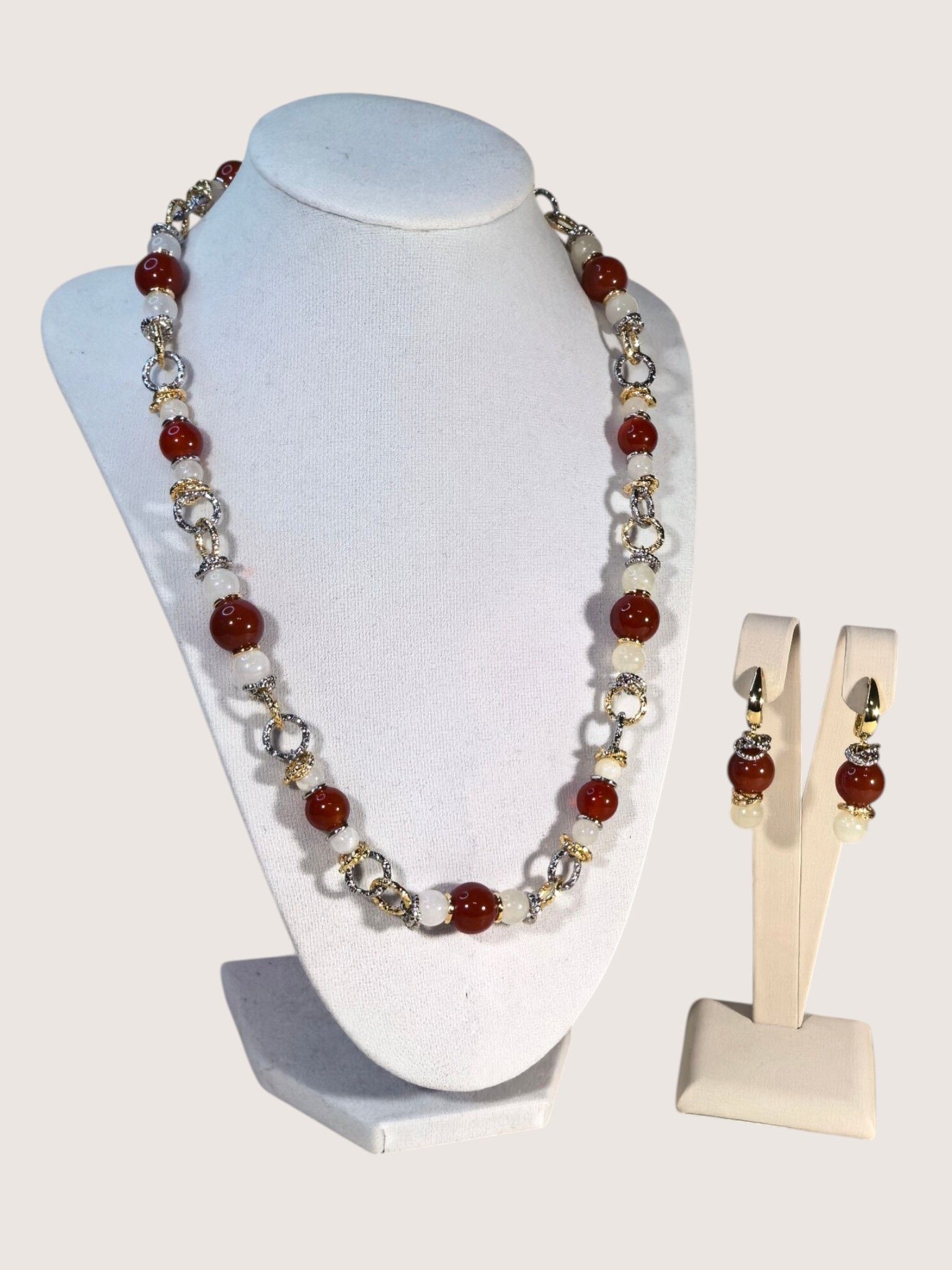 - выполнены с использованием натуральных камней (сердолик, оникс) и дополнены элементами из бижутерного сплава;