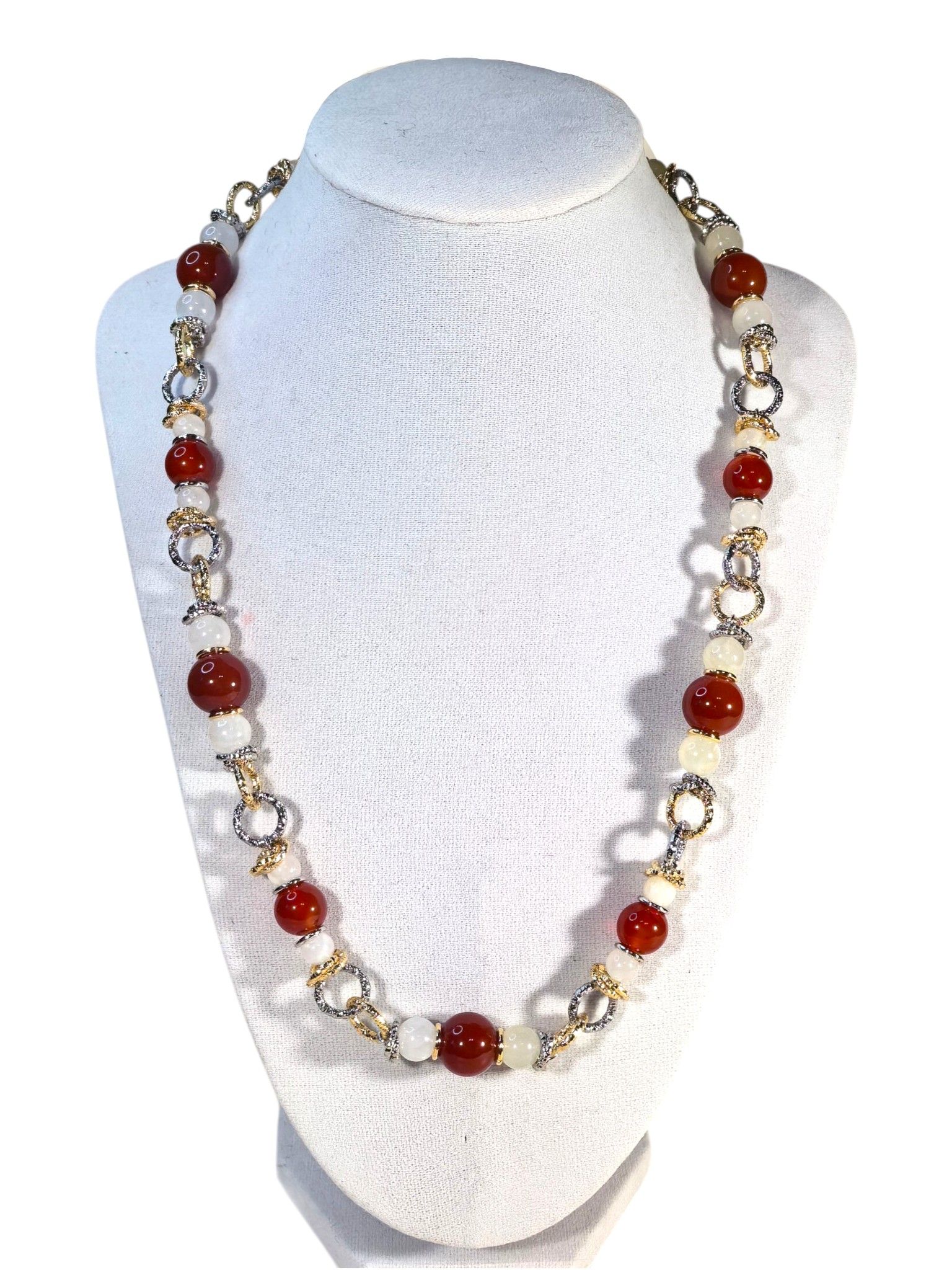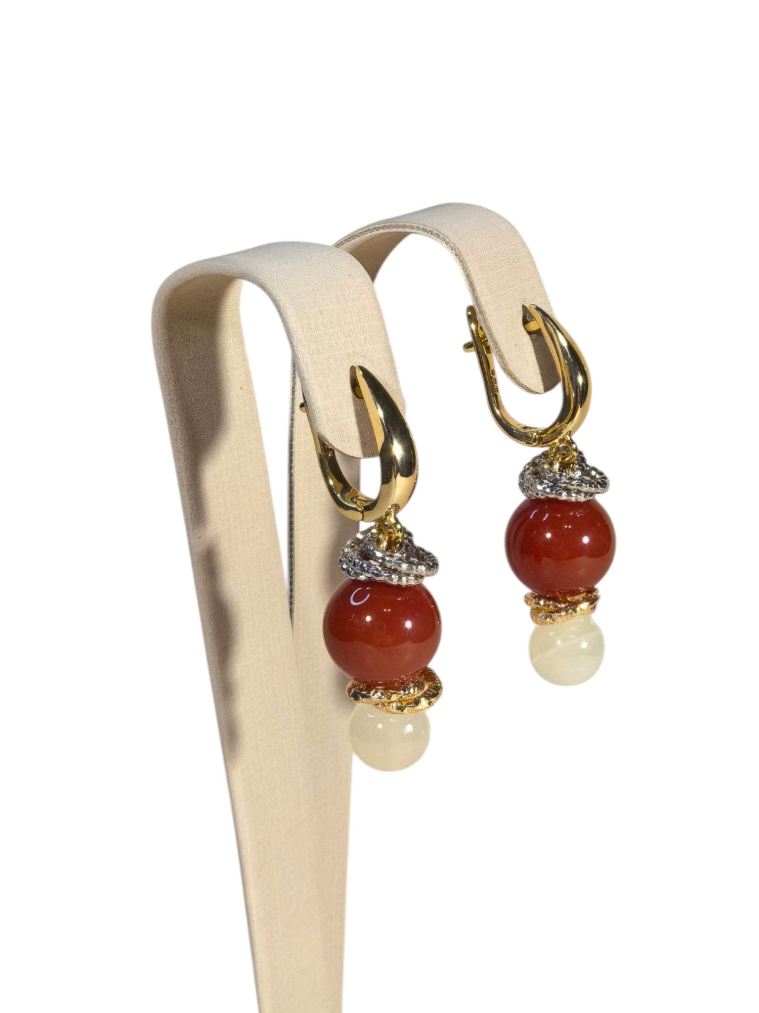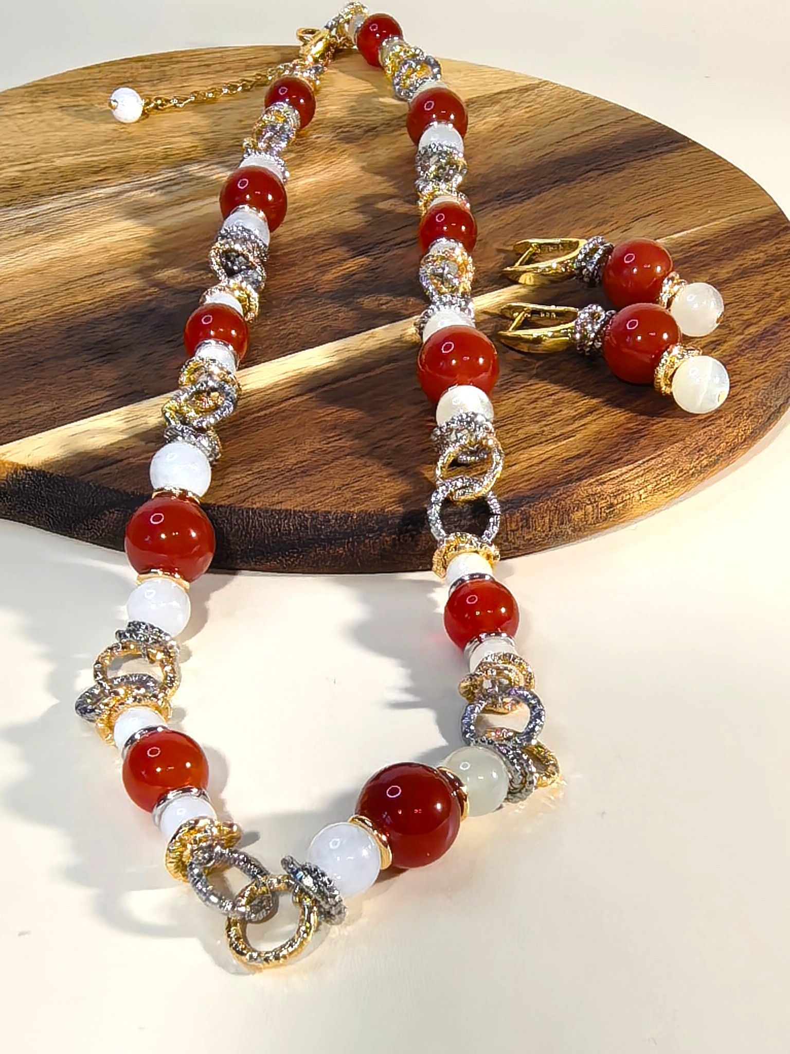 - выполнены с использованием натуральных камней (сердолик, оникс) и дополнены элементами из бижутерного сплава;