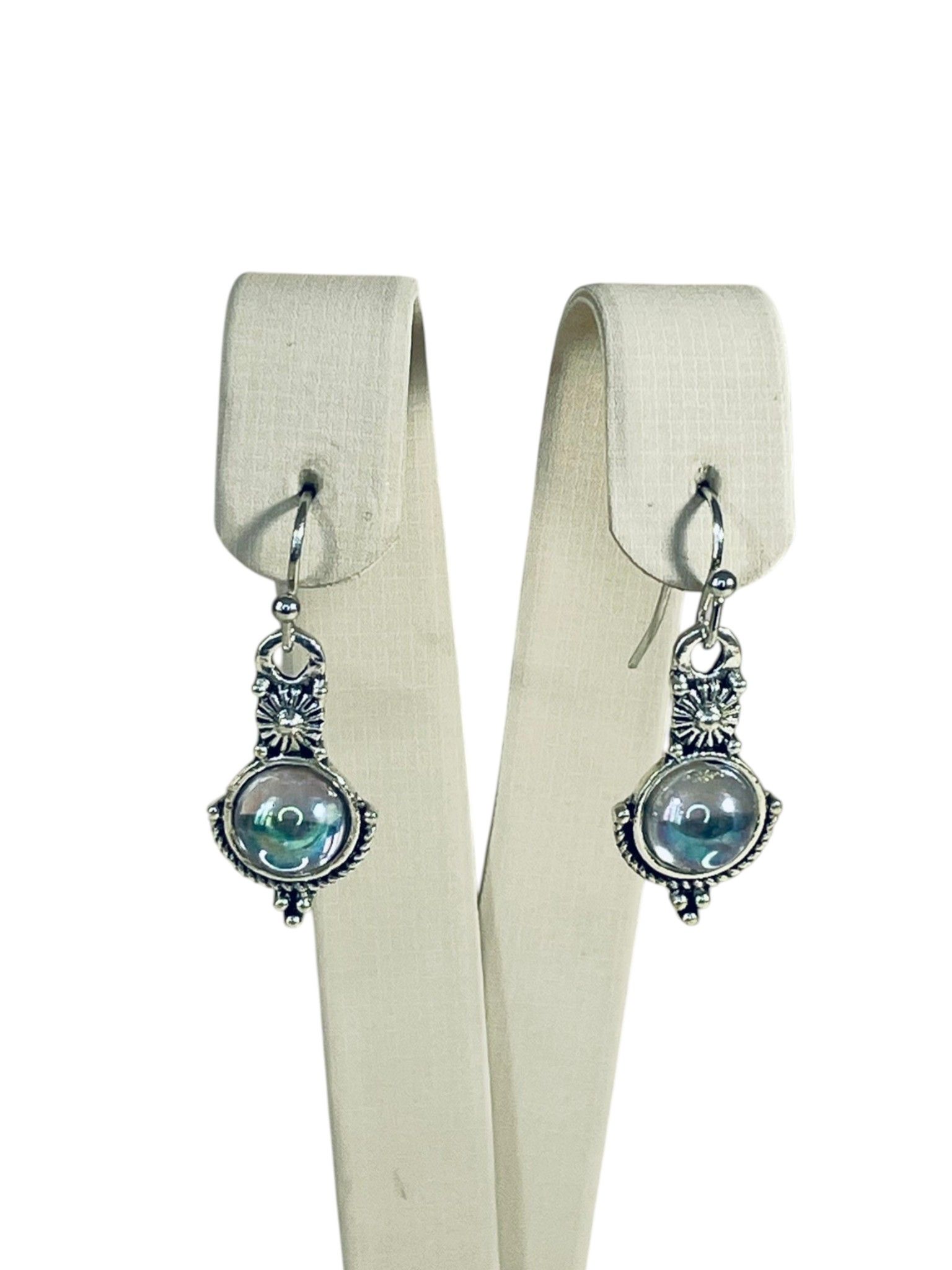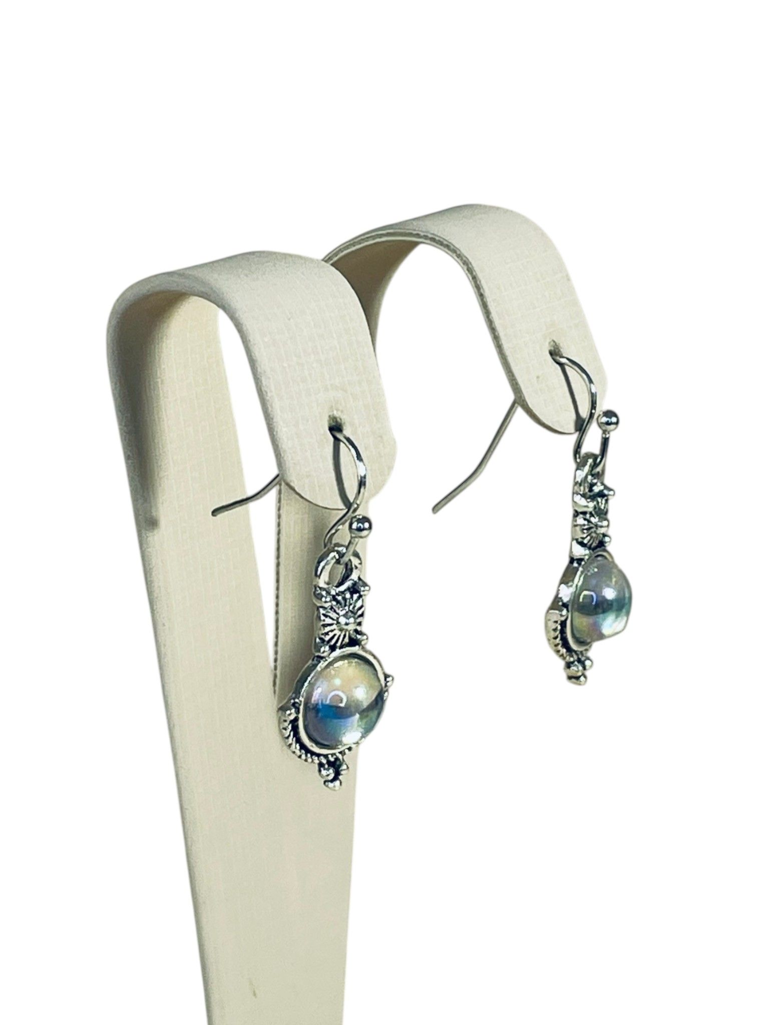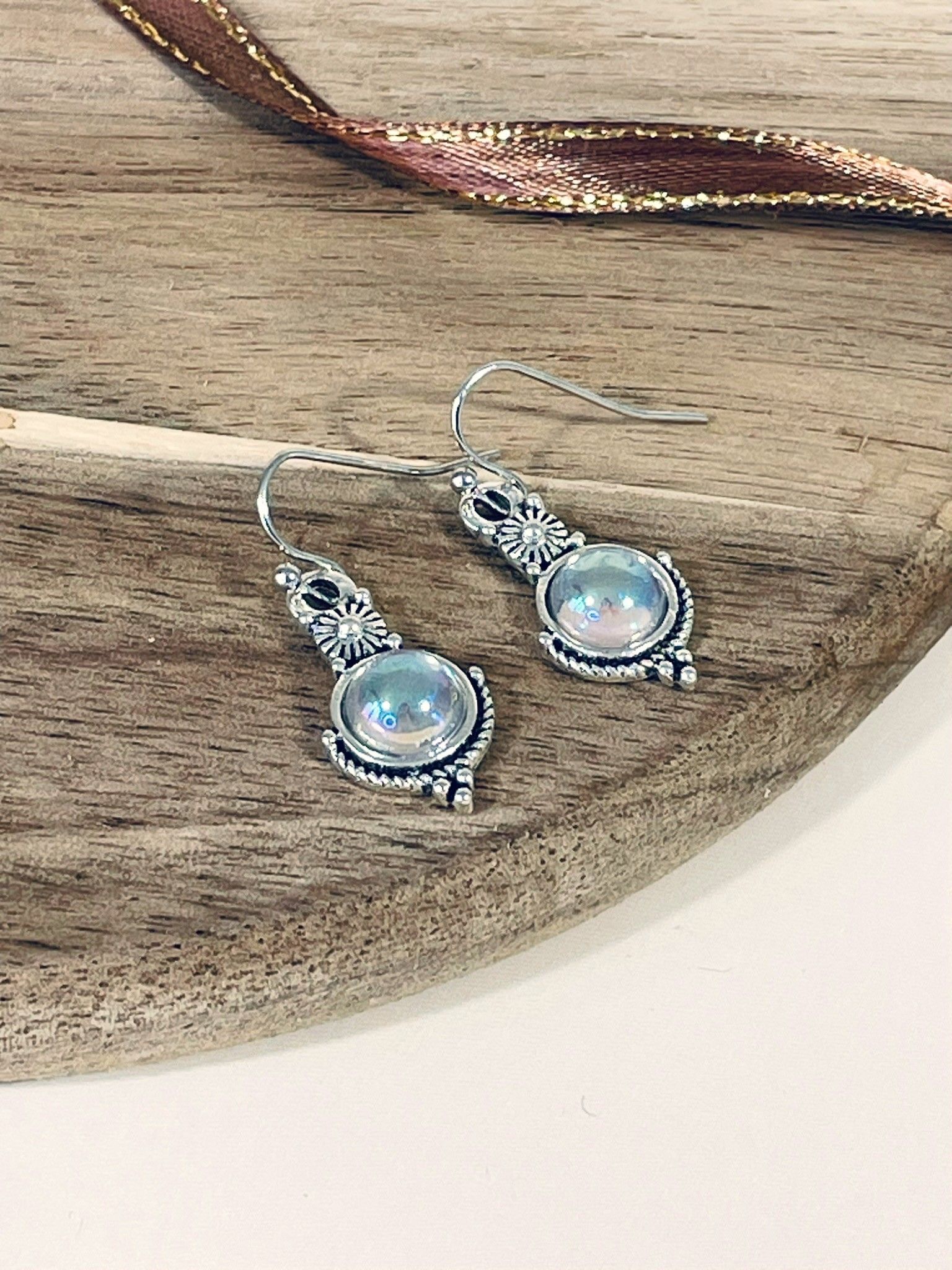 - Цвет: благородный серебристый оттенок бижутерного сплава гармонично сочетается с полупрозрачным молочно-голубым цветом центральных вставок, напоминающих лунный камень. Лёгкий перелив создаёт эффект глубины и мистики.