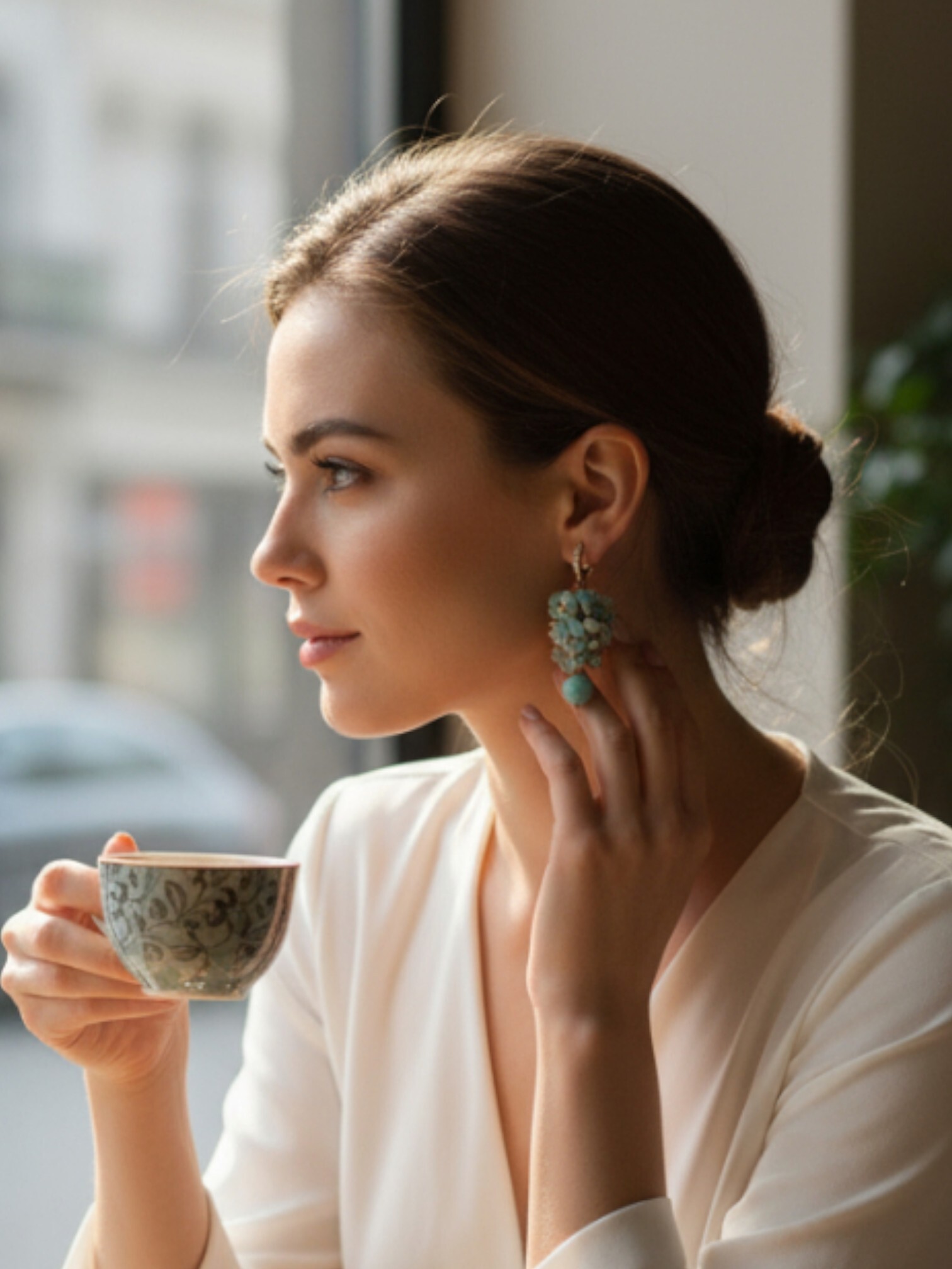 Яркий акцент стиля — эти элегантные серьги объединяют минеральный блеск амазонита и холодное свечение фианитов. Гроздевой дизайн создаёт эффект легкой игривости, идеально сочетающейся с любым образом. Массивные элементы выглядят гармонично благодаря тщательному балансу форм и цветовой палитры.