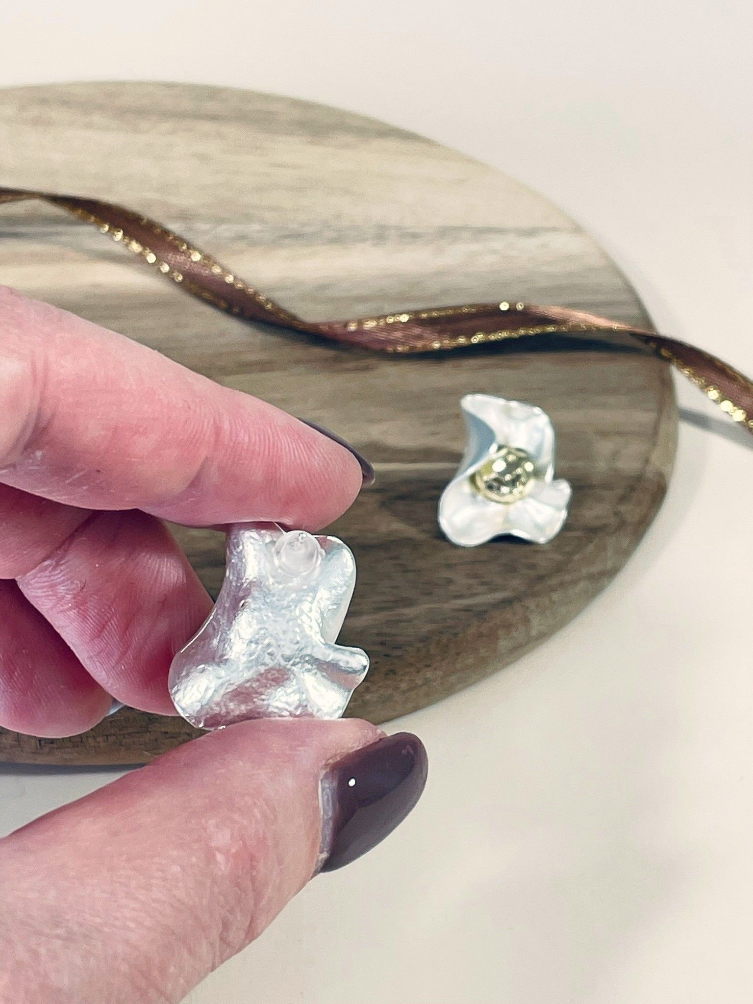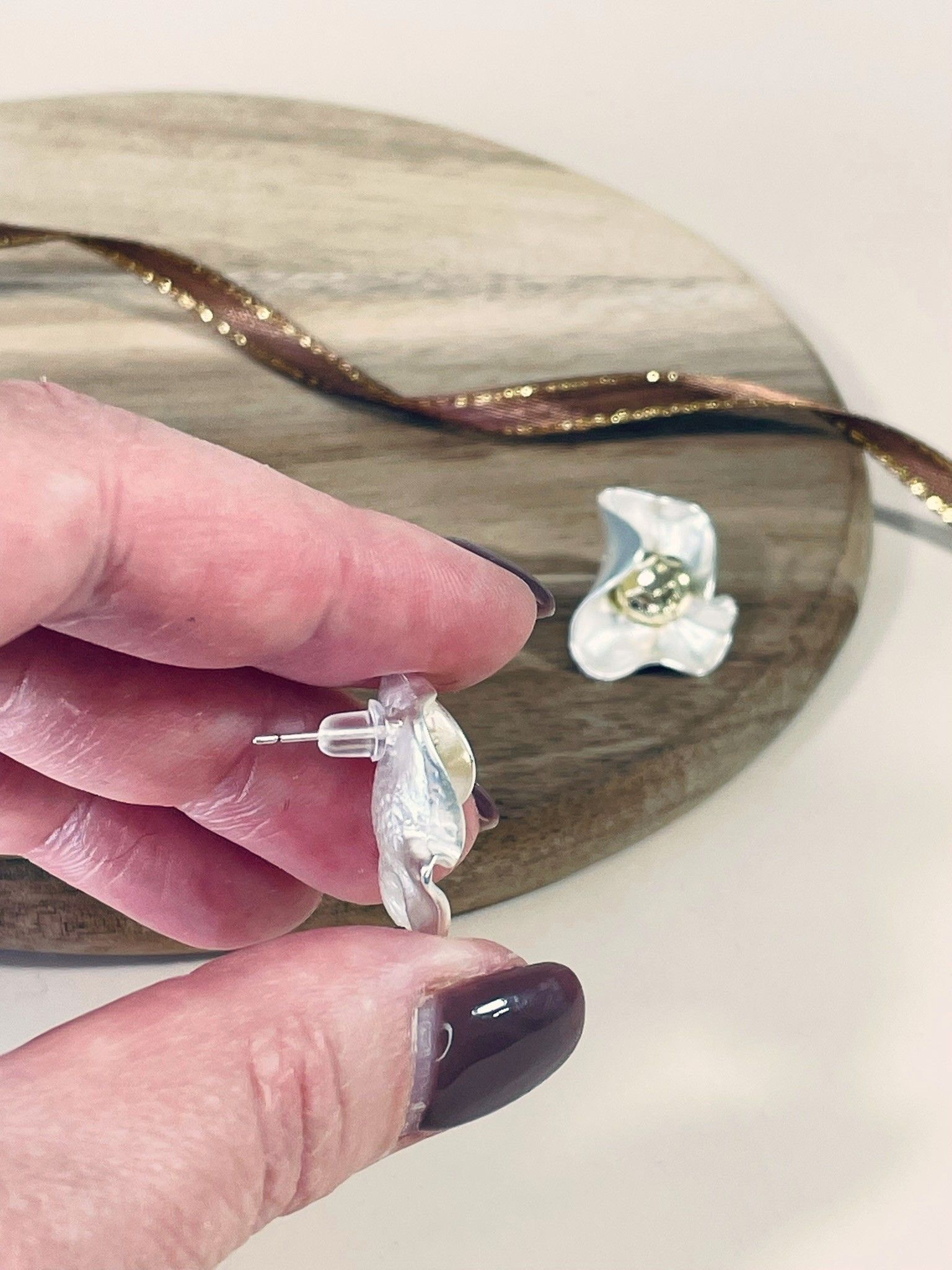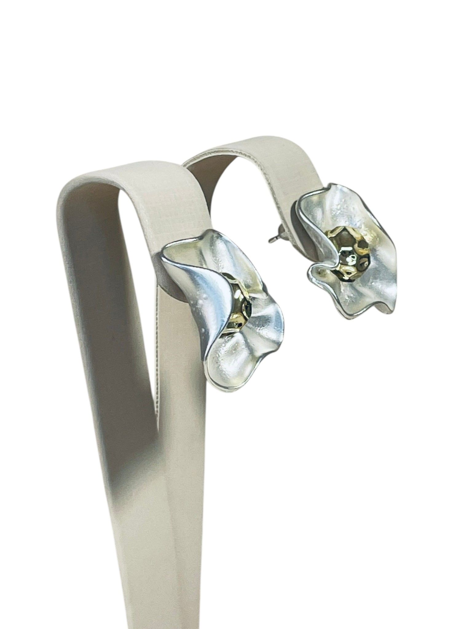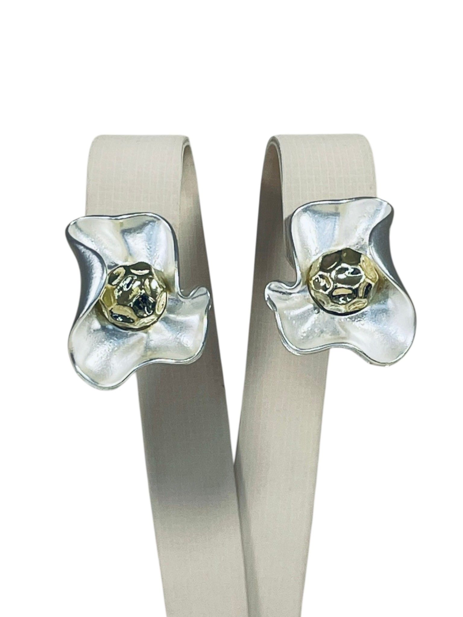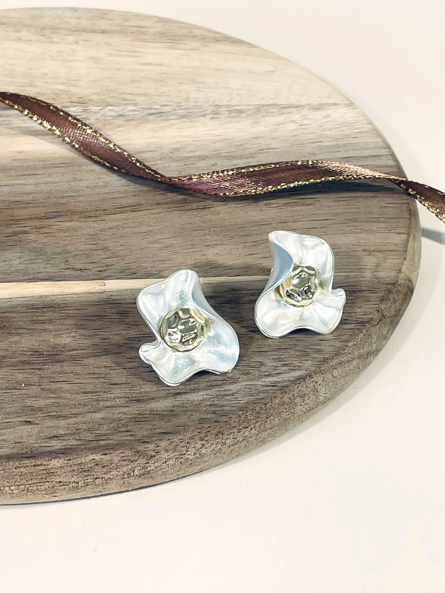 - Цвет: сочетание благородного серебристого оттенка (бижутерный сплав с лаковым покрытием) и тёплого золотистого центра. Серебристые «лепестки» выглядят свежо и лаконично, а золотистая сердцевина придаёт серьгам изысканность и глубину.
