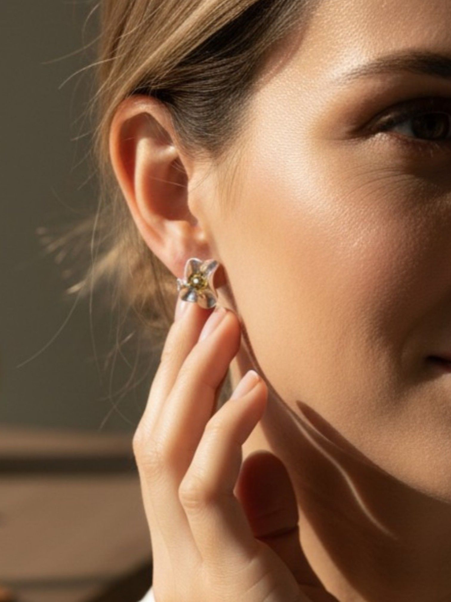- Форма: серьги выполнены в виде стилизованного цветка с плавными, слегка асимметричными лепестками. Центральная часть оформлена в виде объёмной «сердцевины» с фактурной поверхностью, напоминающей структуру настоящего цветка. Компактная форма делает украшение универсальным — оно подойдёт как для повседневного ношения, так и для особых случаев.
