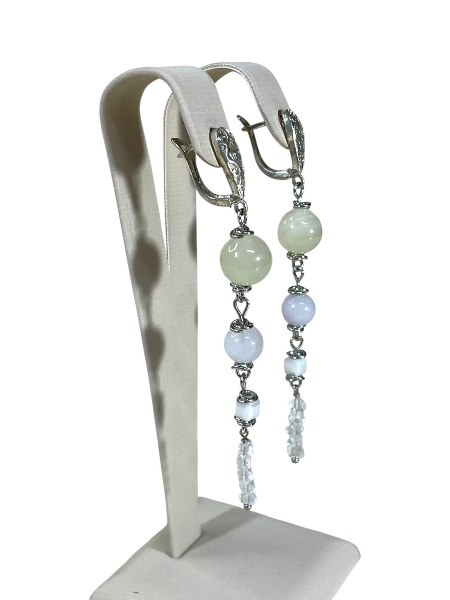 Описание: Эти длинные серьги выполнены в элегантном дизайне. Верхняя часть украшена крупным ониксом нежного молочно-белого оттенка, который плавно переходит в аквамарин с легким голубоватым отливом. Камни соединены изящными металлическими элементами, создающими ощущение легкости и воздушности. Завершают композицию прозрачные кристаллы, добавляющие блеска и завершенности.