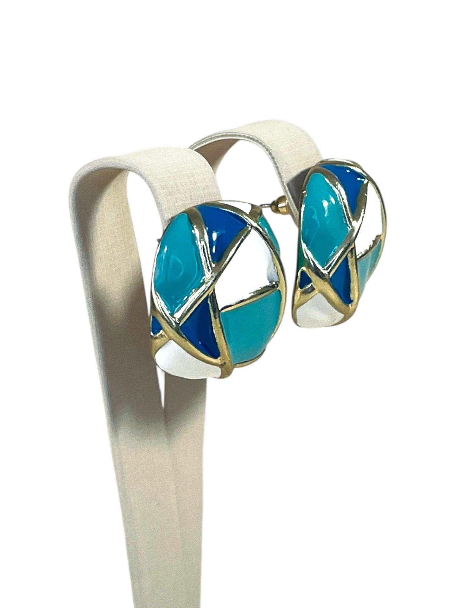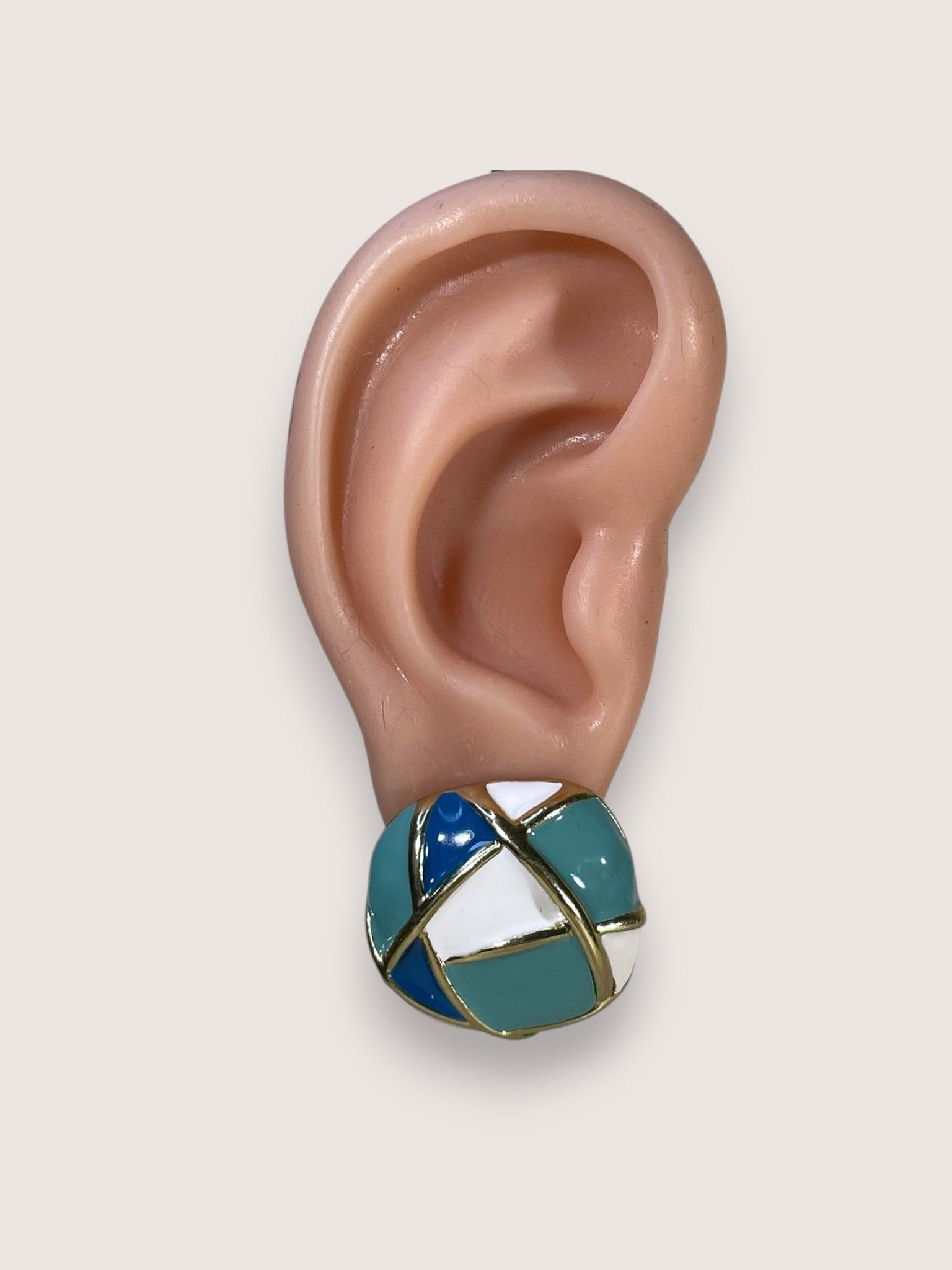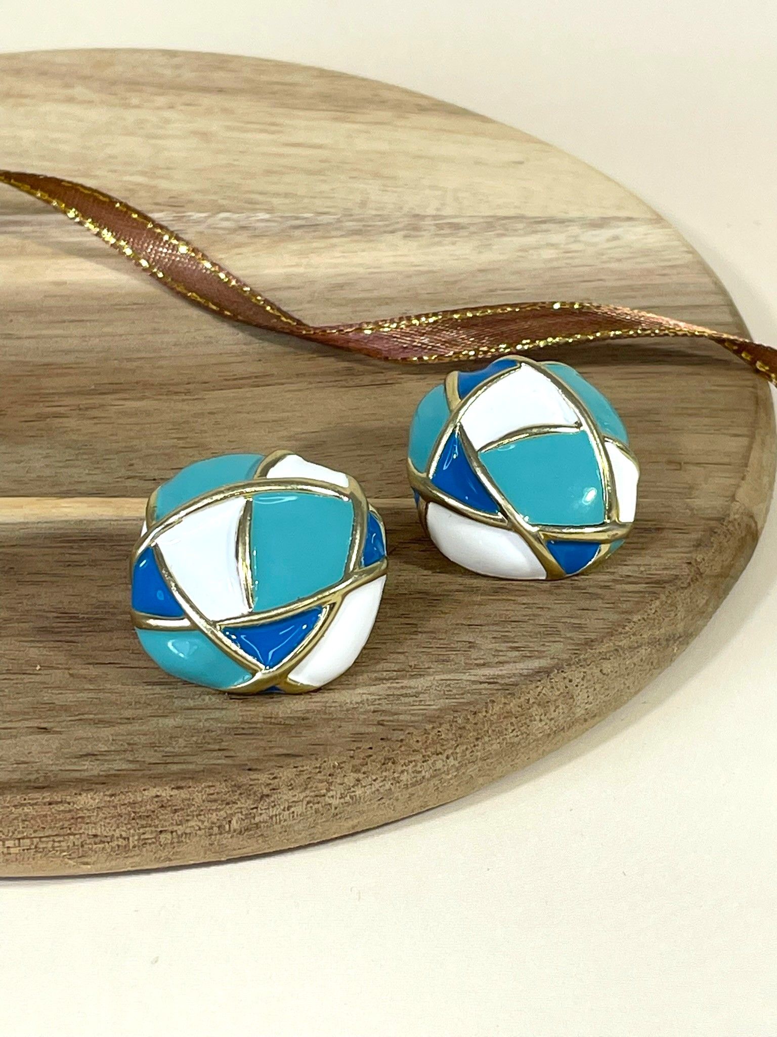 - Форма: округлая, слегка приплюснутая, с геометрическим узором в виде пересекающихся линий. Эти линии выполнены из бижутерного сплава с золотистым покрытием и делят поверхность серьги на разноцветные сегменты, создавая эффект мозаики. Форма одновременно лаконична и выразительна — такие серьги точно привлекут внимание.