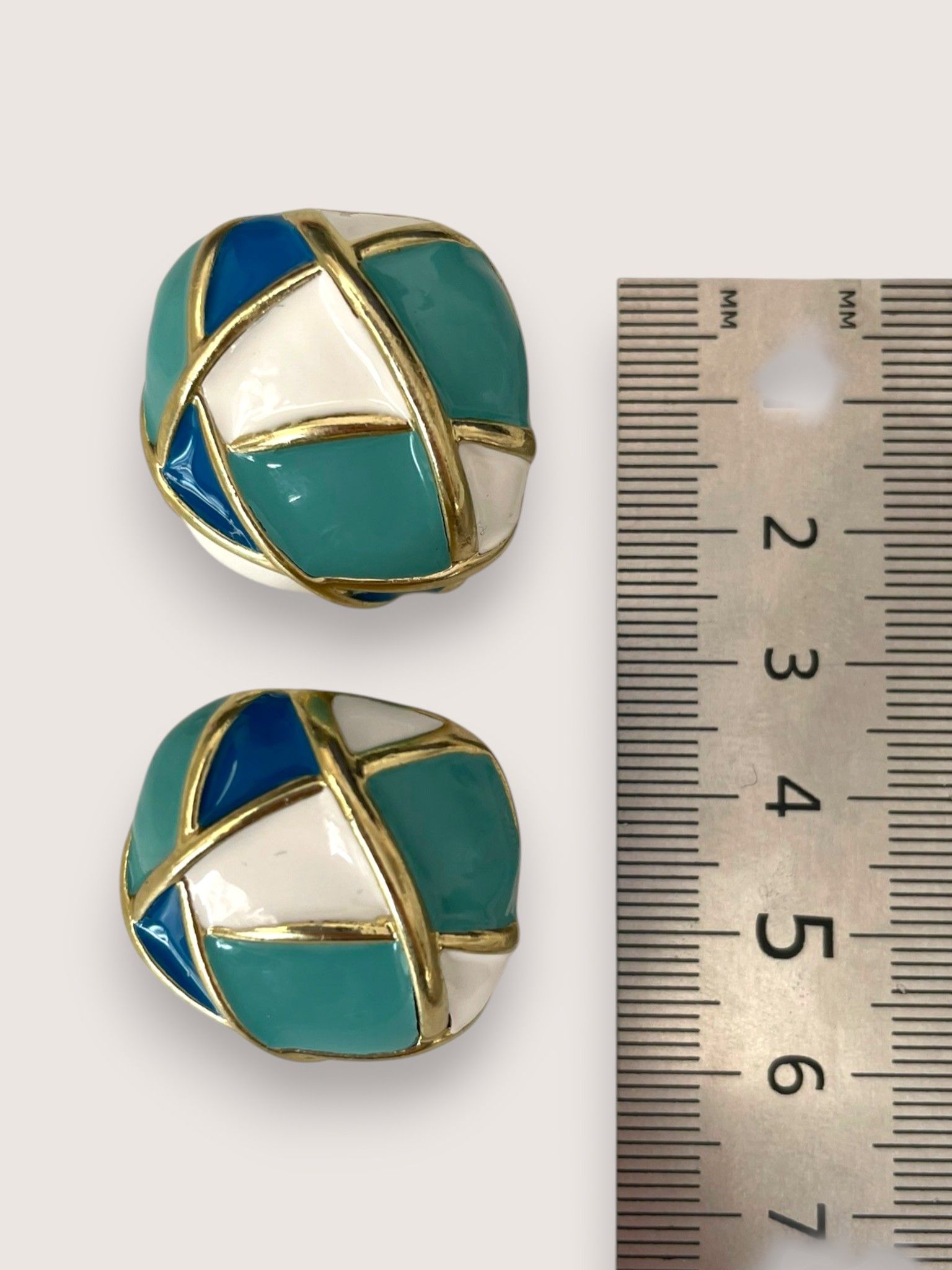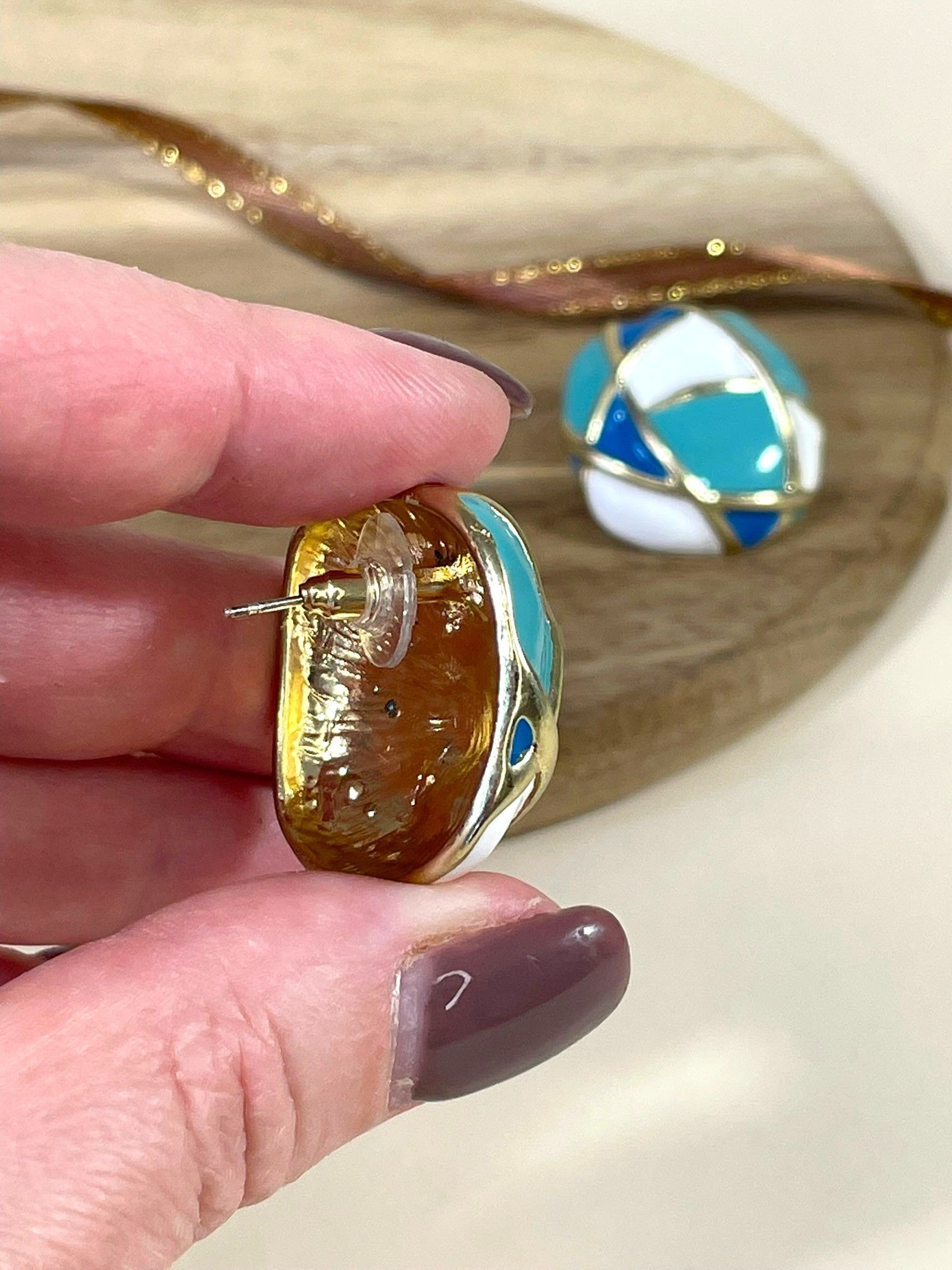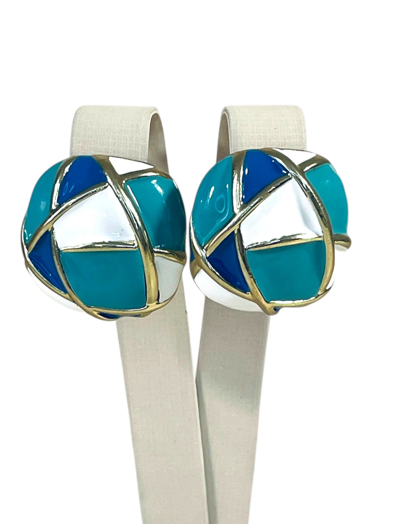 - Форма: округлая, слегка приплюснутая, с геометрическим узором в виде пересекающихся линий. Эти линии выполнены из бижутерного сплава с золотистым покрытием и делят поверхность серьги на разноцветные сегменты, создавая эффект мозаики. Форма одновременно лаконична и выразительна — такие серьги точно привлекут внимание.