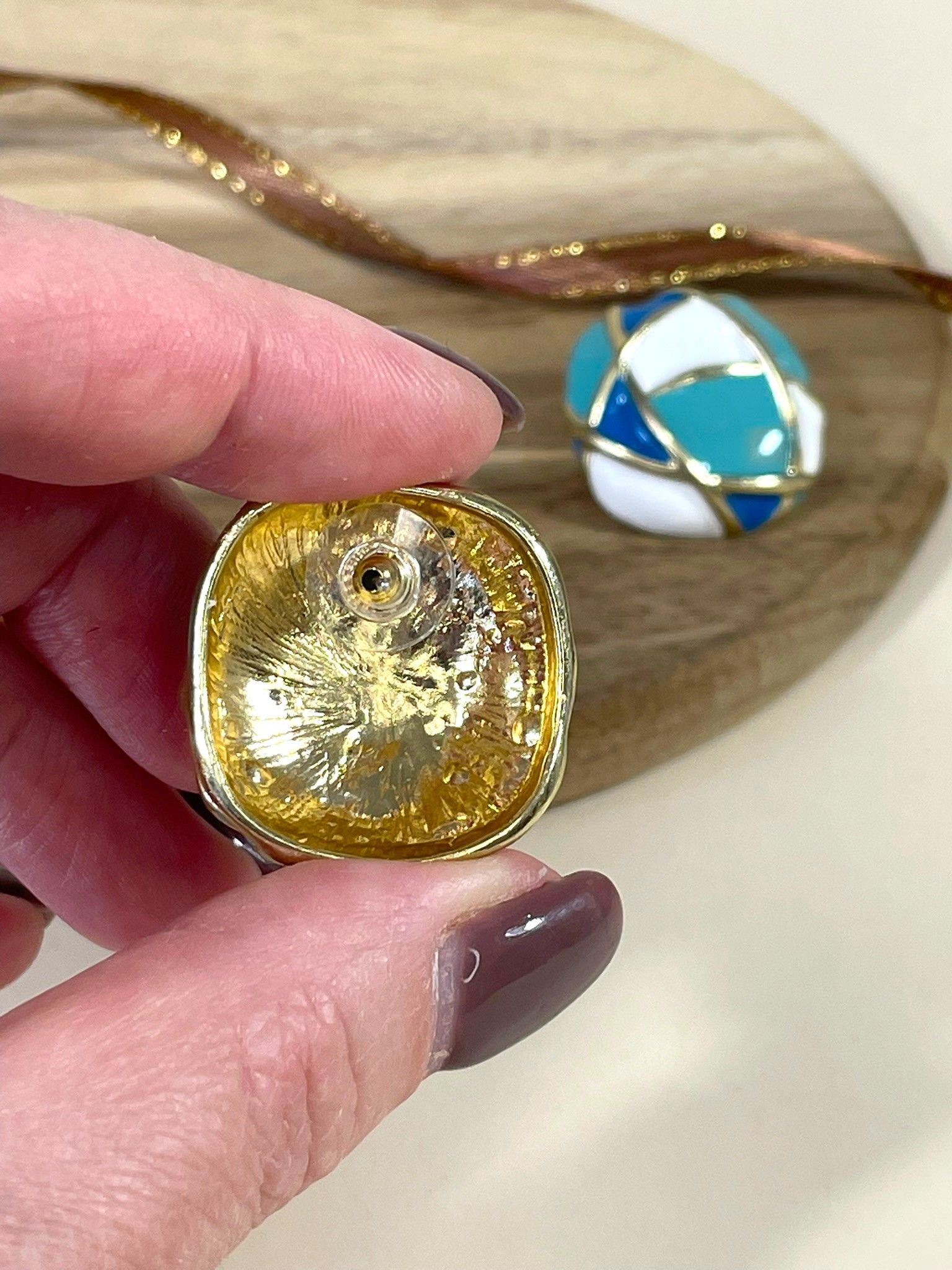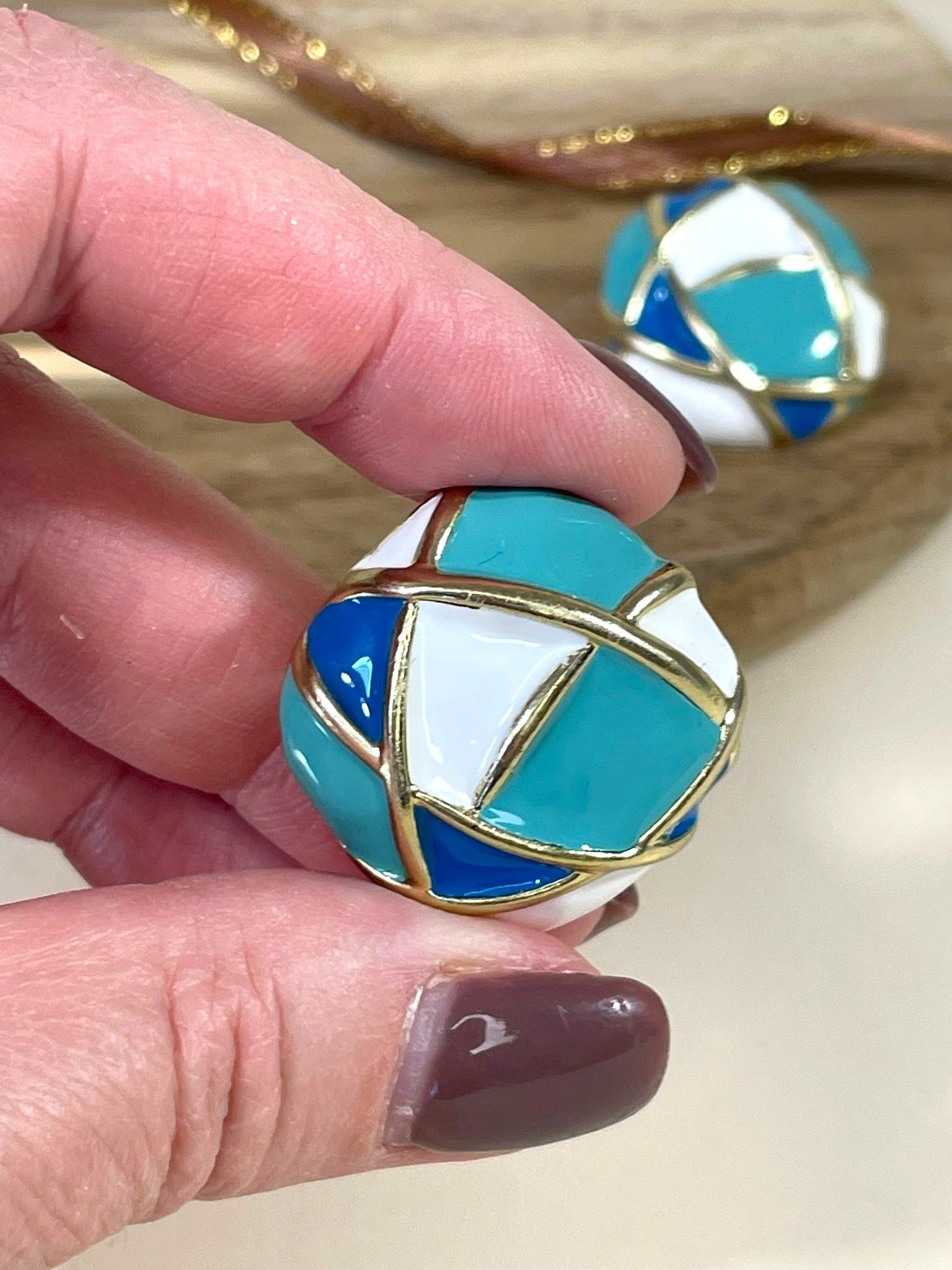 - Цвет: яркая комбинация трёх оттенков — насыщенного бирюзового, глубокого синего и чистого белого. Сочетание цветов напоминает морскую волну или мозаику прибрежных камней, создавая ощущение лёгкости и динамики. Золотистые контуры эмали придают украшению изысканность и завершённость.