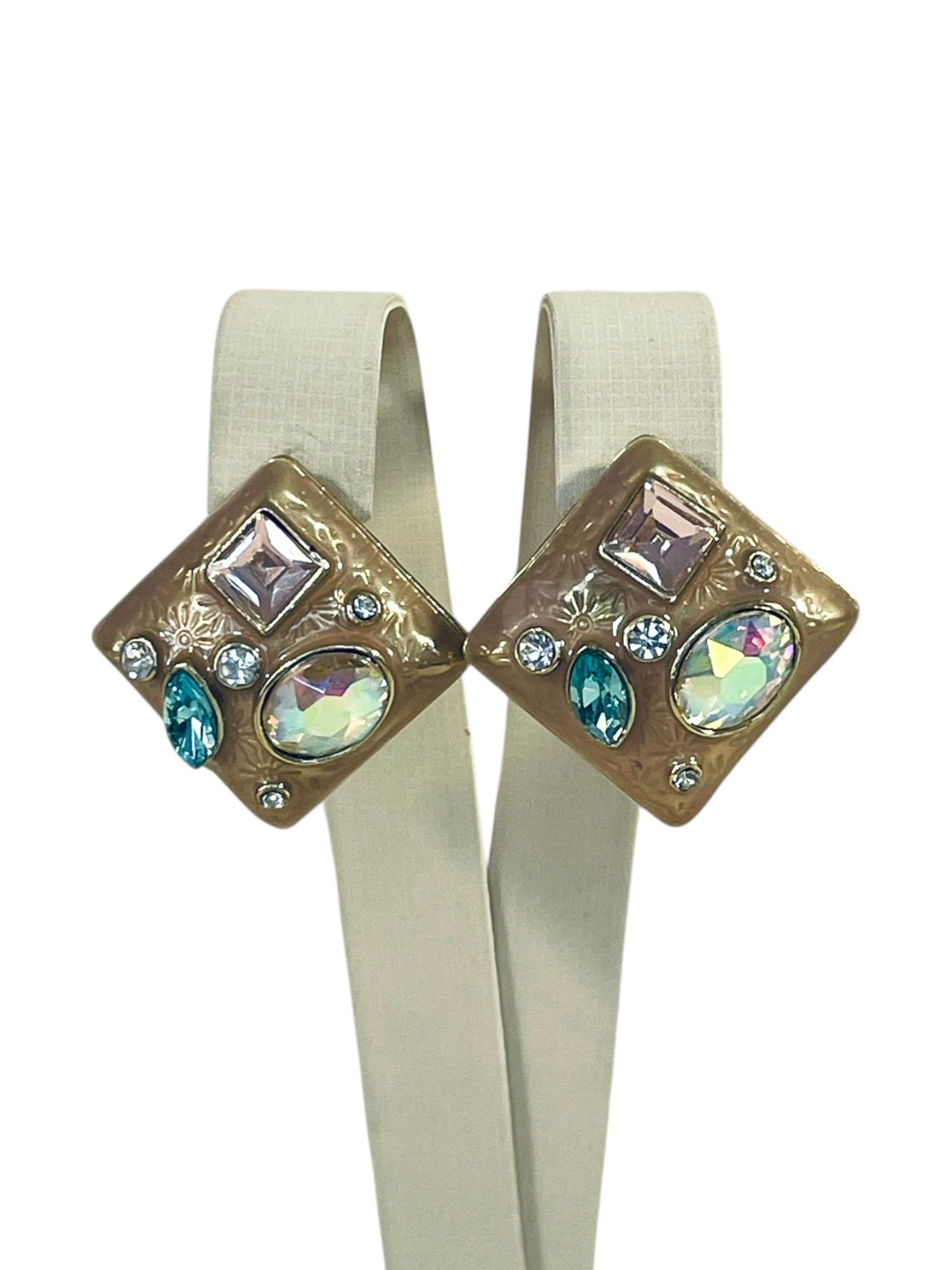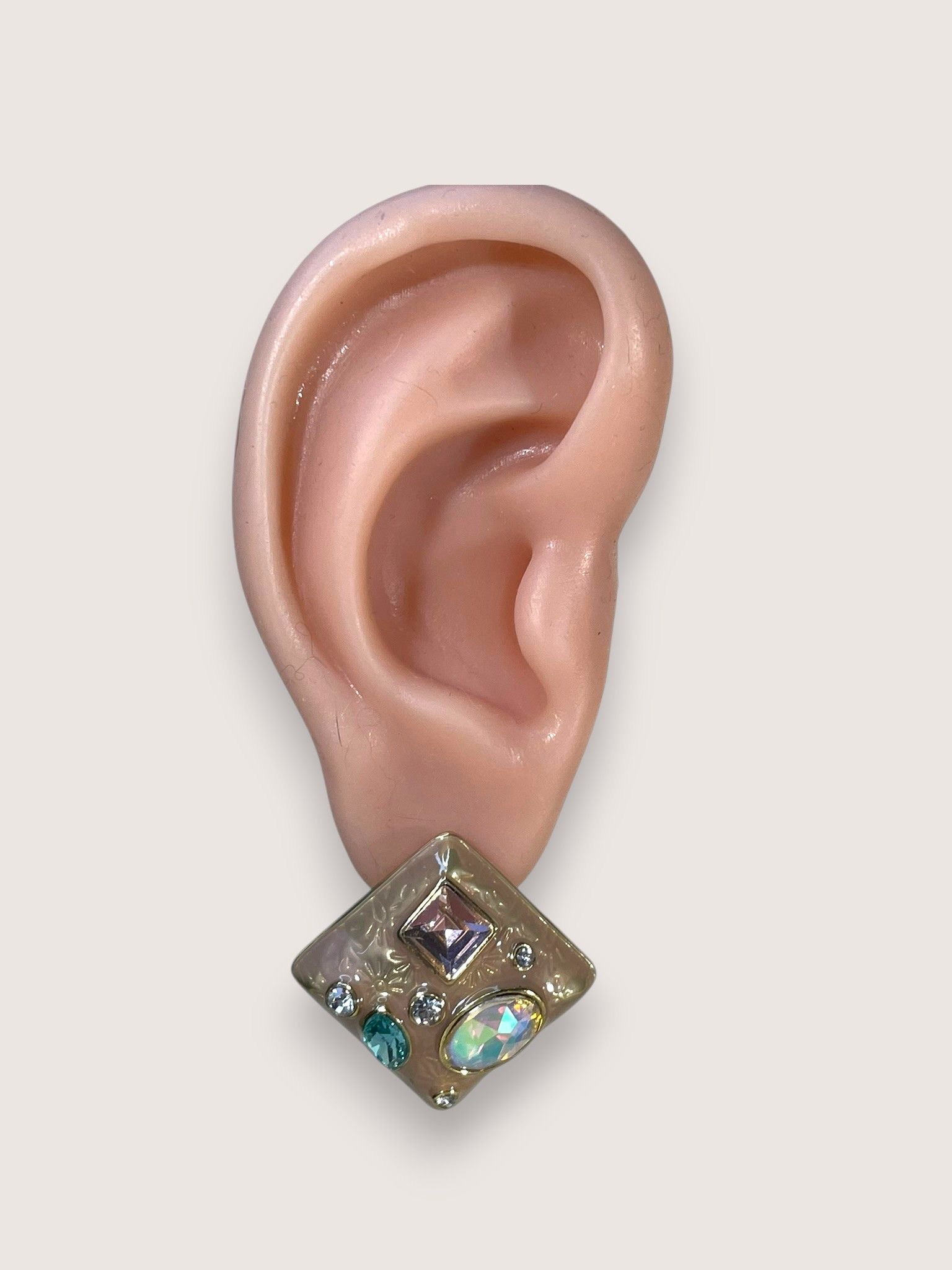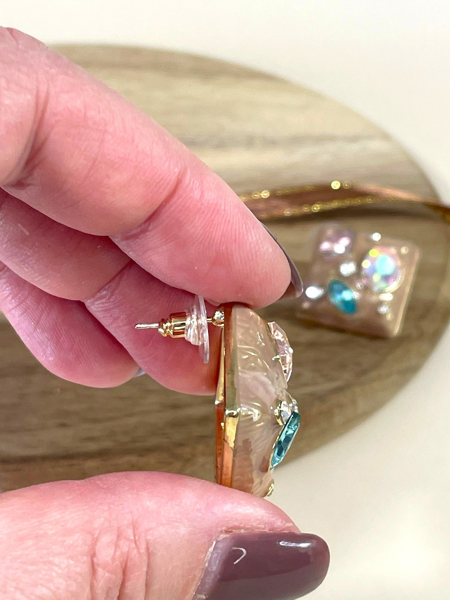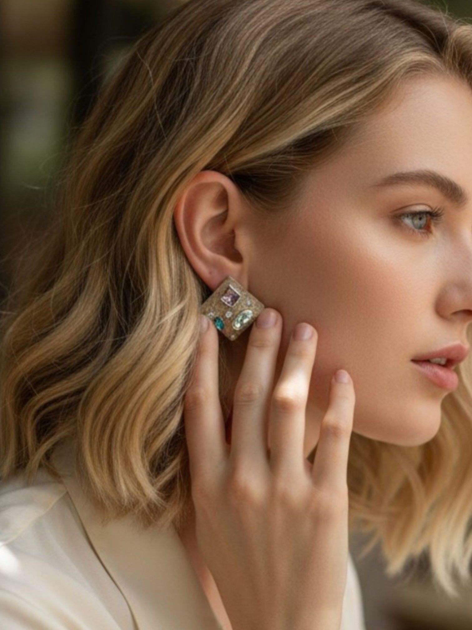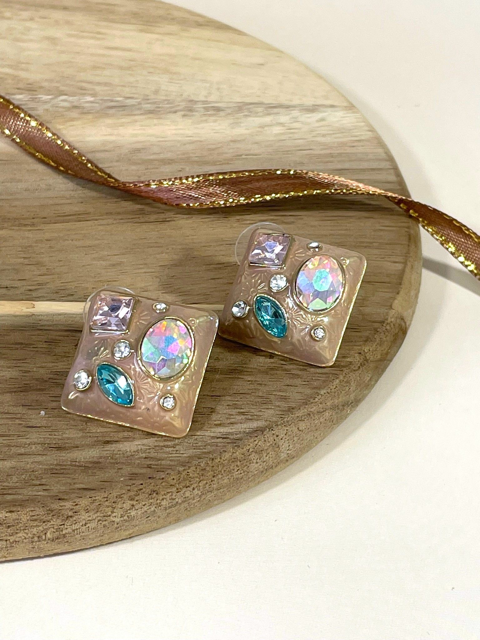 - Форма: квадратная, с слегка скошенными углами, что придаёт серьгам современный и динамичный вид. Композиция страз асимметрична, создаёт ощущение ручной работы и уникальности.