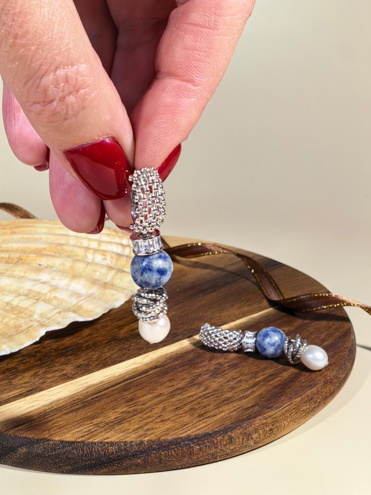 - Центральный элемент — сферическая бусина из натурального содалита глубокого сине-фиолетового оттенка с природными прожилками. Содалит придаёт украшению загадочность и элегантность.