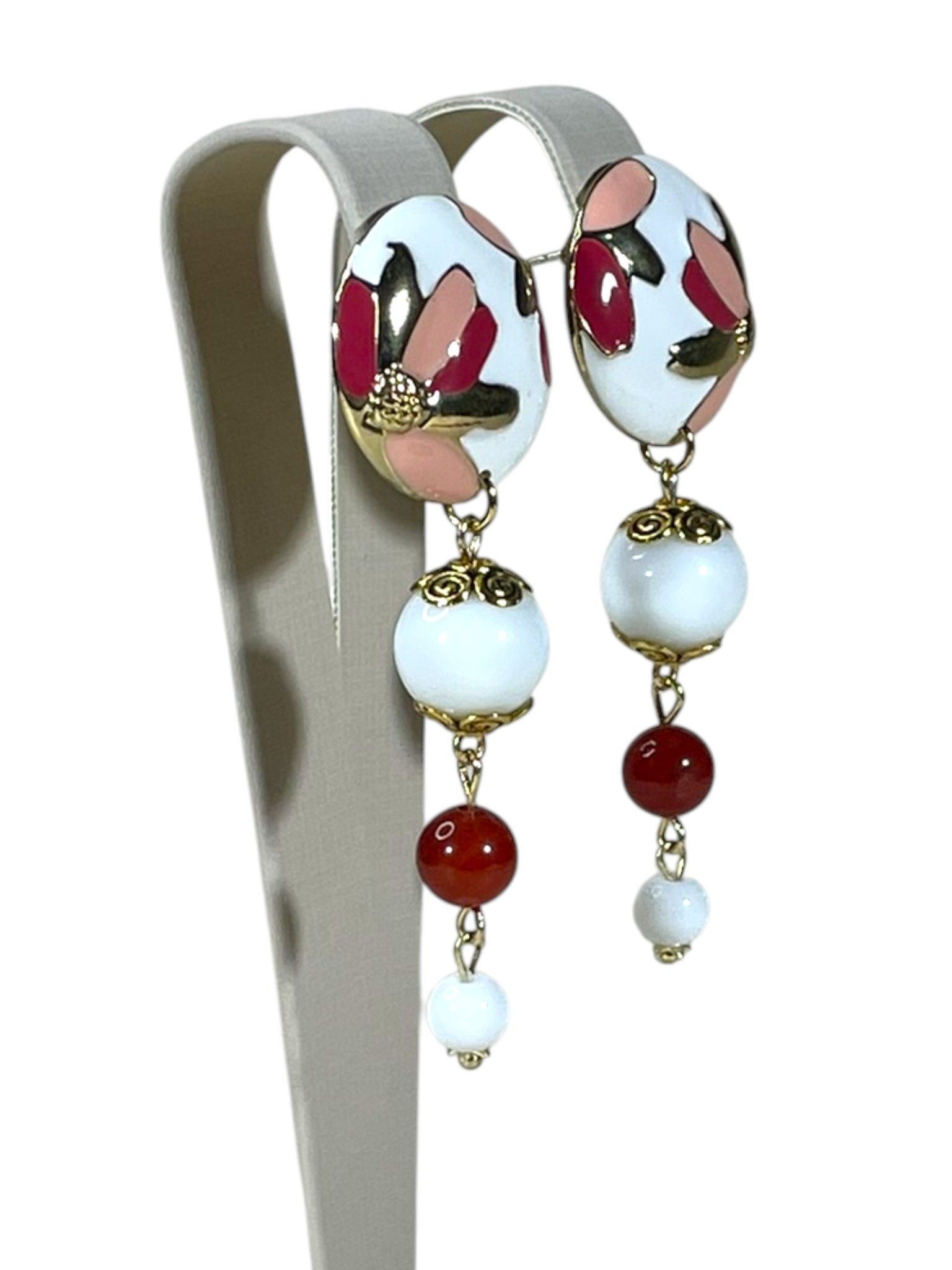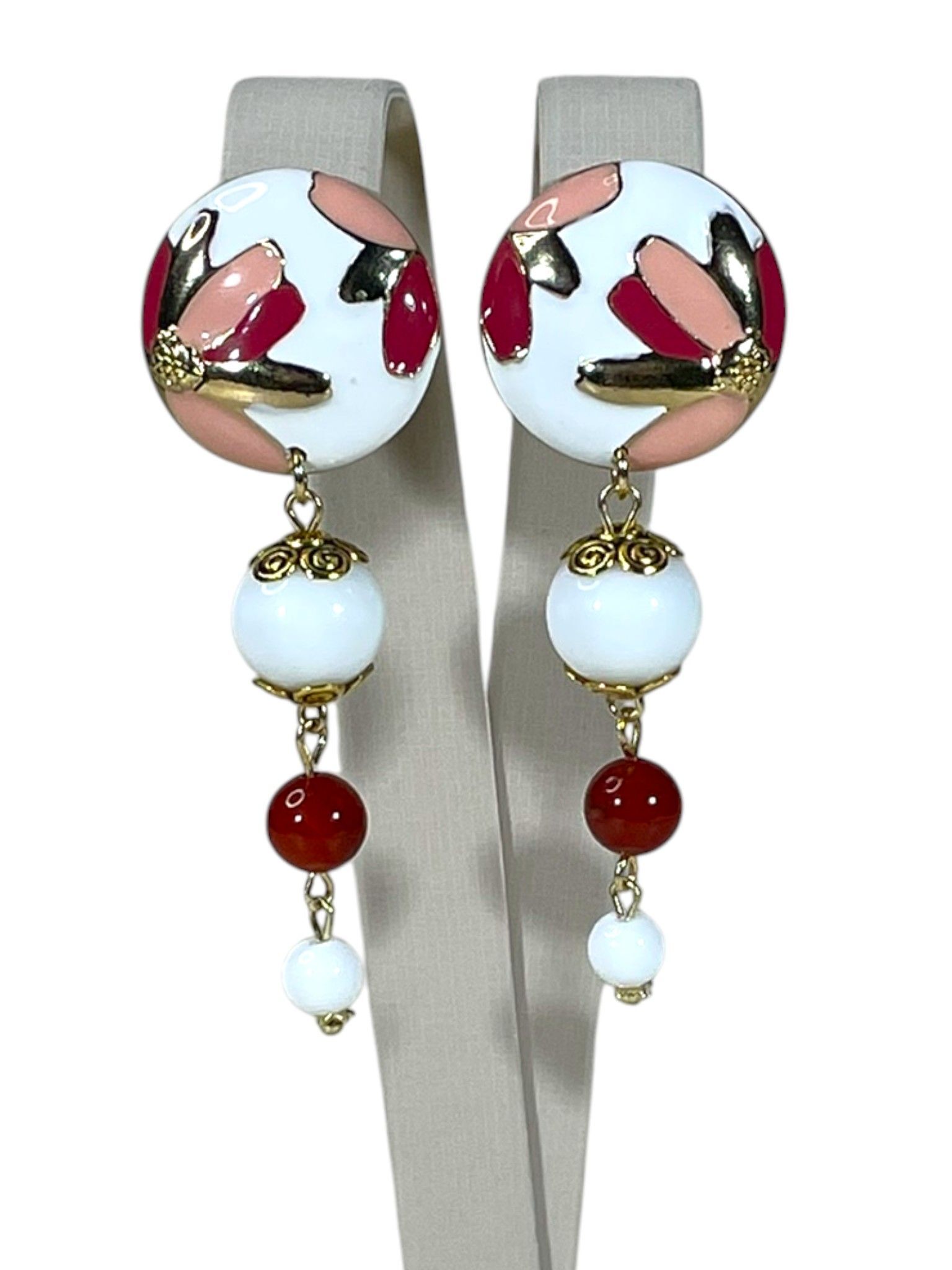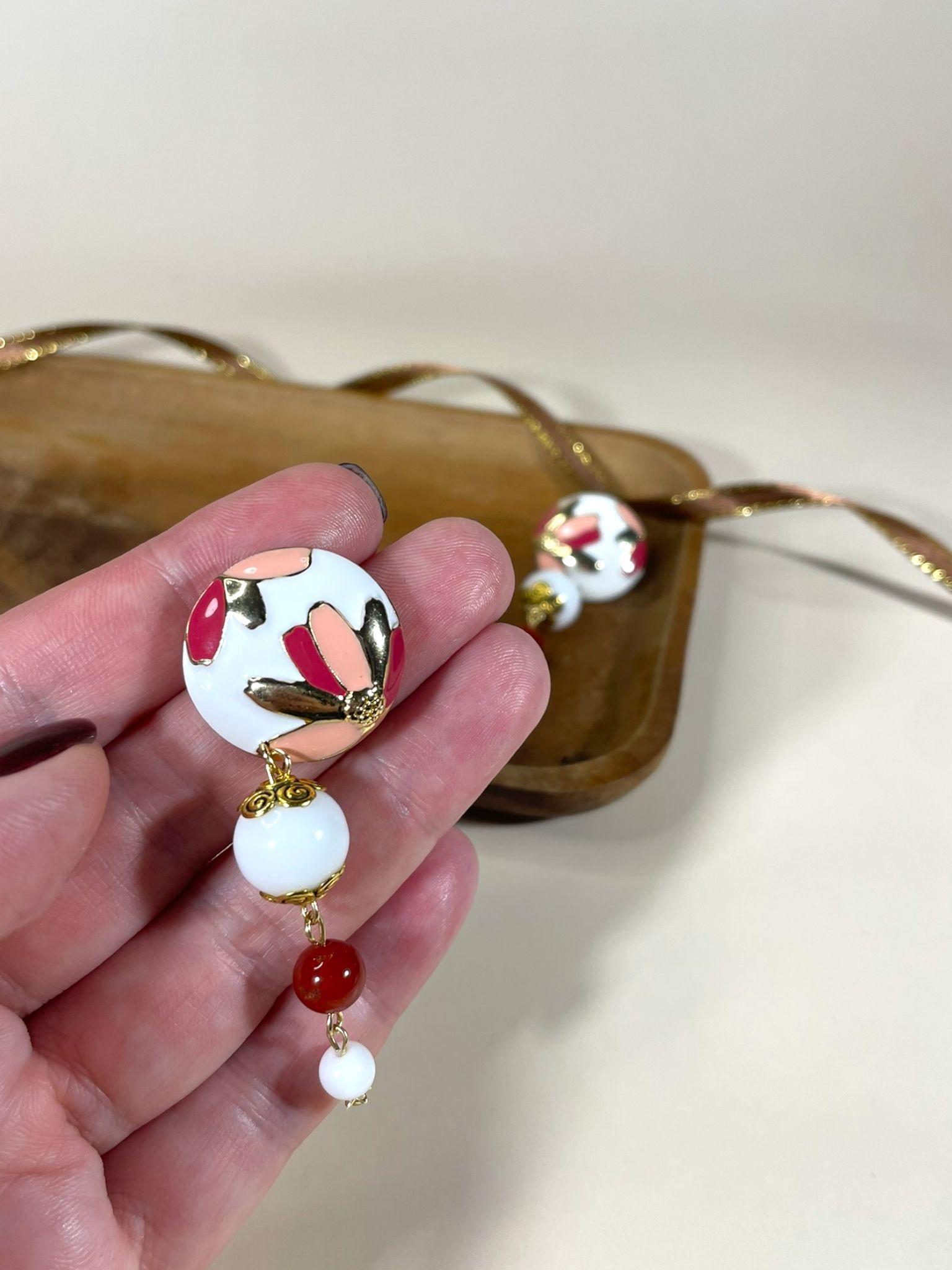 Особенности: Верхняя часть выполнена в виде крупного элемента круглой формы с художественной эмалью, украшенной нежным цветочным орнаментом в кораллово-белых тонах с золотыми элементами. Эмаль придаёт изделию особую глубину и блеск.