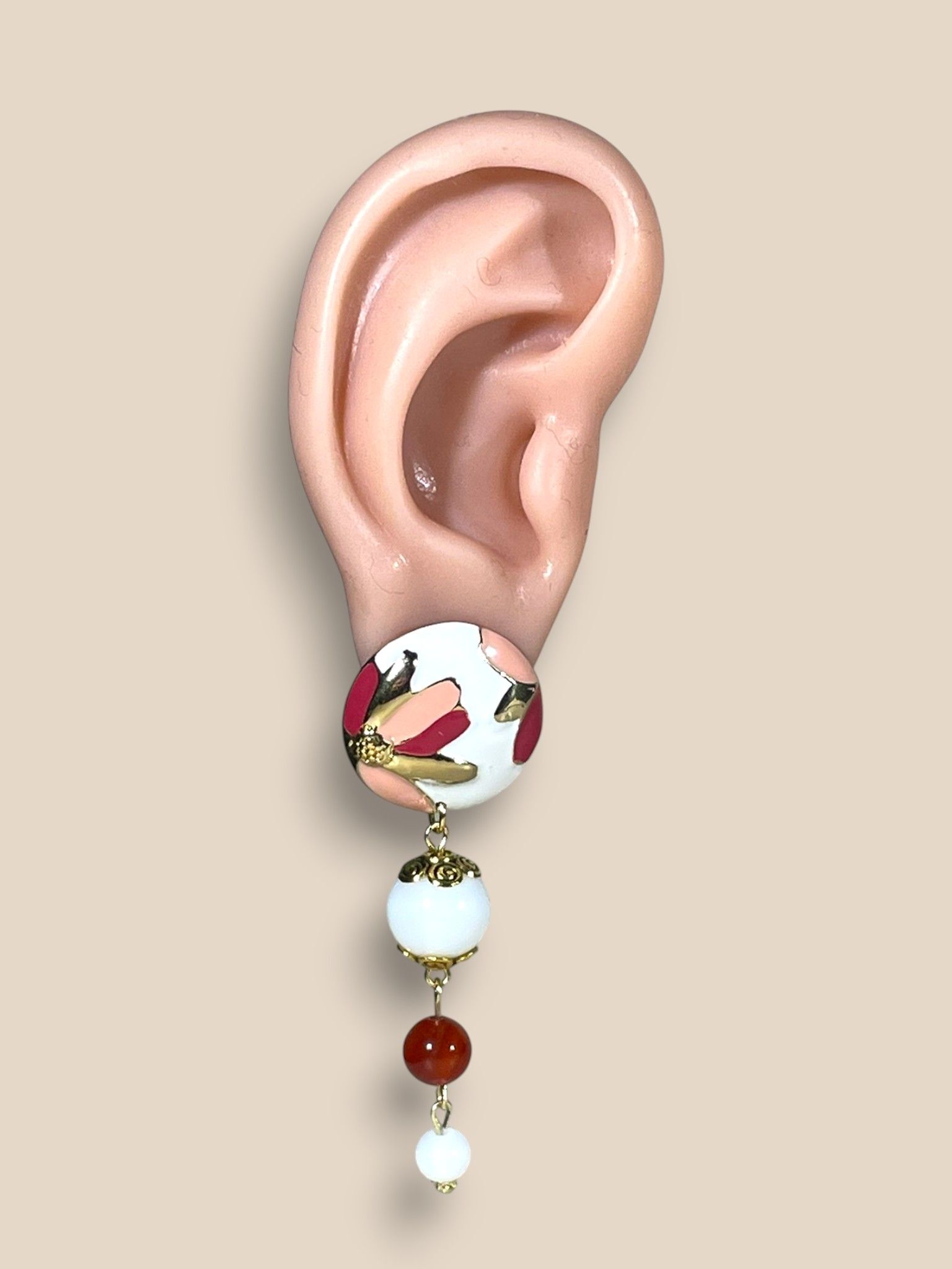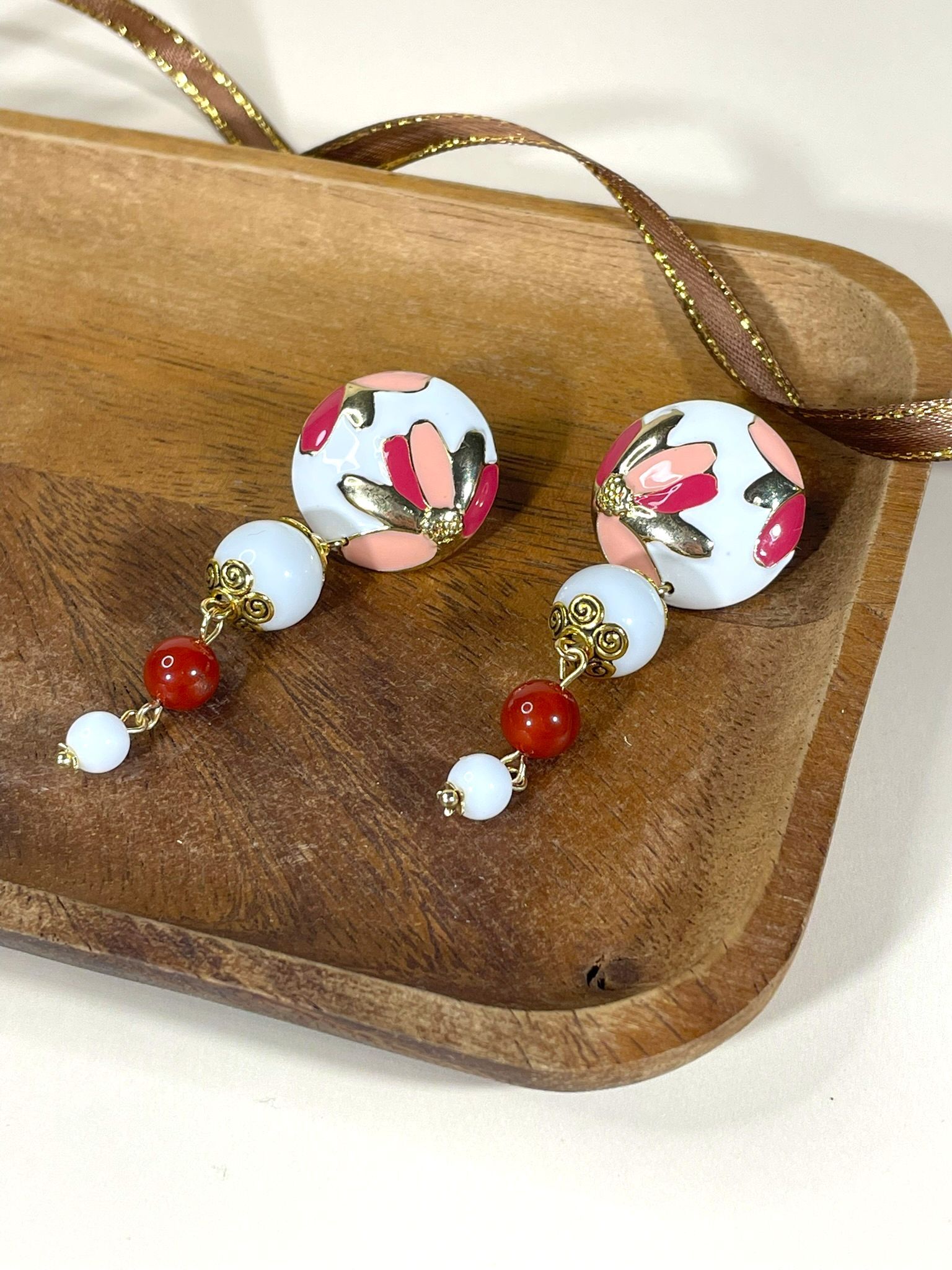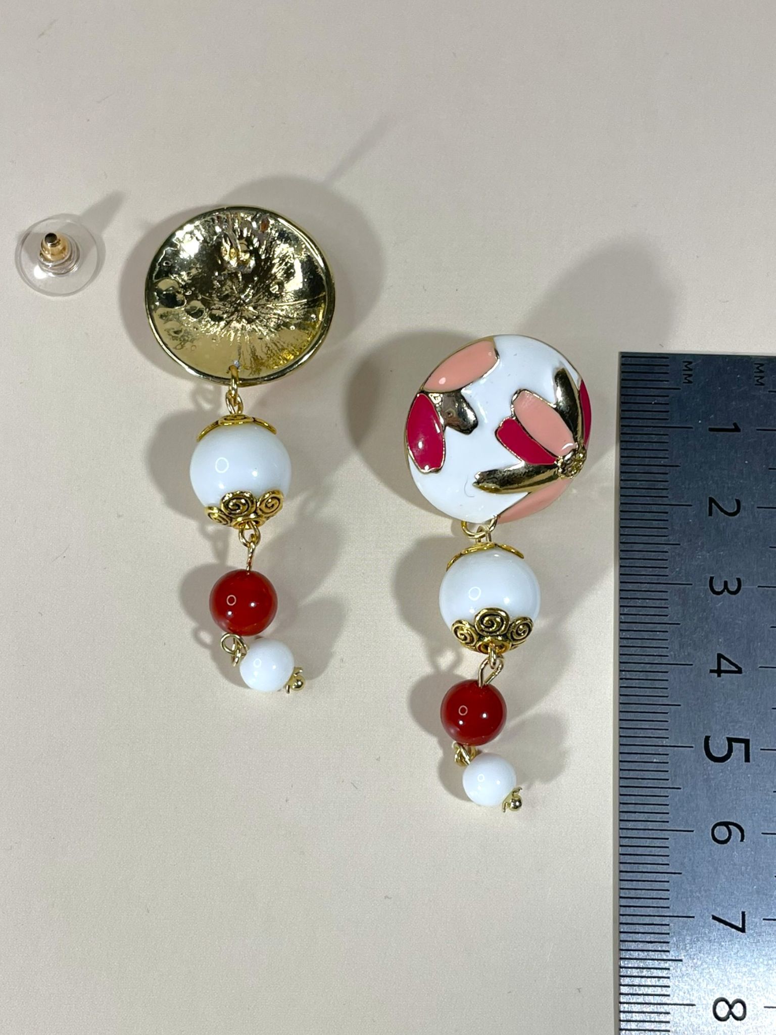 Особенности: Верхняя часть выполнена в виде крупного элемента круглой формы с художественной эмалью, украшенной нежным цветочным орнаментом в кораллово-белых тонах с золотыми элементами. Эмаль придаёт изделию особую глубину и блеск.