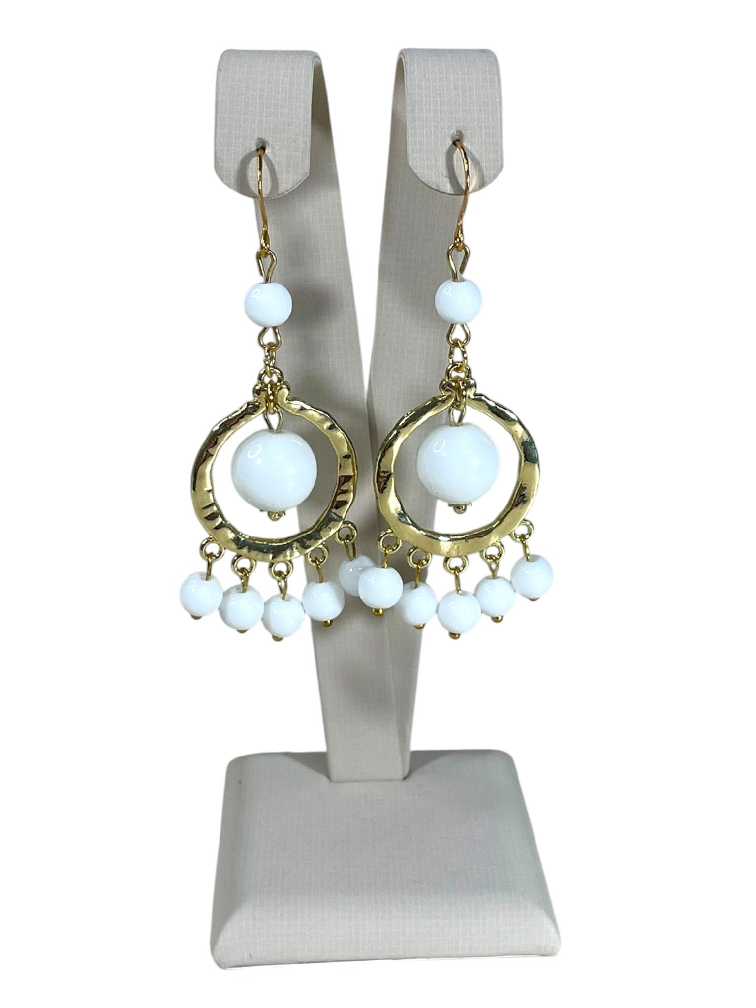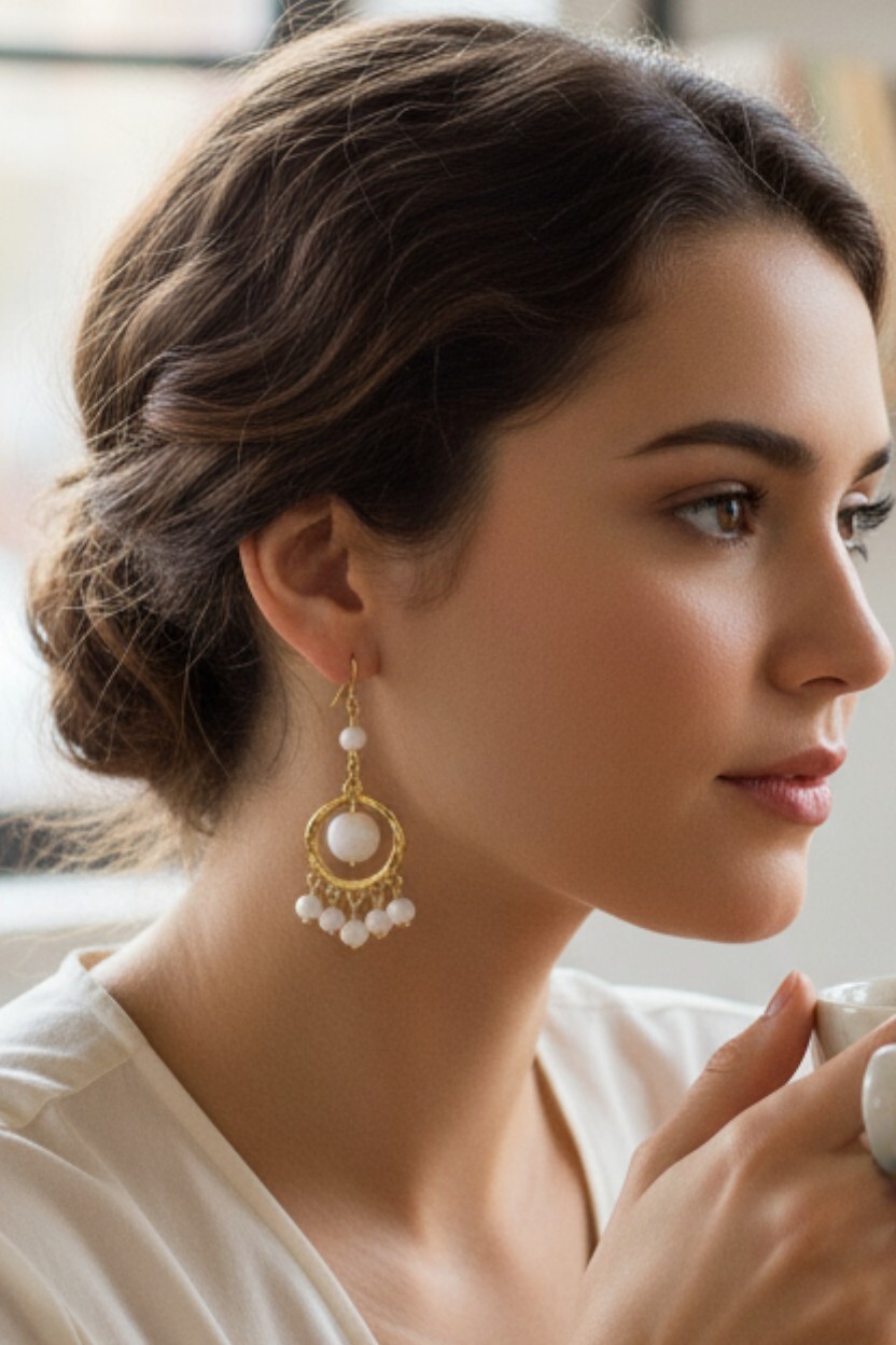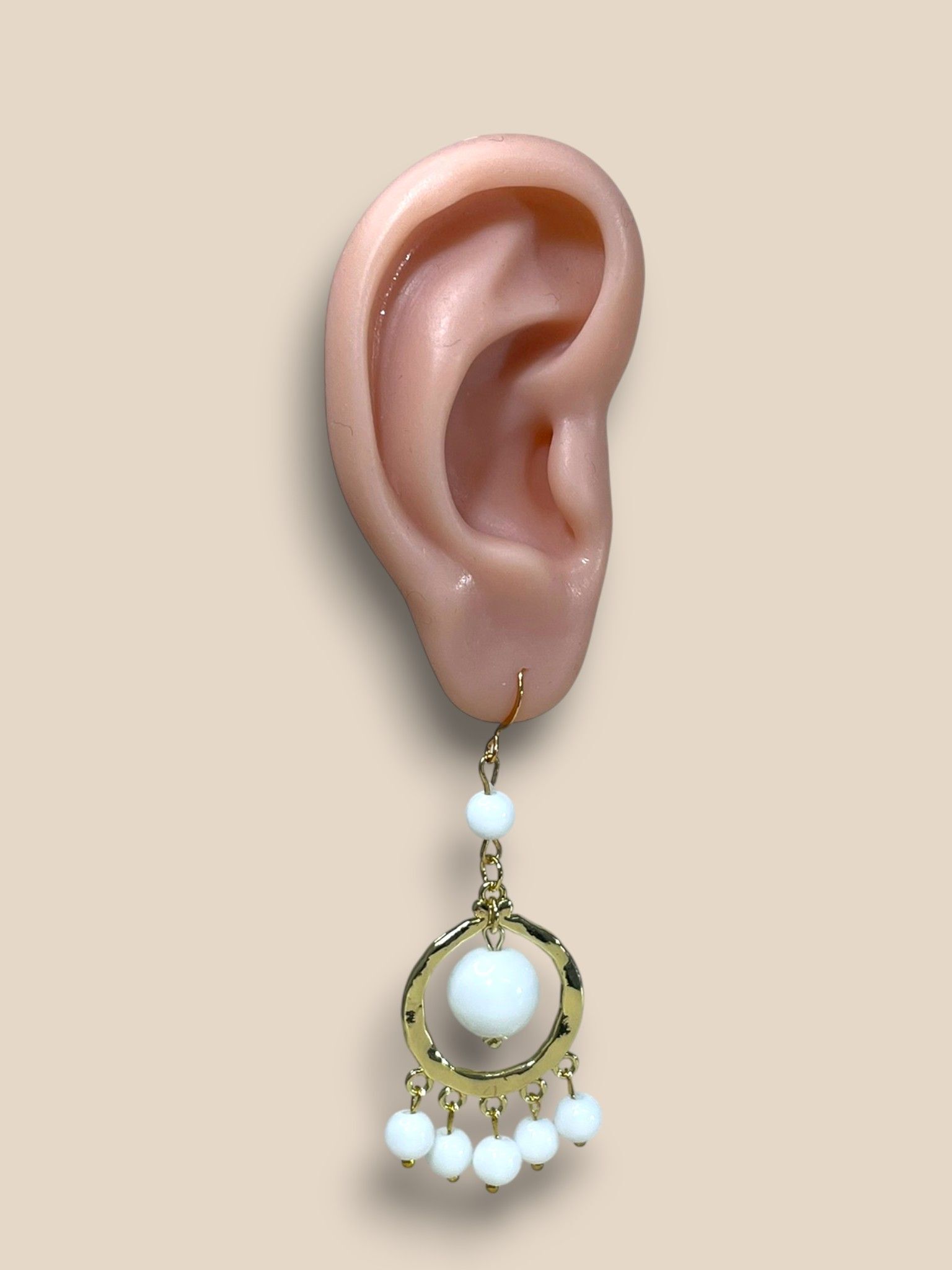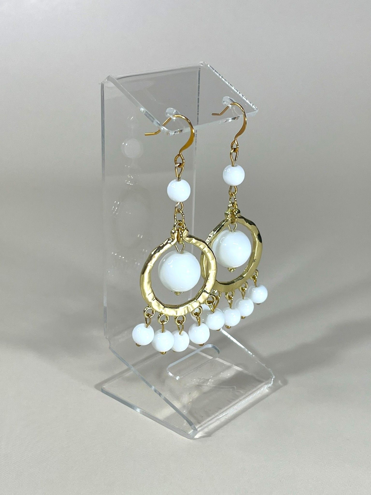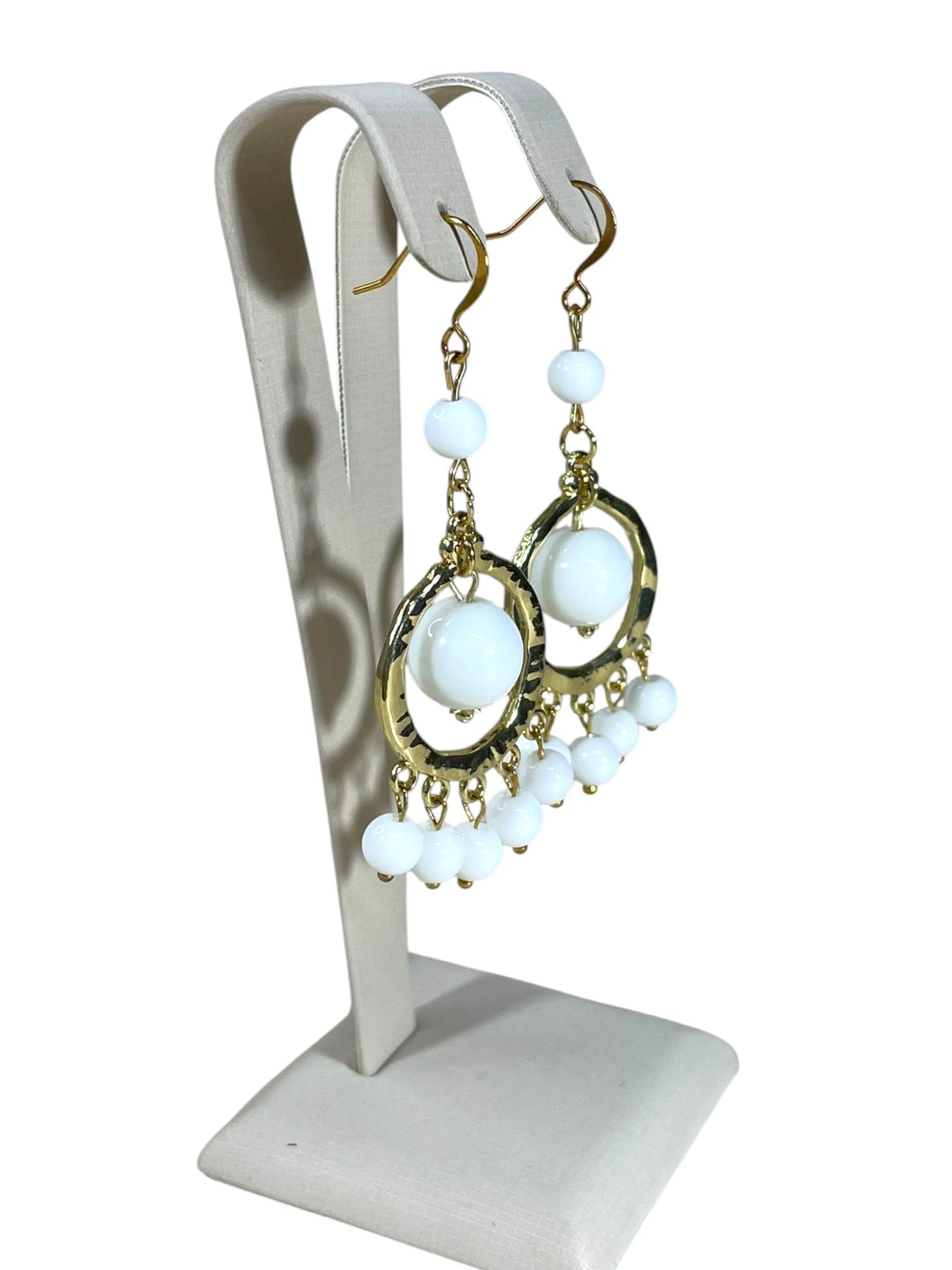 Серьги с белым агатом — это изысканное украшение, которое подчеркнет вашу утонченность и стиль. Основной акцент сделан на крупных круглых бусинах из белого агата, которые гармонично сочетаются с золотистой оправой. Подвески в виде мелких белых агатовых шариков добавляют серьгам легкости и изящества.