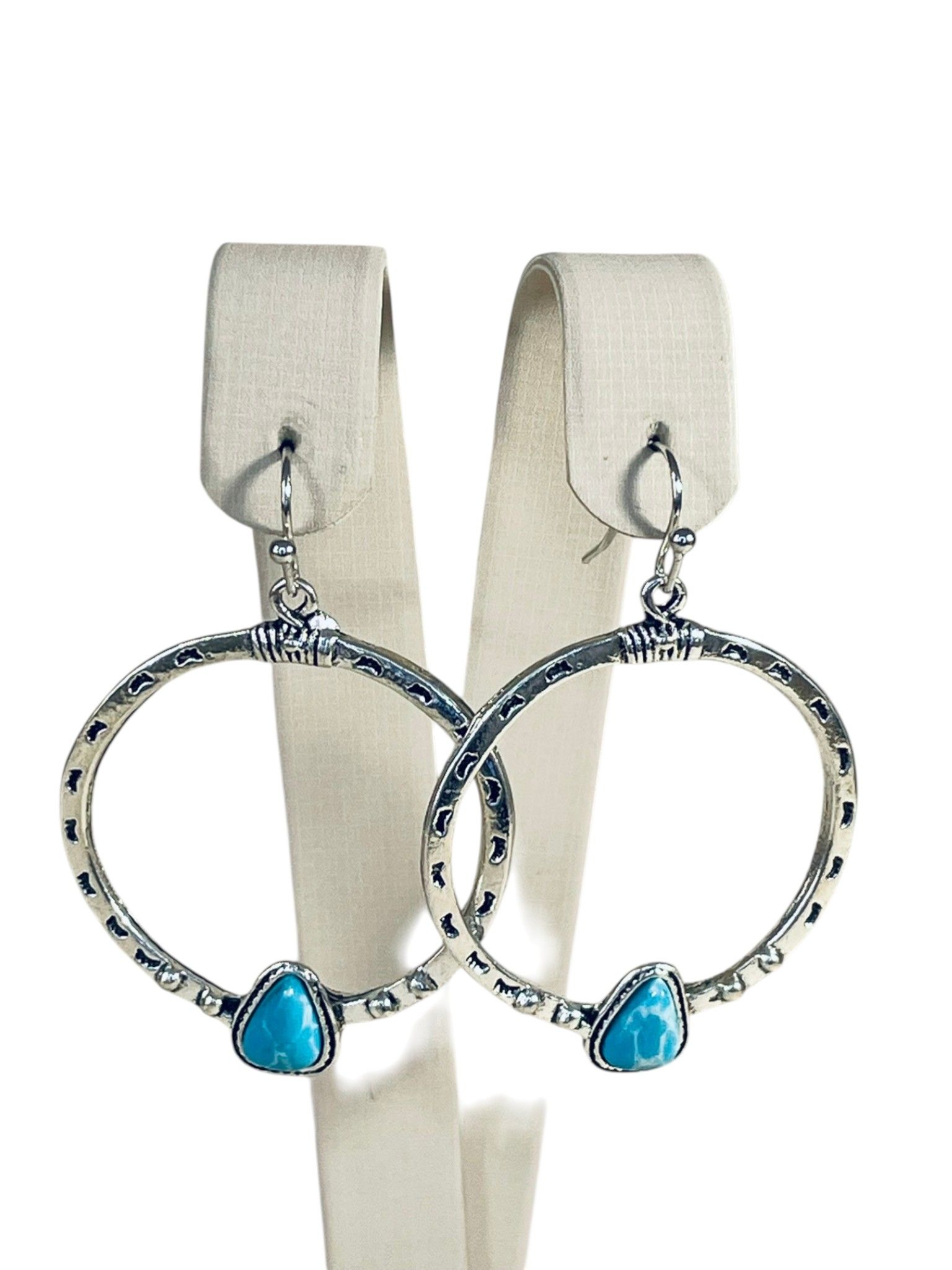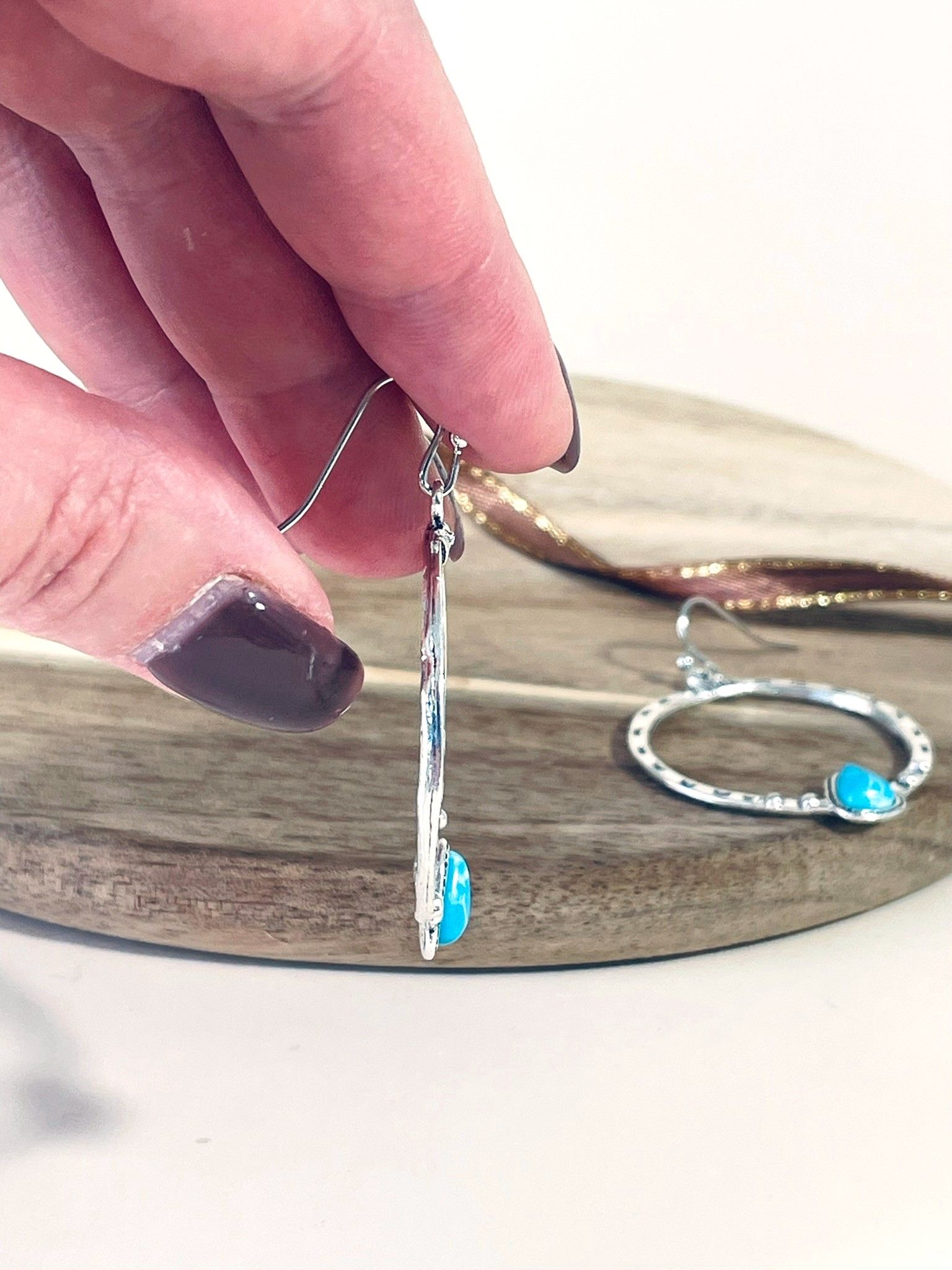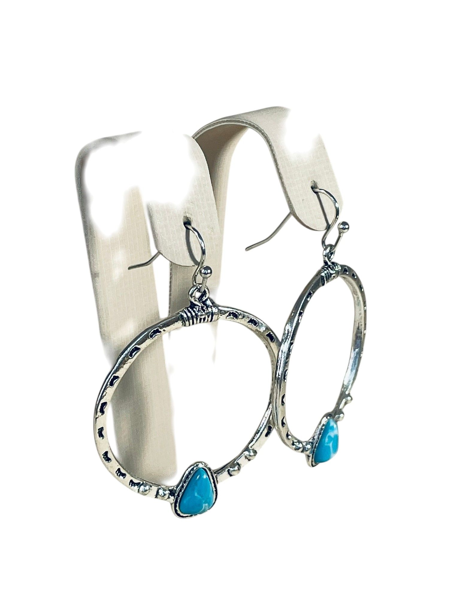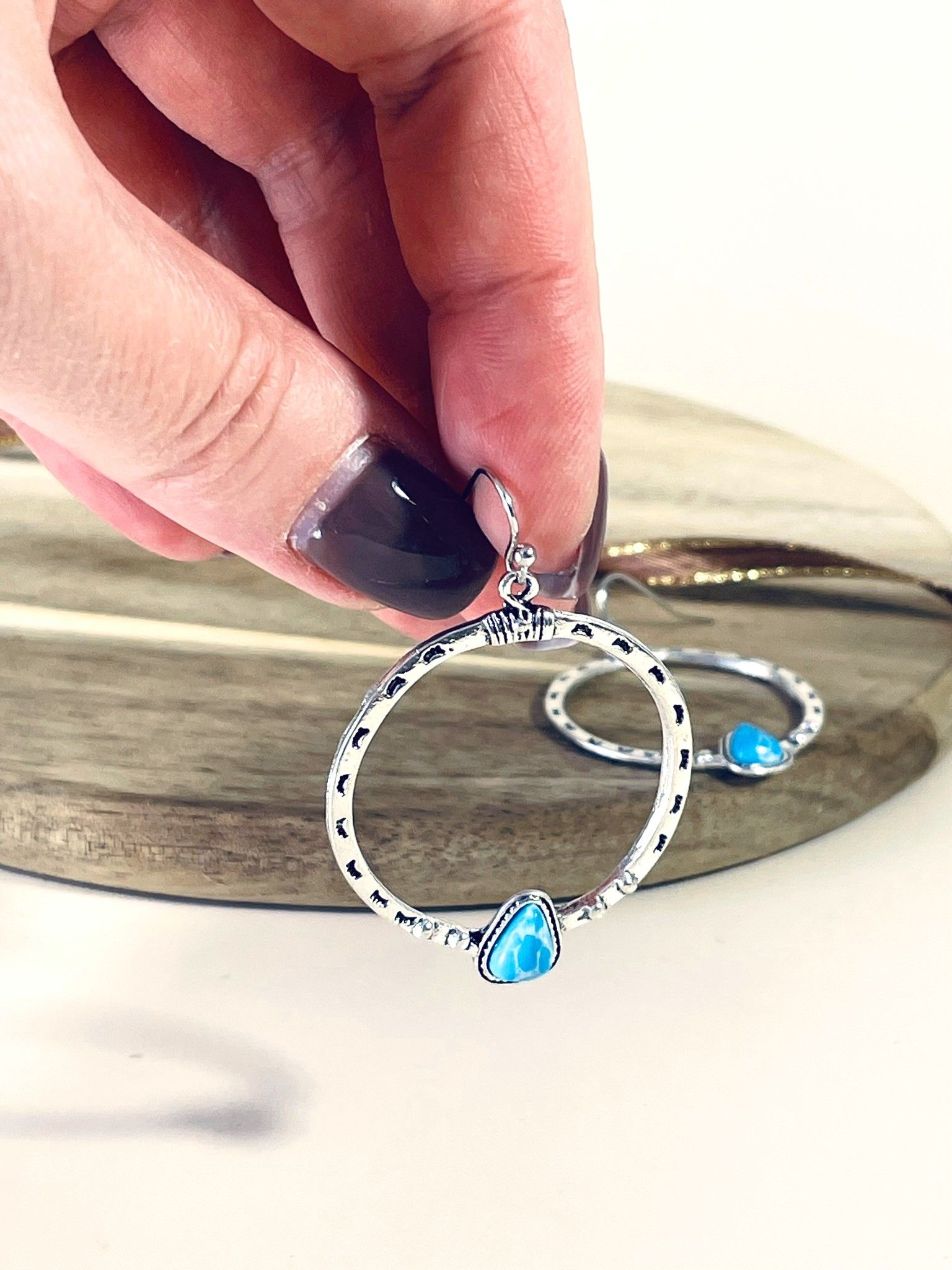 - Форма: крупные кольца с фактурной поверхностью, украшенные треугольными бирюзовыми вставками в нижней части. Кольца имеют слегка чеканную текстуру, что придаёт изделию этнический, бохо-стиль. Треугольные вставки расположены симметрично, подчёркивая баланс и завершённость дизайна.