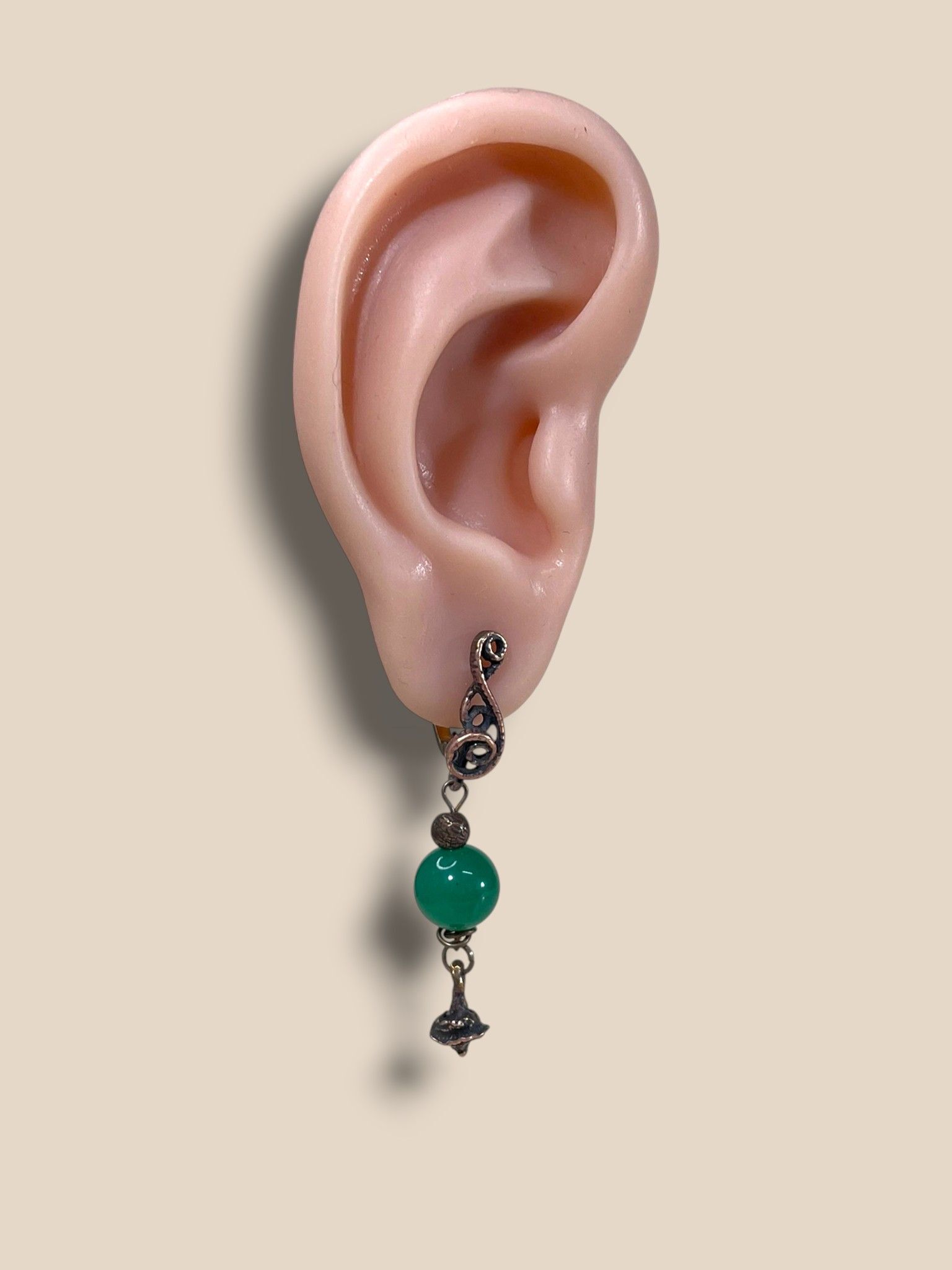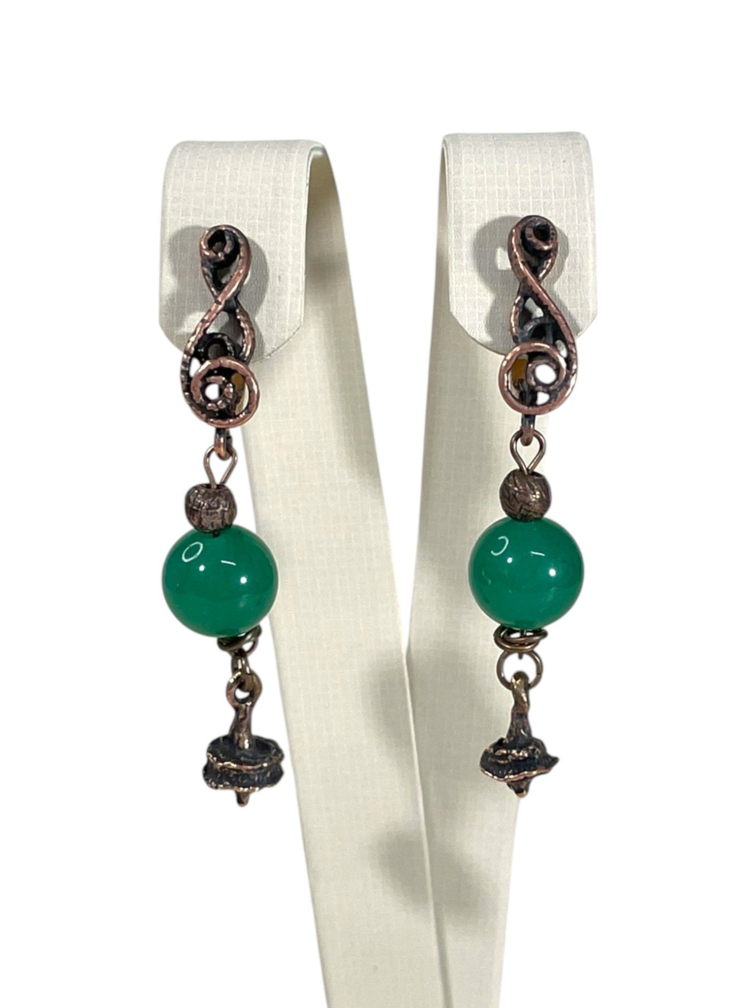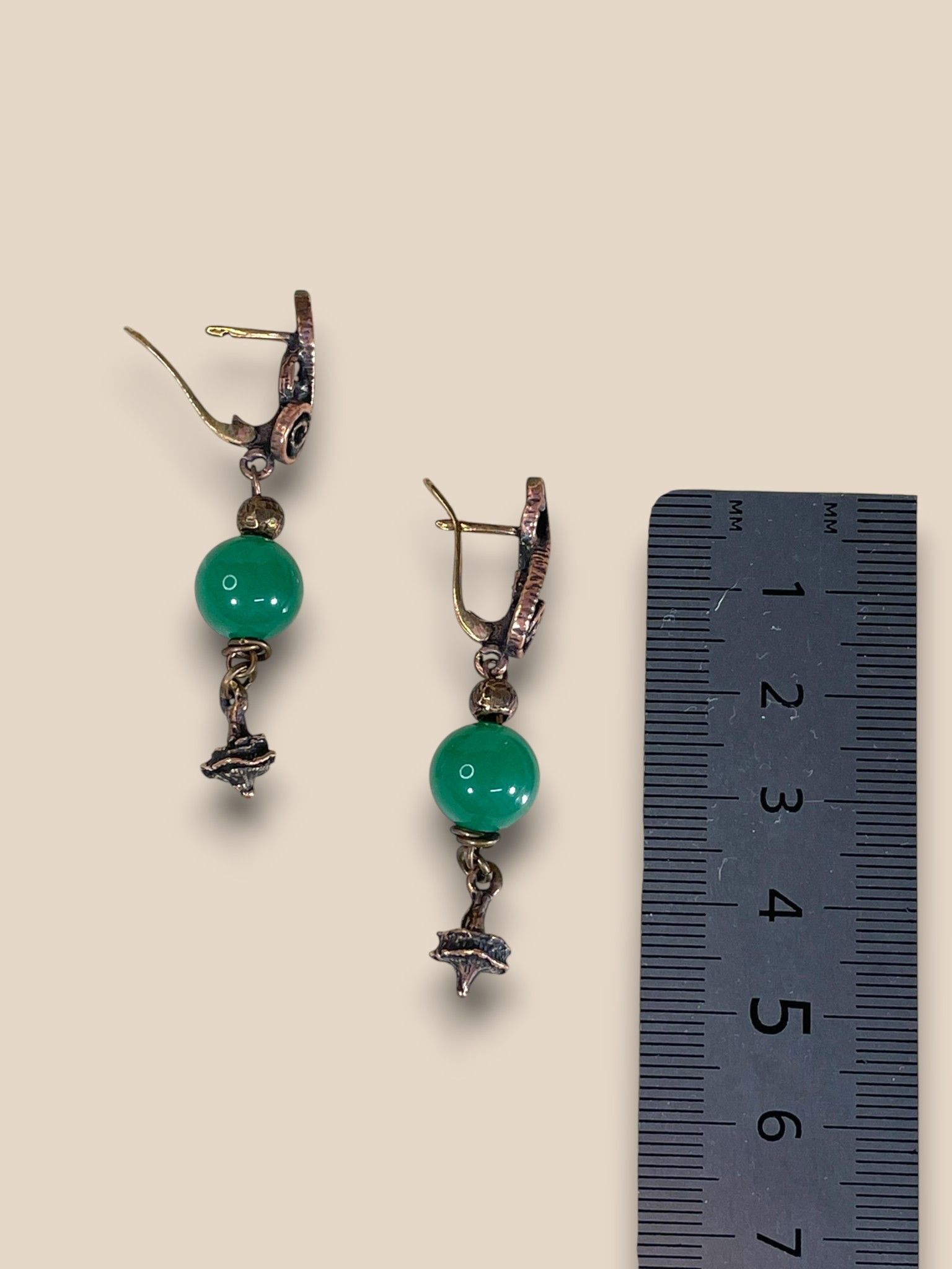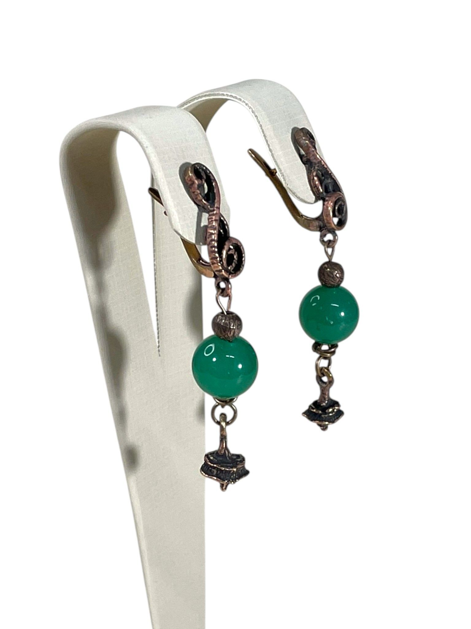 Металлические детали выполнены в винтажном стиле, с изящными завитками и текстурированными подвесками, что добавляет серьгам уникальности.